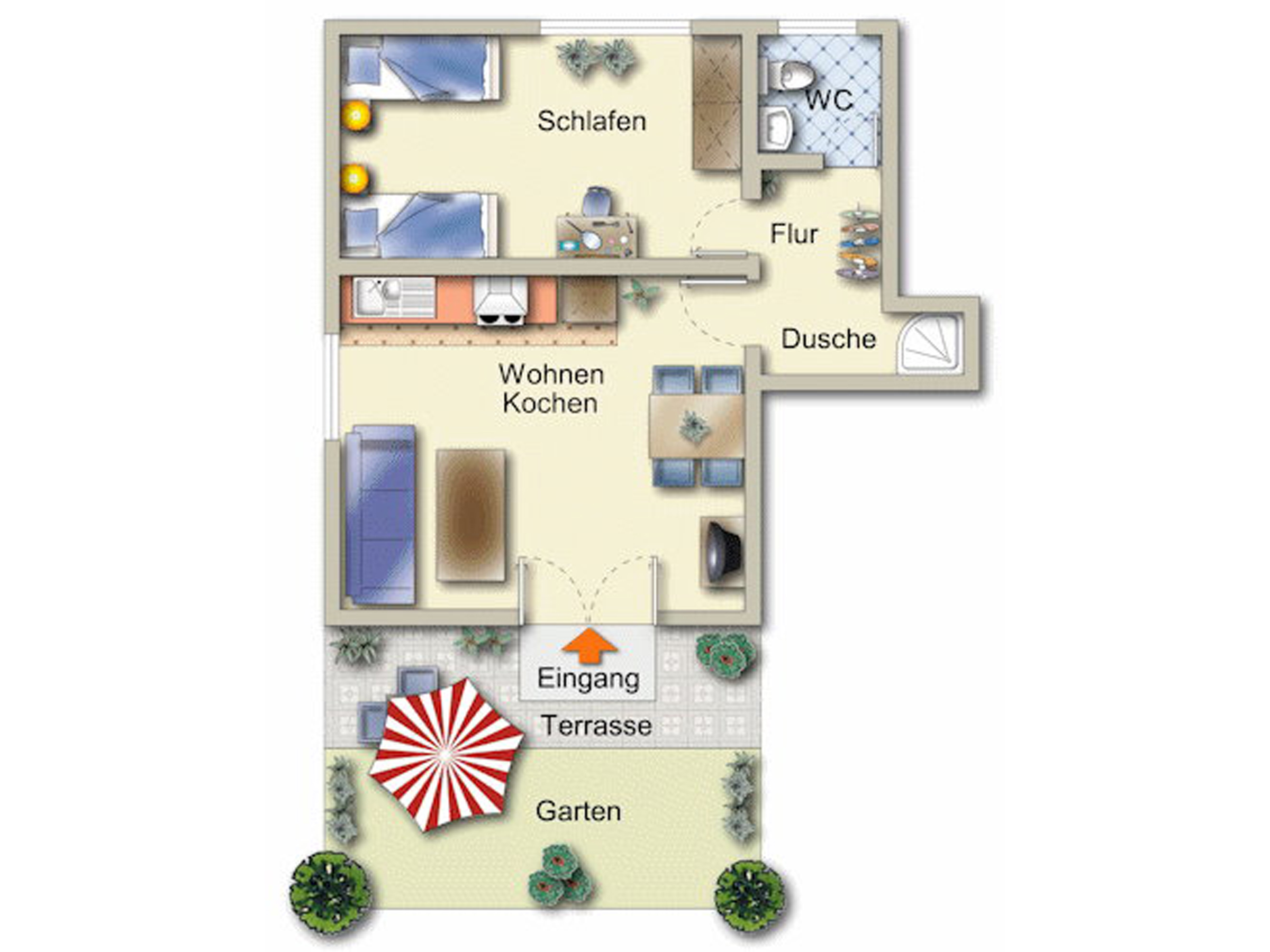 Nichtraucher-Ferienwohnung, bedingt Behindertengerecht, ebenerdiger Eingang über die Terrasse möglich. Wohnküche mit ausziehbarem Schlafsofa, Essecke, SAT-TV und W-LAN. Extra Schlafzimmer mit Doppelbetten (auch getrennt stellbar), extra WC und kleine Diele. Schöne Terrasse mit Liegewiese und Sitzgruppe im Garten mit Grillmöglichkeit.