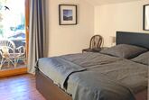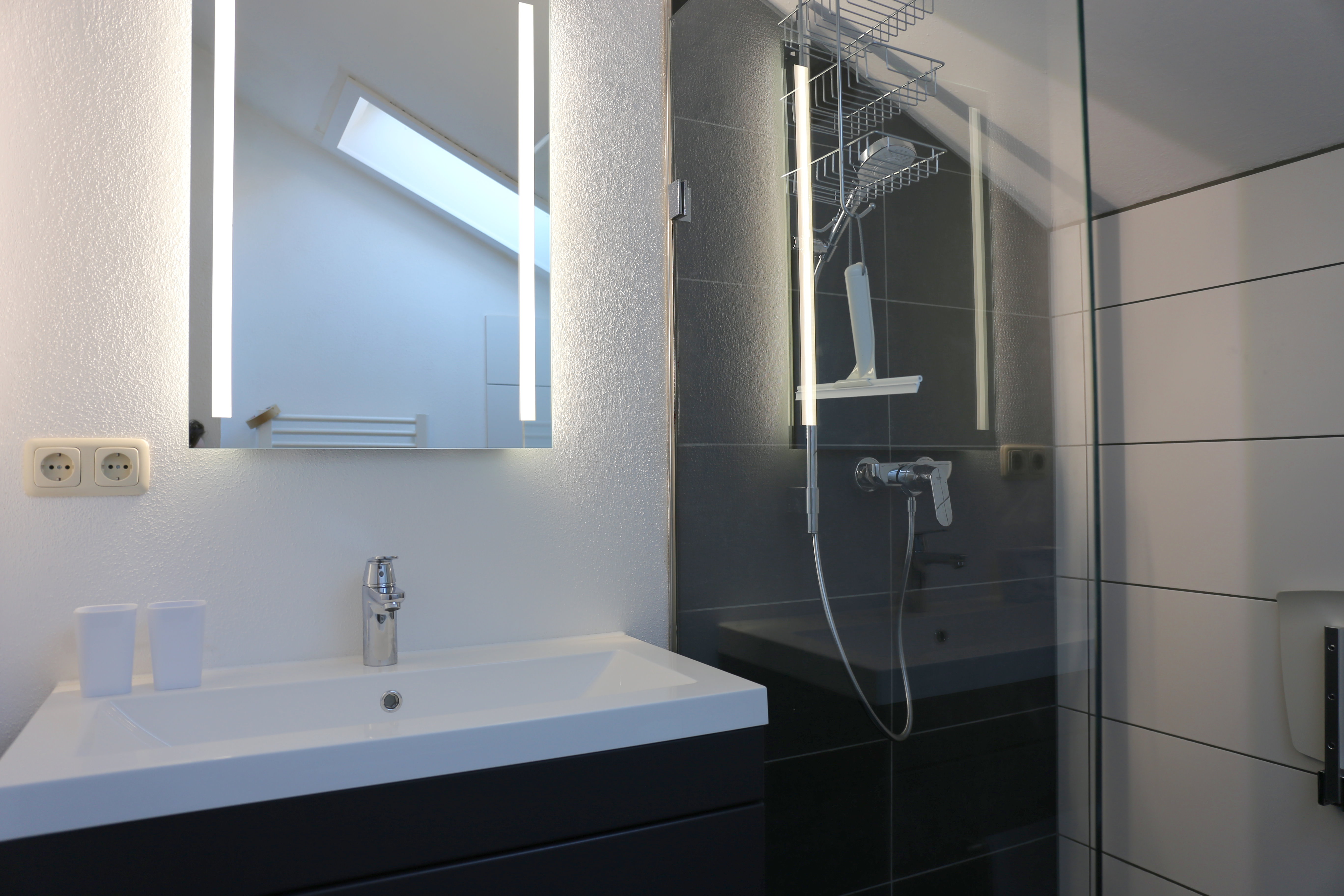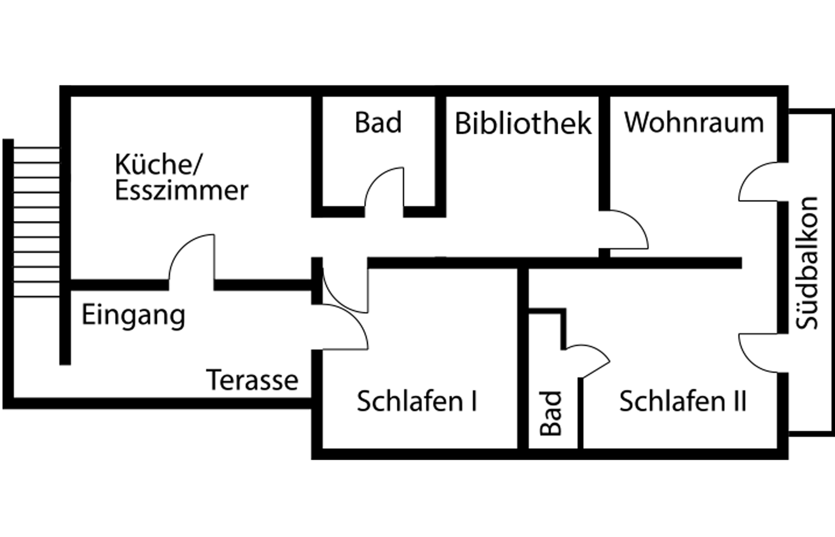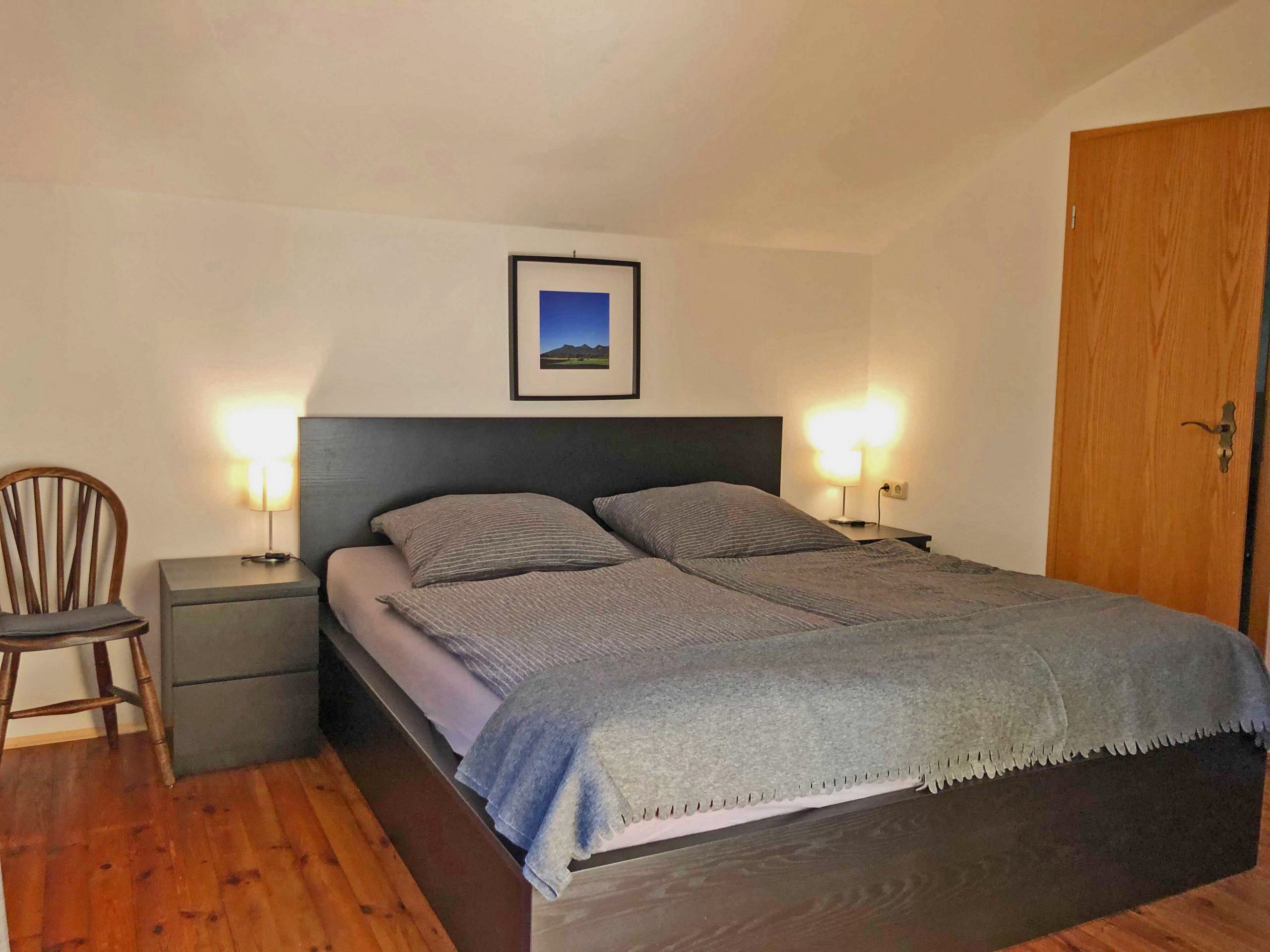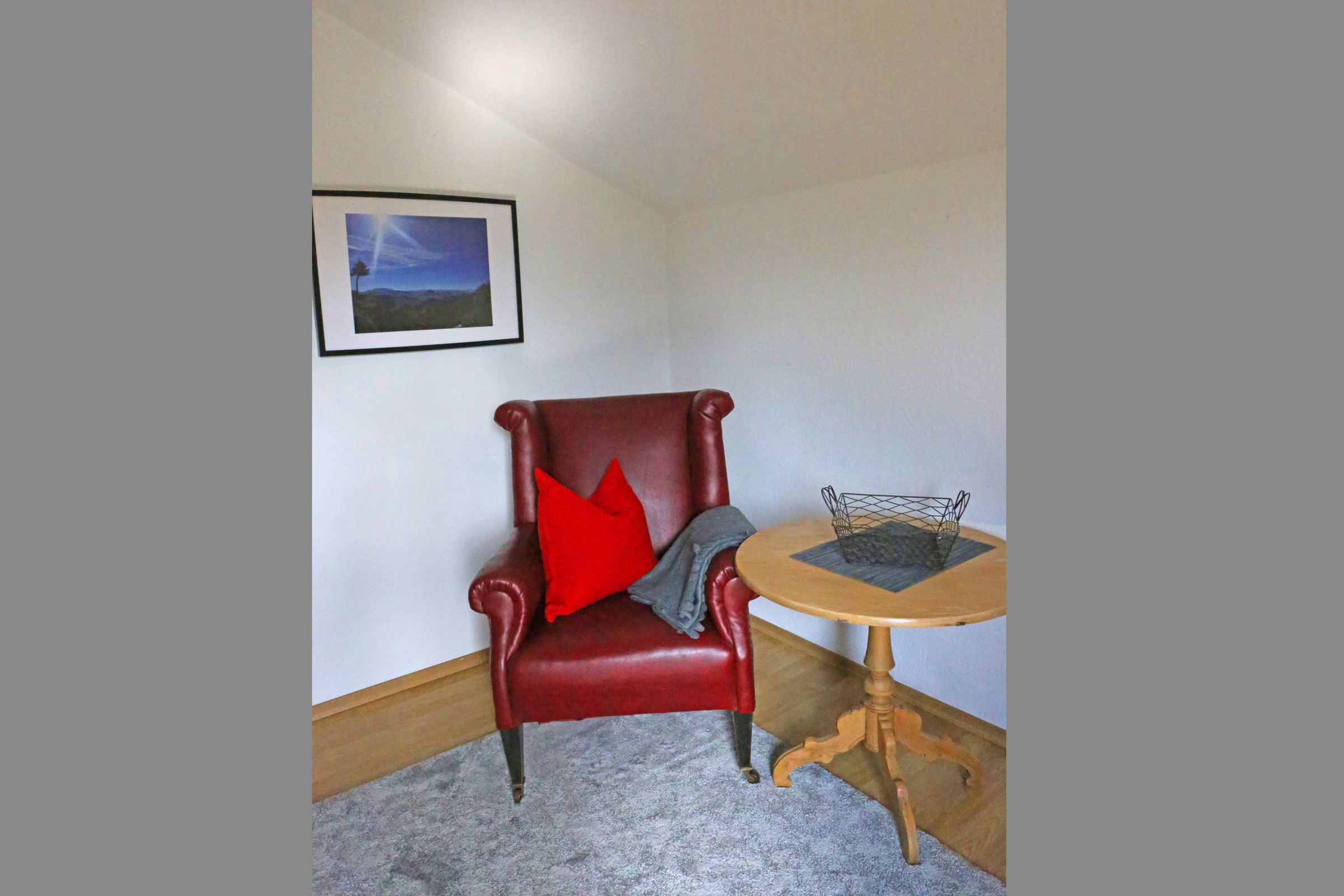 Der Aufgang in die 88 qm Wohnung führt über eine große West-Terrasse mit separatem Wohnungseingang. Die Wohnung verfügt über 4,5 Zimmer mit zwei Bädern, Westterrasse und Südbalkon und erstreckt sich über den ganzen ersten Stock eines Einfamilienhauses. Küche mit Vollausstattung, wie Kühl- und Gefrierschrank, Spülmaschine, Herd mit Backofen und Ceranfeld, Mikrowelle mit Mikrowellengeschirr, Nespresso Kaffeemaschine, Filterkaffeemaschine, Toaster, Wasserkocher und inklusive aller notwendigen Kochutensilien, einem großzügig gestalteten Essbereich sowie einem gemütlichen Ohrensessel zum Relaxen. Ein kleiner weiterer Raum, welcher als Bibliothek dient, lädt zum Entspannen ein, und verfügt über eine angenehme, entspannende Sitzgelegenheit. Wohnzimmer mit ausziehbarer Schlafcouch, Schwedenofen, Flachbild TV, kostenloses WLAN und direkter Zugang auf den Südbalkon. Zwei Schlafzimmer mit Doppelbetten: 1 x 2,00 m x 2,00 m und im zweiten 1,80 m x 2,00 m. Ein großes Bad mit Dusche, Duschsitz, WC und ein kleineres Bad beim zweiten Schlafzimmer mit Dusche/WC und Waschbecken. Bettwäsche und Handtücher sind vorhanden. Starterset für unsere Gäste: Kaffeekapseln, Tee, Zucker, Öl, Essig, Salz, Pfeffer, Toilettenpapier und Seife. Elektrogrill, Parkplatz direkt vor dem Haus, Garage für Abstellen der Räder, Garage auch separat anzumieten für Autounterbringung.