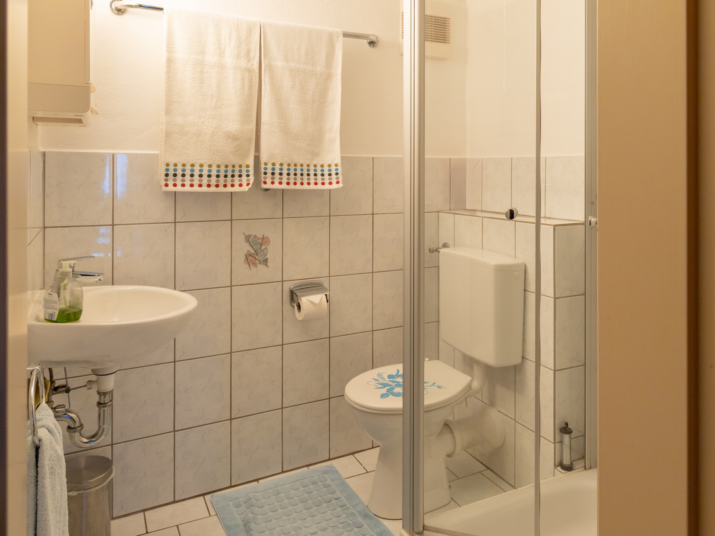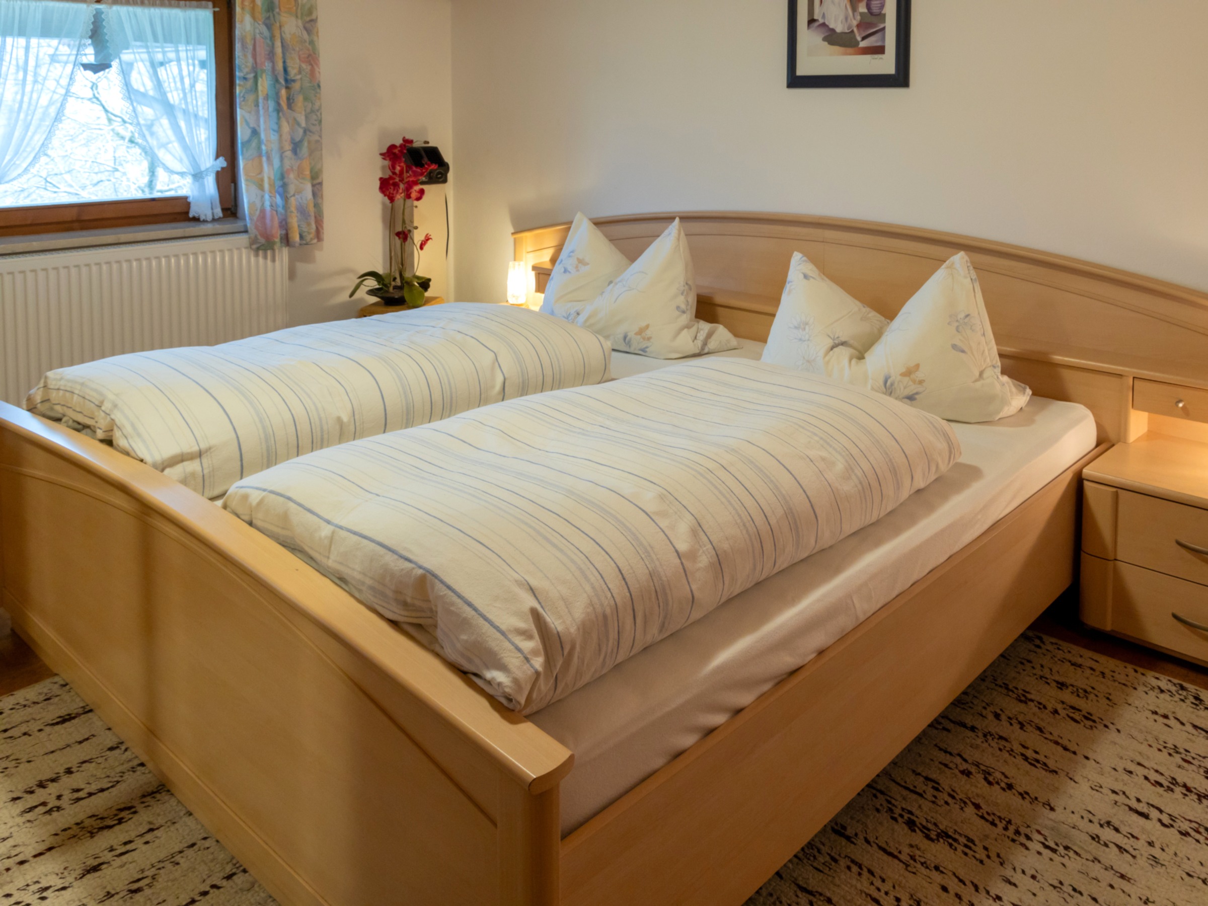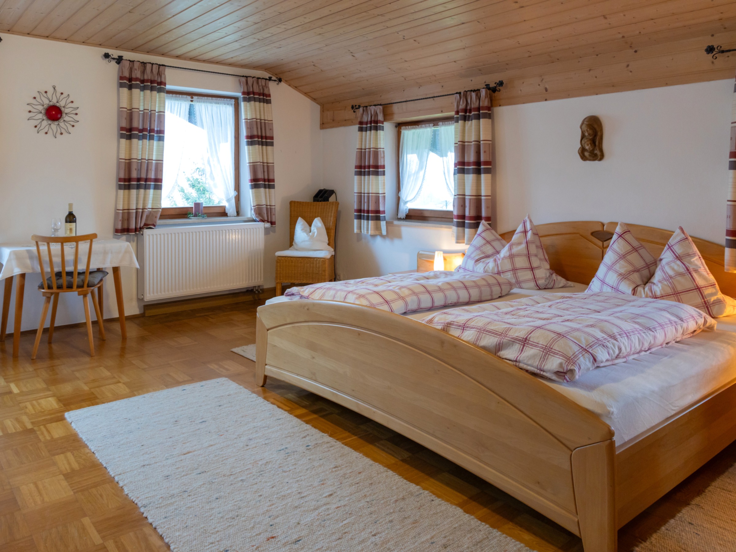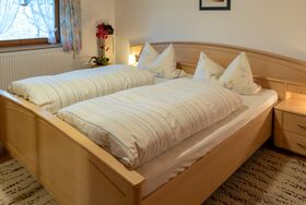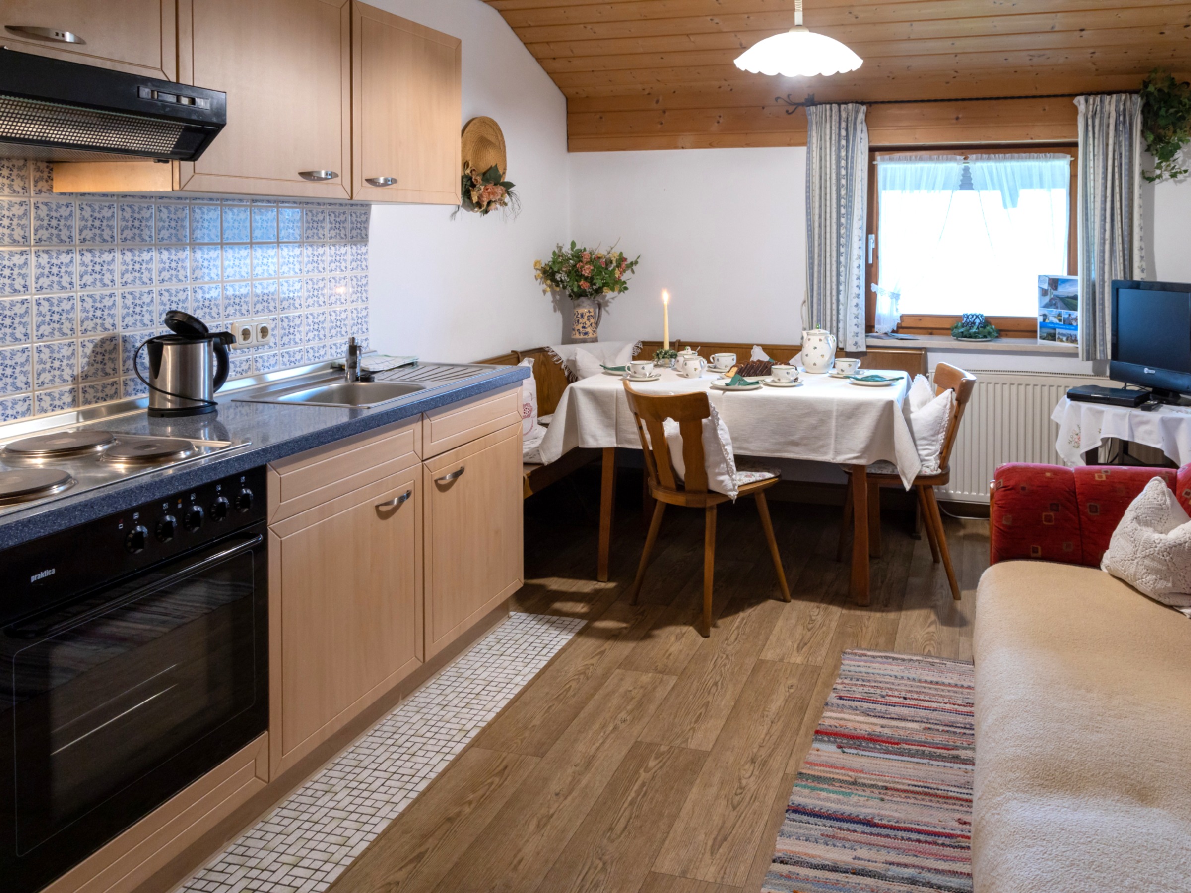 Die Ferienwohnung Bergblick (50 qm) für 2-5 Personen verfügt ebenfalls über zwei gemütliche Schlafzimmer, Dusche und WC, eine geräumige Wohnküche sowie einen Balkon. Bettwäsche und Handtücher inklusive. Die Ferienwohnungen Bergblick & Wiesenblick sind keine abgeschlossenen Wohnungen, sondern haben einen gemeinsamen Flur. Haustiere sind in der Wohneinheit nicht gestattet. Die Küche in Fewo Wiesenblick sowie die Küchenzeile in Fewo Bergblick sind komplett ausgestattet: Kaffeemaschine, Wasserkocher, Toaster, Töpfe, Geschirr, Teller, Besteck... alles was man zum Kochen und Essen benötigt.