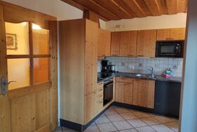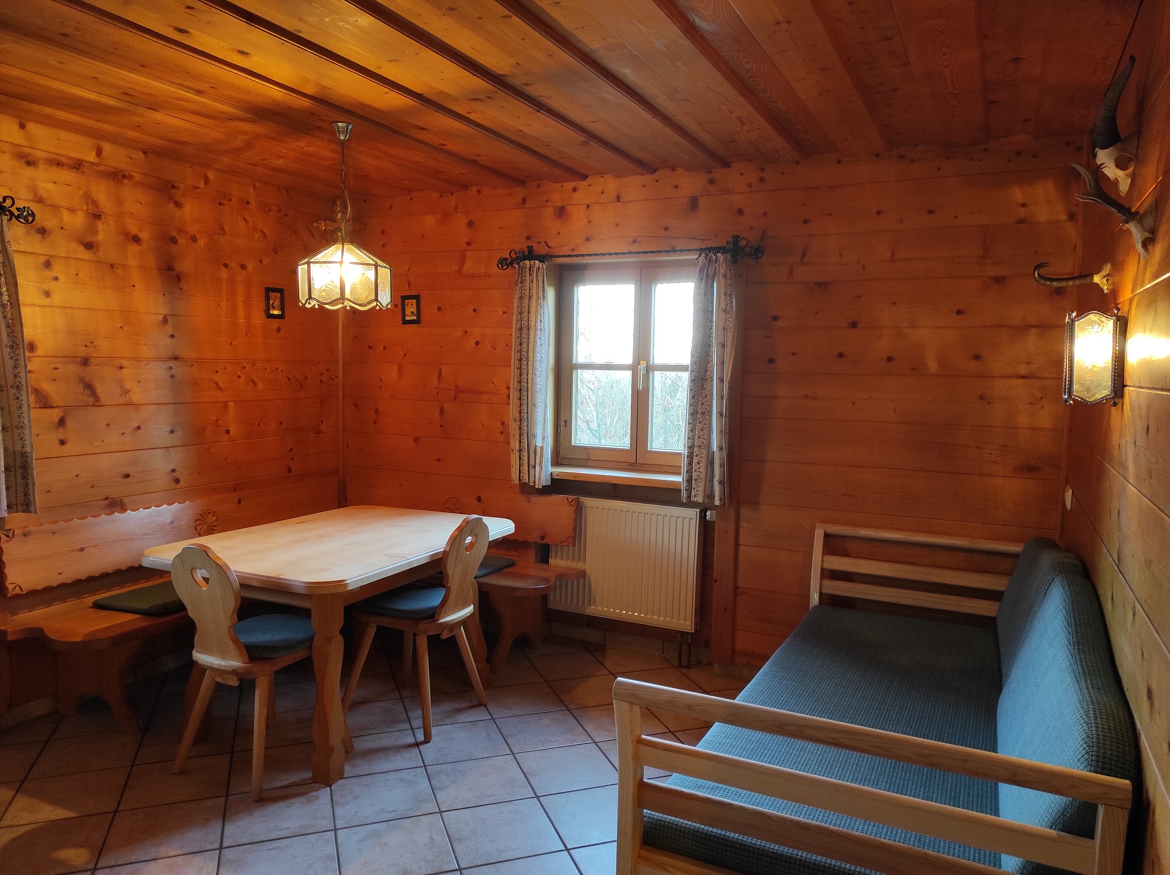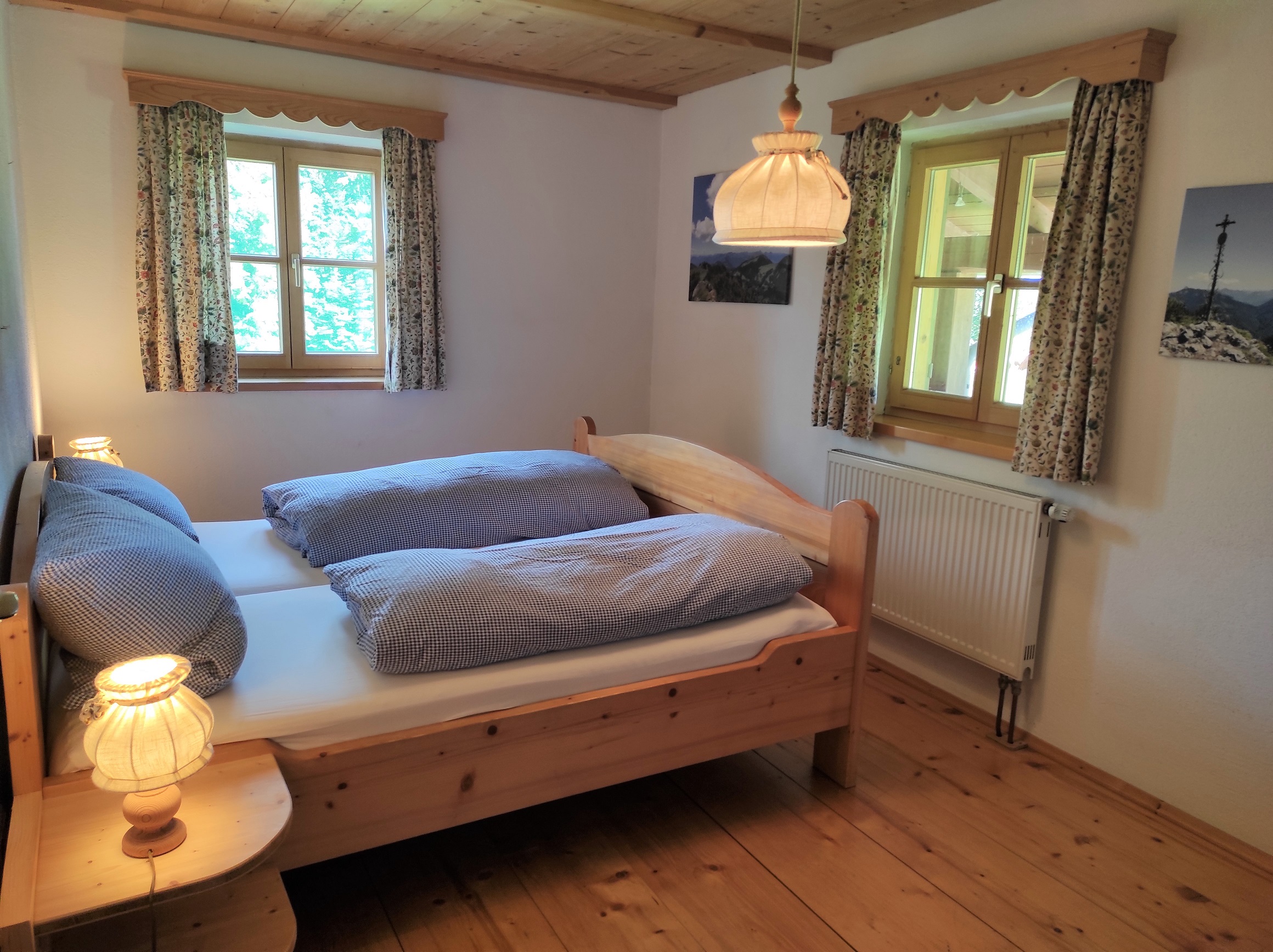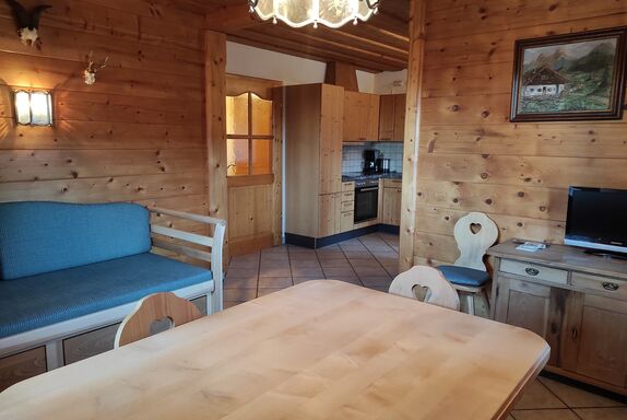 Gemütliche Ferienwohnung im bayerischen Stiel eingerichtet, großer Wohn - Schlafraum mit Stockbetten durch Vorhang abgetrennt, Schlafchouch ausziehbar, Küchennische, 1 separates Schlafzimmer, Bad mit DU/WC, West - und Ostbalkon