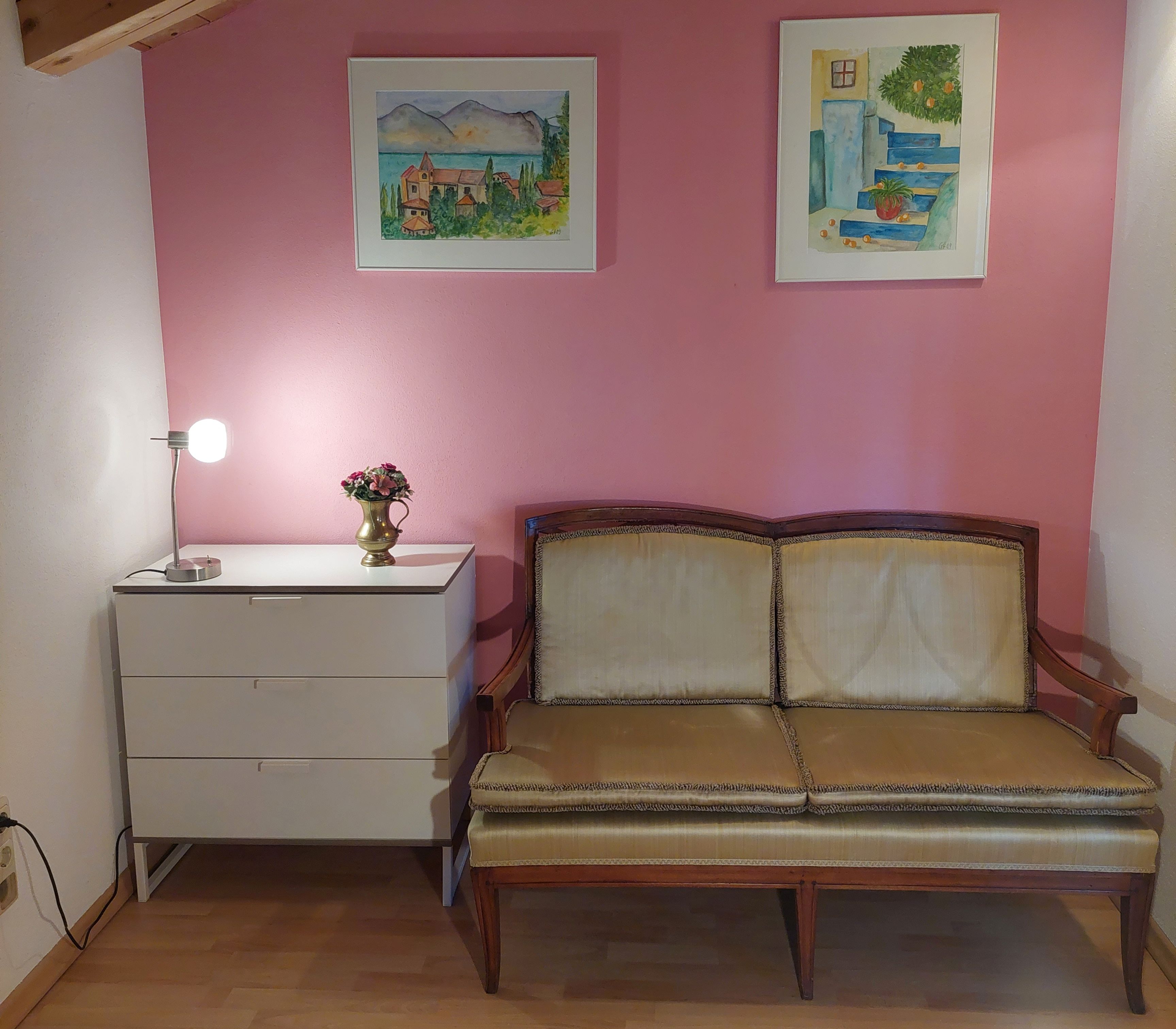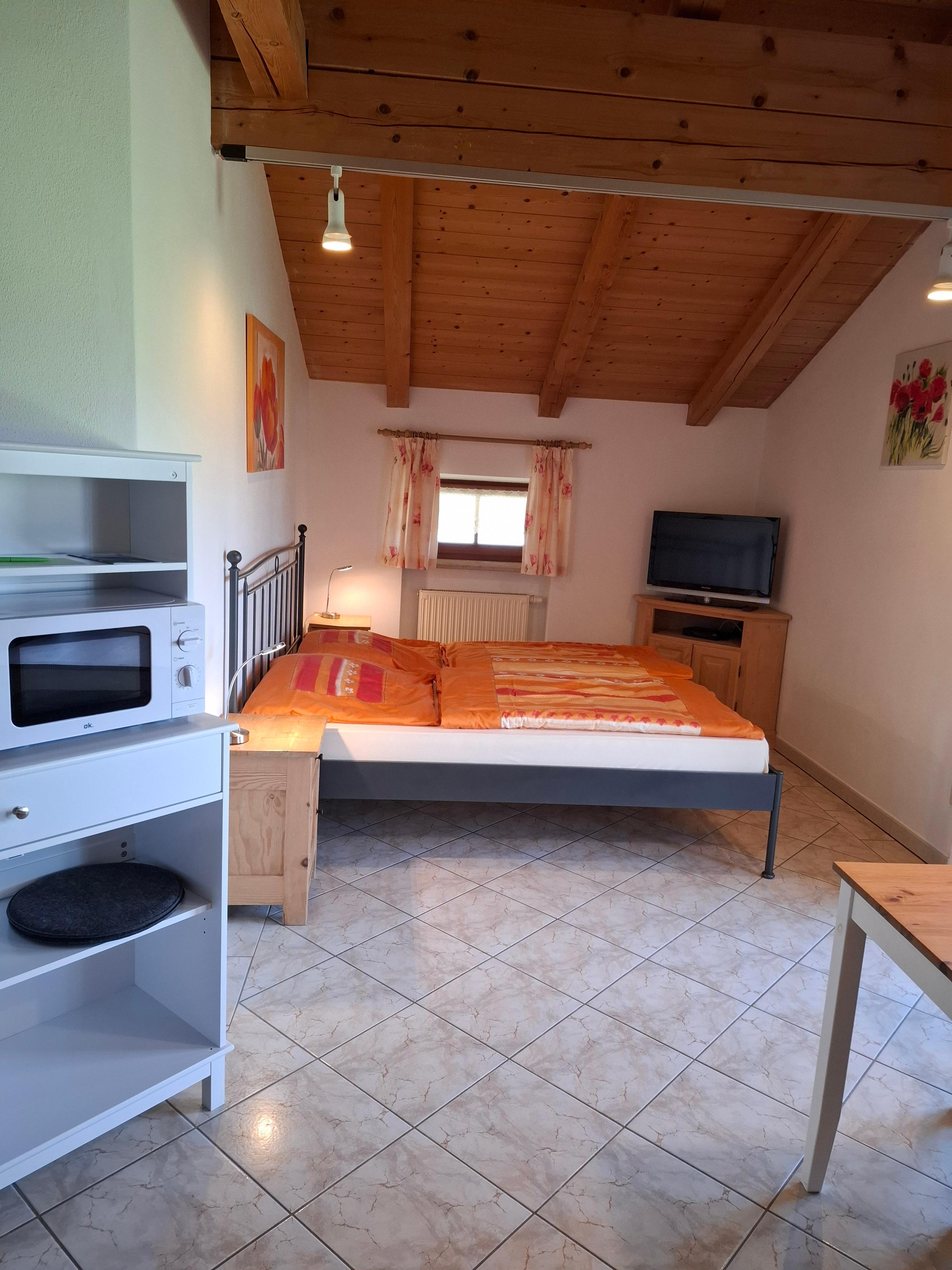 Helle, neu renovierte Ferienwohnung im 1.Stock mit 36m² für bis zu 2 Personen. Wohn-/Schlafraum mit Doppelbett, Kochnische, SAT-TV, WLAN kostenlos, Bad mit Dusche/WC und Balkon. Liegewiese, Grillmöglichkeit und Pavillon mit wunderbarer Aussicht auf die Berge.
