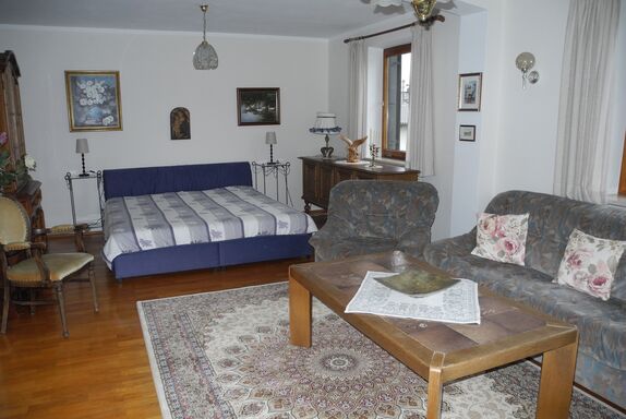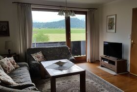 Sehr ruhig gelegene, helle und gemütliche Ferienwohnung mit neuer Einbauküche, Cerankochfeld mit Backofen, Kühl- Gefrierkombination, Sitzecke und Zugang zum Südbalkon. Geräumiges, freundliches und helles Wohnzimmer mit Couchsitzecke und Schlafmöglichkeit (großes französisches Bett) für 2 Personen und Zugang zum Südbalkon mit traumhaften Bergblick über Wiesen und Felder. Sat-TV Anschluss. Separates Schlafzimmer für 2 Personen mit Doppelbett, ausserdem können Sie sich auf ein neu saniertes Bad mit einem barrierefreien Zugang zur Dusche freuen. WC und Waschmaschine sind ebenso vorhanden. WLAN kostenlos. Haustiere gegen Gebühr erlaubt.