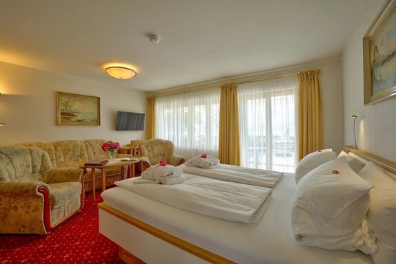 Gemütlich eingerichtetes Doppelzimmer mit Dusche/WC, Minibar, Sitzgelegenheit, TV, Radio und Balkon oder Terrasse zur Seeseite (Kategorie A) - WLAN