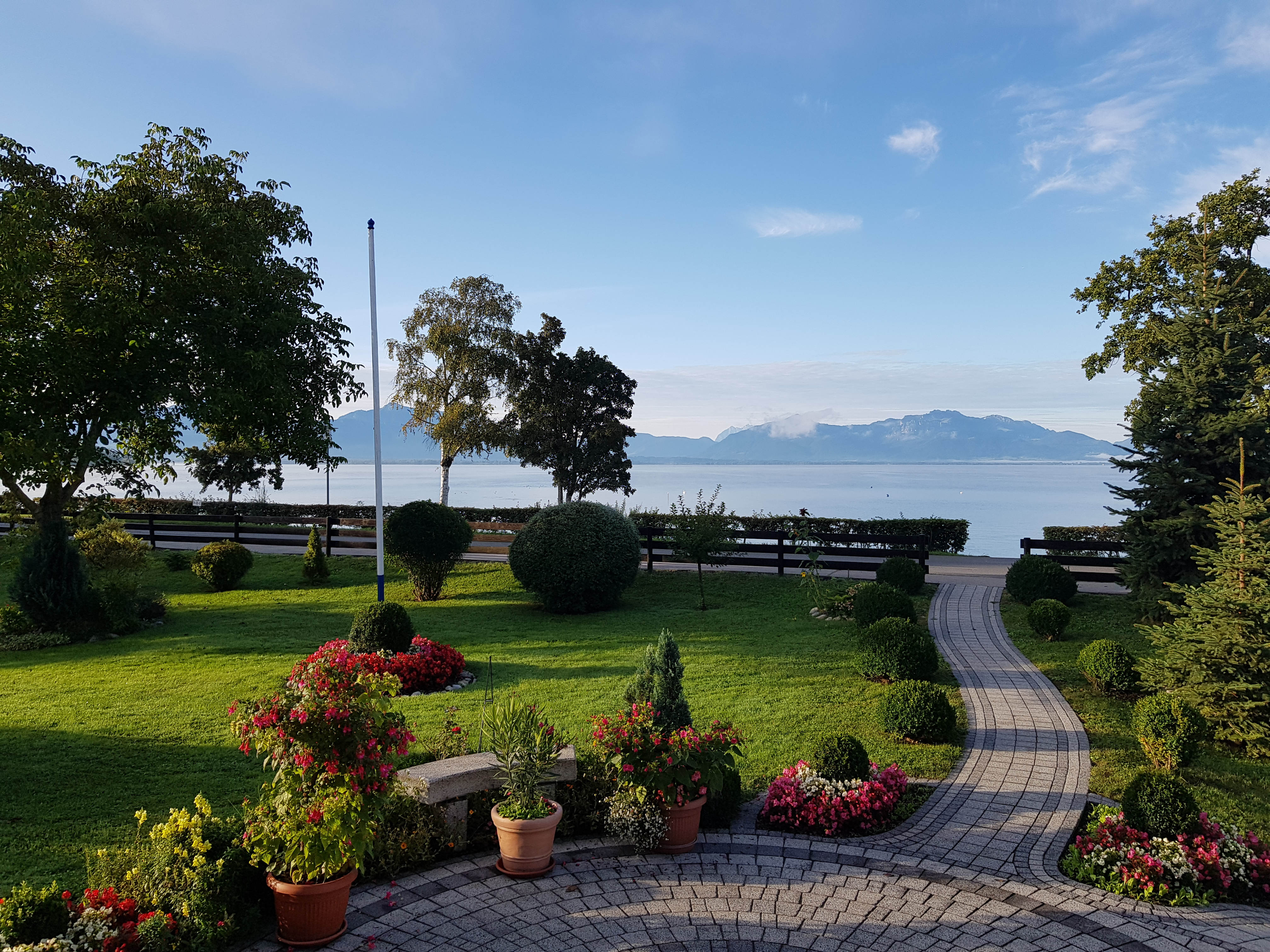 Unser Haus liegt direkt am Chiemsee und wir haben einen herrlichen Blick auf die bayerischen Alpen.