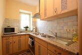 Die Küche ist voll ausgestattet mit E-Herd, Mikrowelle, Kaffeemaschine, Toaster, Wasserkocher sowie Koch- und Tischgeschirr.