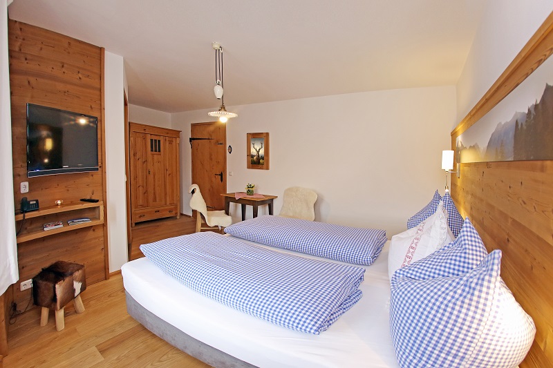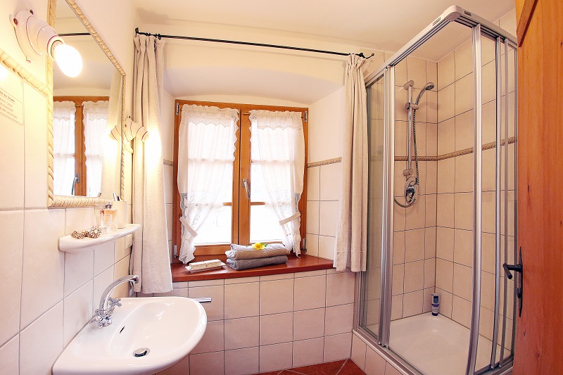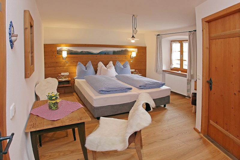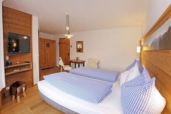 Zimmer 1 „Knechtkammer“ Doppelzimmer für 2 Personen Nord-West im 1.OGMit Blick auf die Weidewiesen zu den glücklichen Kühen. Neu renoviertes, preisgünstiges Doppelzimmer „Knechtkammer“. Klein aber Fein.Ausstattung: Boxspringbett mit offenen Fußende, Dusche/WC mit Fenster zum Lüften, Echtholzboden, Tisch mit zwei Stühlen, Mückenschutzgitter, Telefon, Flachbild-TV, kostenloses W-LAN; Trink- und Weingläser, Toilettenartikel, Handtücher, Bettwäsche, Föhn, Nichtraucherzimmer, keine Haustiere ,kostenloser Parkplatz am Haus, Stellplatz für Radl, Sonnenliegen, Frühstück auch im Bauerngarten möglich.