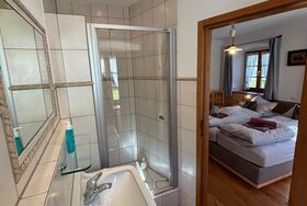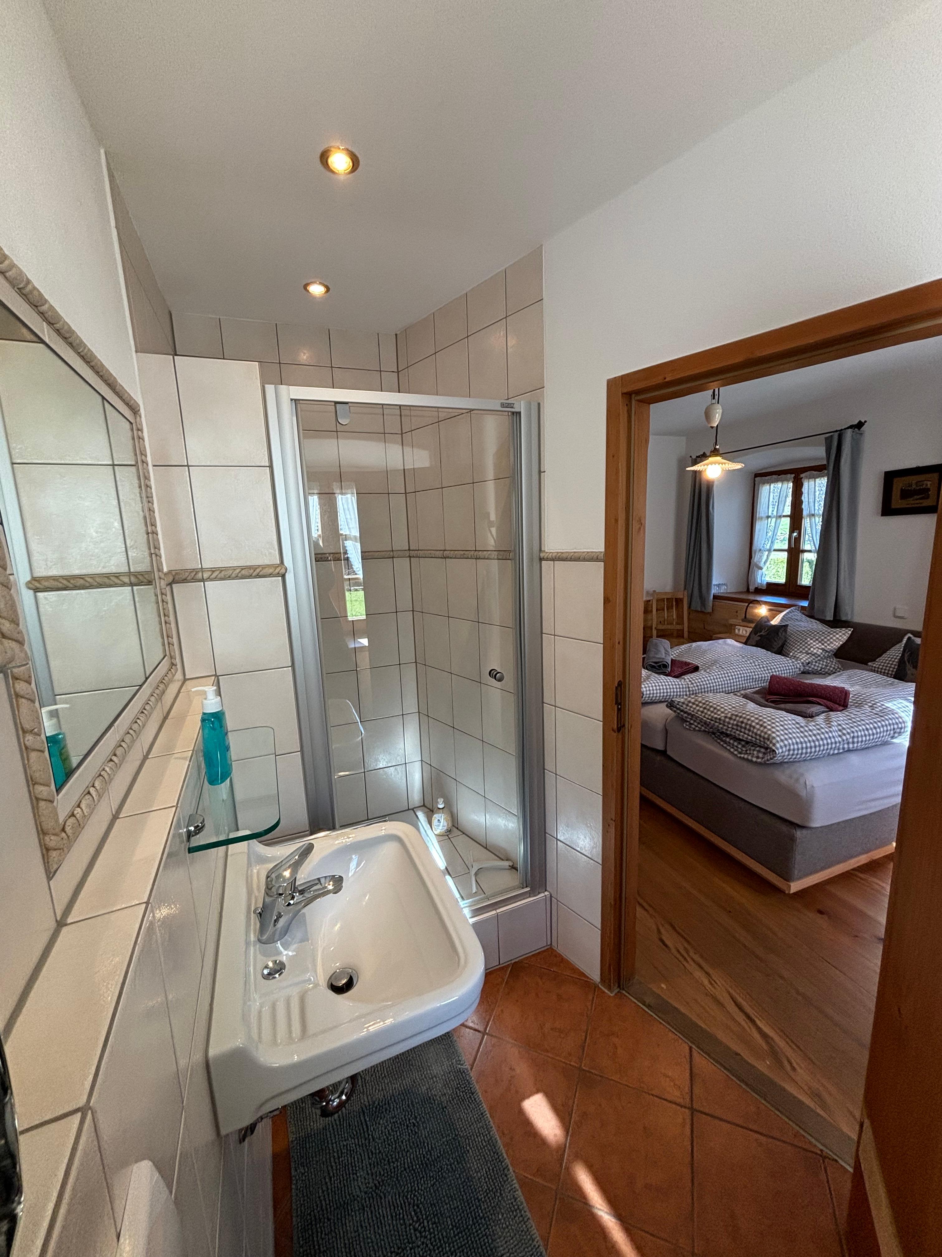 Zimmer 4 “Stubenkammer“ Doppelzimmer für 2 Personen Süd-Ost im Erdgeschoss.Genießen Sie die ersten Sonnenstrahlen mit Blick auf unseren Bauerngarten und das zwitschern der Vögel auf den Obstbäumen im Bauerngarten.Sehr helles Doppelzimmer „Stubenkammer“, Alpenländische Bauernmöbel, Doppelbett mit offenen Fußende, Dusche/WC mit Fenster zum Lüften, Tisch mit zwei Stühlen, Tannenholzboden, Mückenschutzgitter am Fenster, Flachbild-TV; kostenloses W-LAN; Telefon, Trink- und Weingläser, Toilettenartikel, Bettwäsche, Handtücher, Gartenmöbel.Nichtraucher, keine Haustiere, kostenloser Parkplatz am Haus, Stellplatz für Radl, Sonnenliegen, Frühstück auch im Garten möglich.