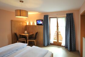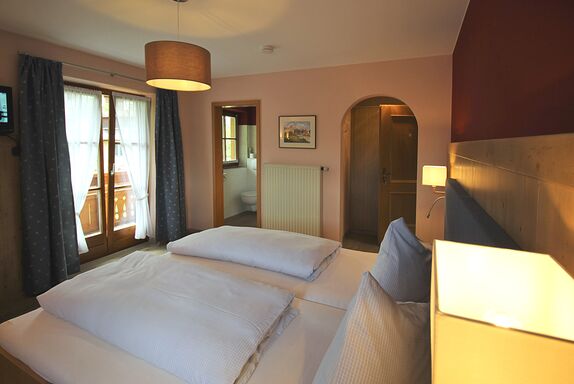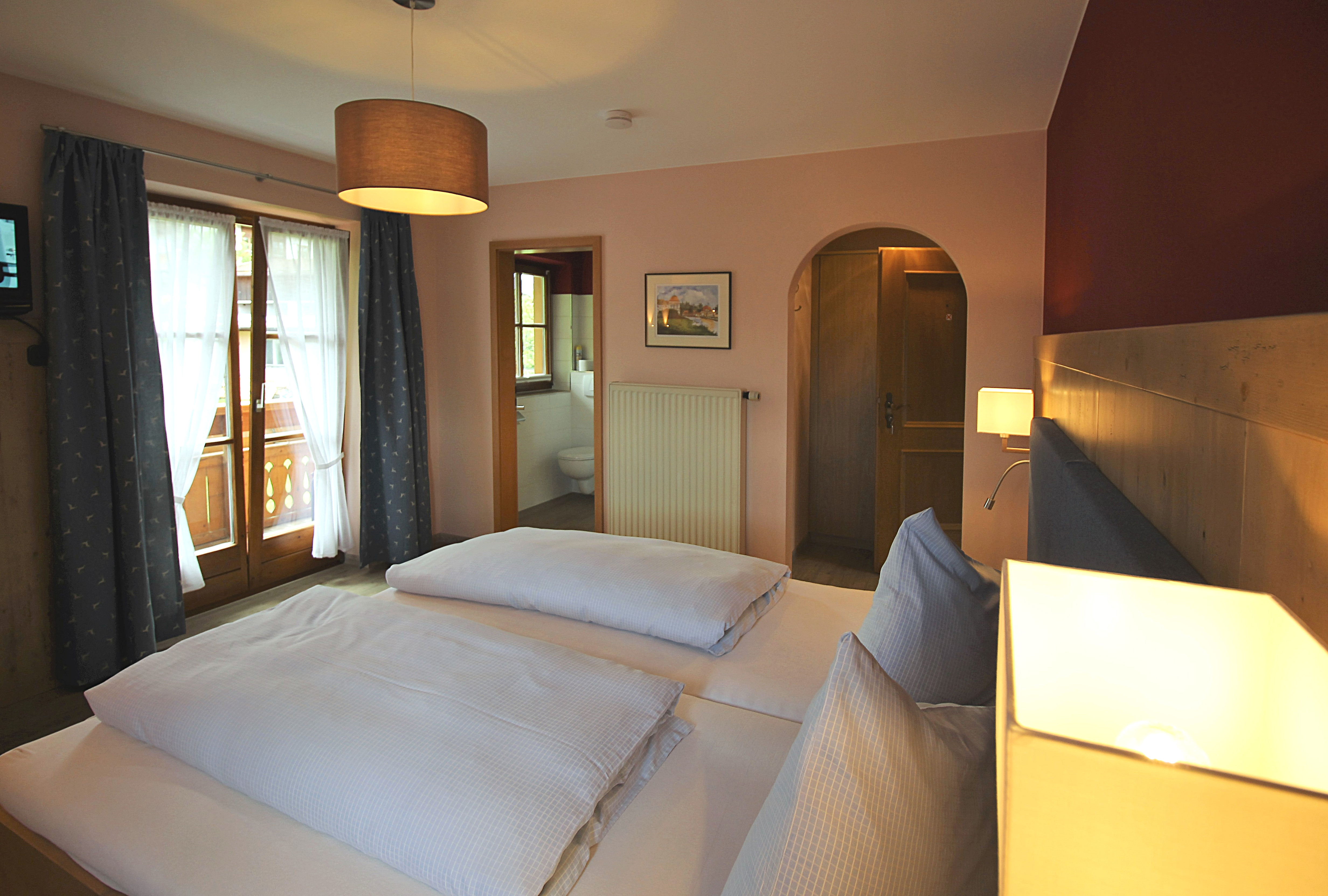 Das Zimmer wurde 2016 komplett neu renoviert. Ausstattung: Massivholz-Doppelbett, kleine Sitzecke mit Wandvertäfelung. Fußboden in Holzoptik, Sat-TV mit Flachbildschirm, kostenloses W-LAN und Zimmersafe, hochwertige LED-Beleuchtung. Badausstattung: Echtglas-Dusche, WC, Föhn, Seifenspender. Möblierter Balkon mit Blick in den Garten.