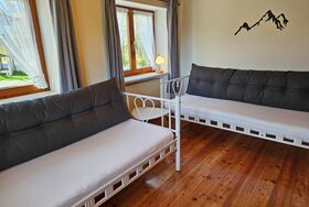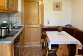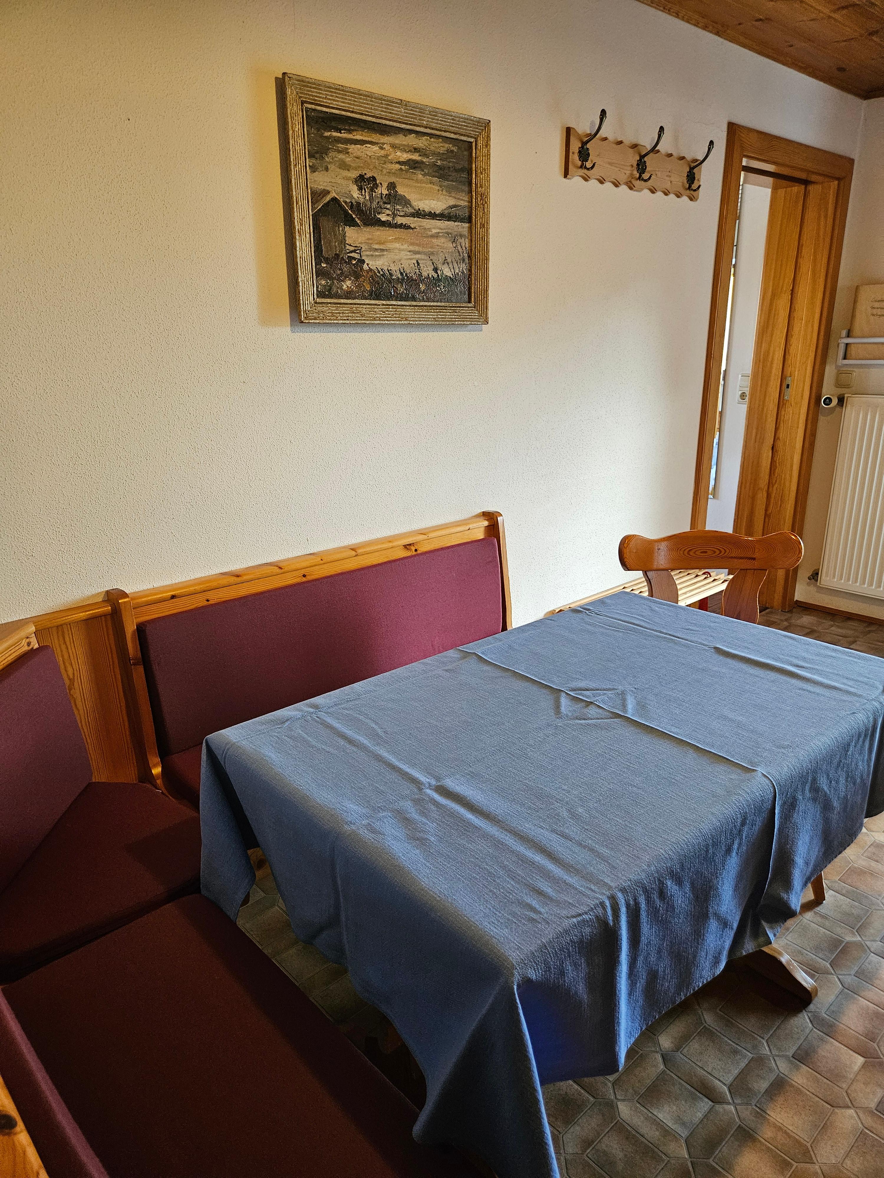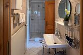 Die Ferienwohnung liegt im Nebenhaus, ist ebenerdig und hat eine sehr große möblierte Terrasse, sowie einen direkten Garten-Zugang. Sie verfügt über ein Bad mit Dusche und WC, ein Schlafzimmer mit Doppelbett, einen kombinierten Wohn- / Schlafraum mit zwei Tagesbetten und TV - die Tagesbetten können als Couch oder auch als Bett genutzt werden. Eine gut ausgestattete Küche mit Essbereich und Gaderobe. Die Küche ist ausgestattet mit Spülmaschine, Kaffeemaschine, Wasserkocher, Toaster, 4-Plattenherd, Backofen und Kühlschrank mit Gefrierfach. Außerdem W-Lan und Radio-CD-Player. Ein Babybett ist hier leider nicht möglich.