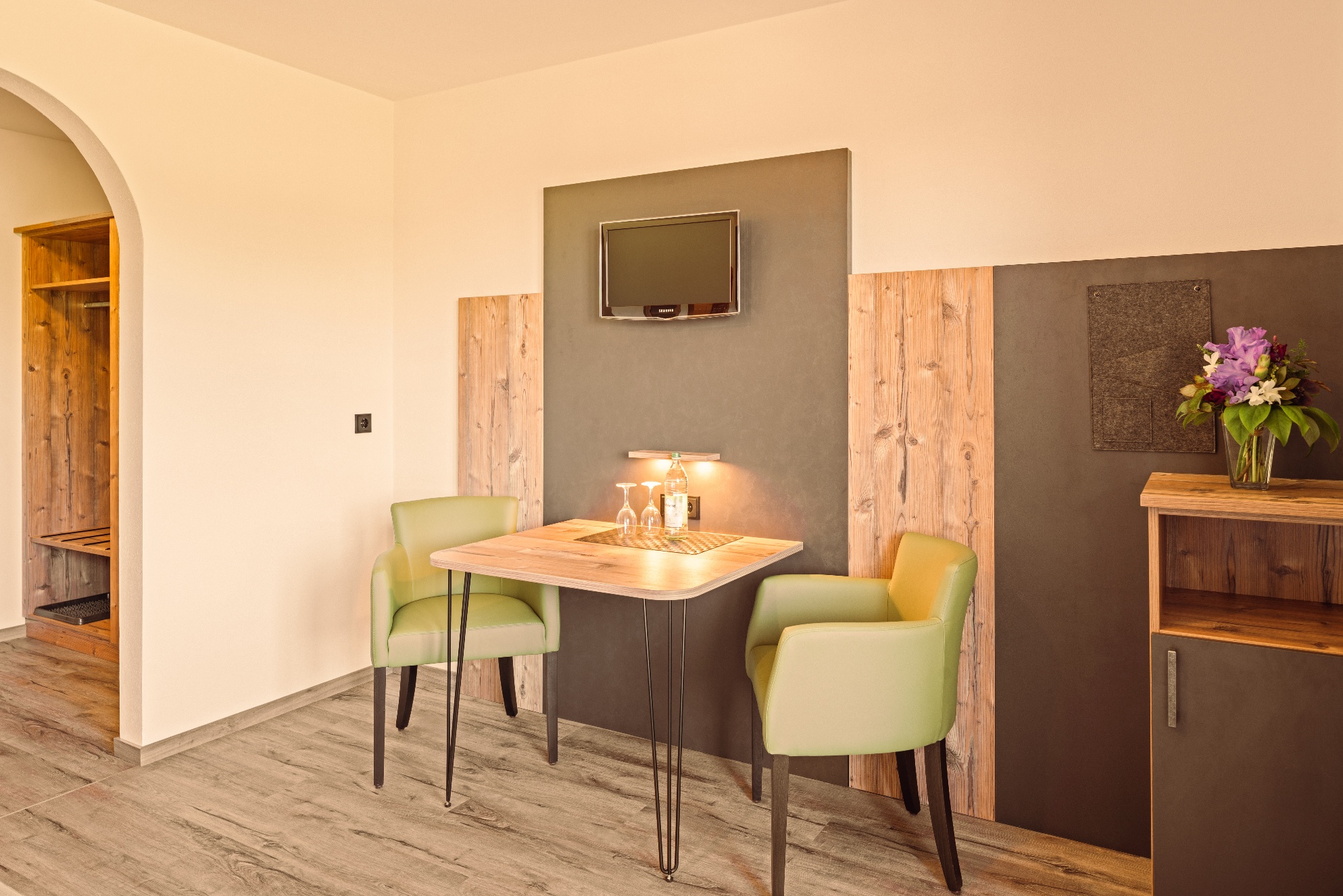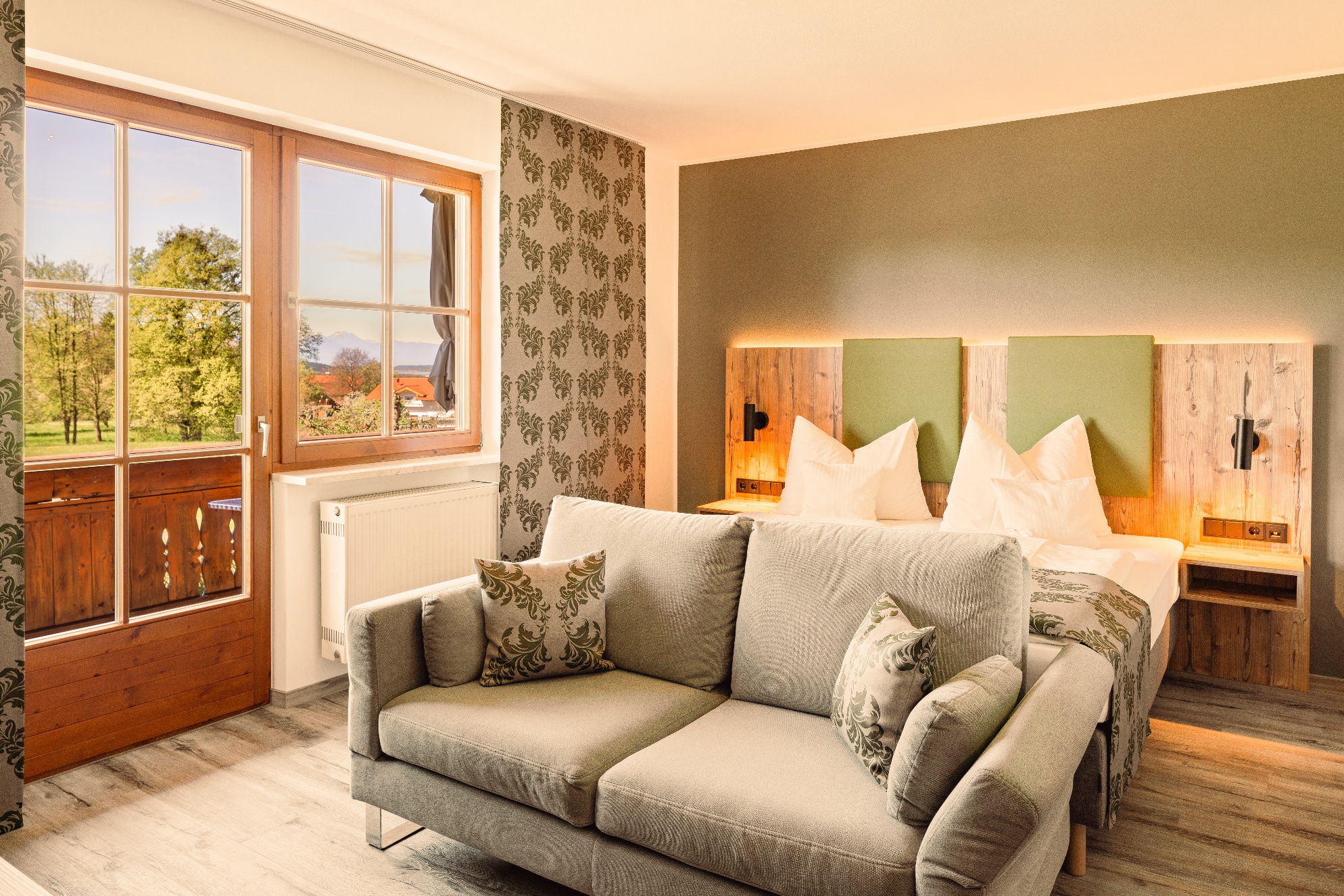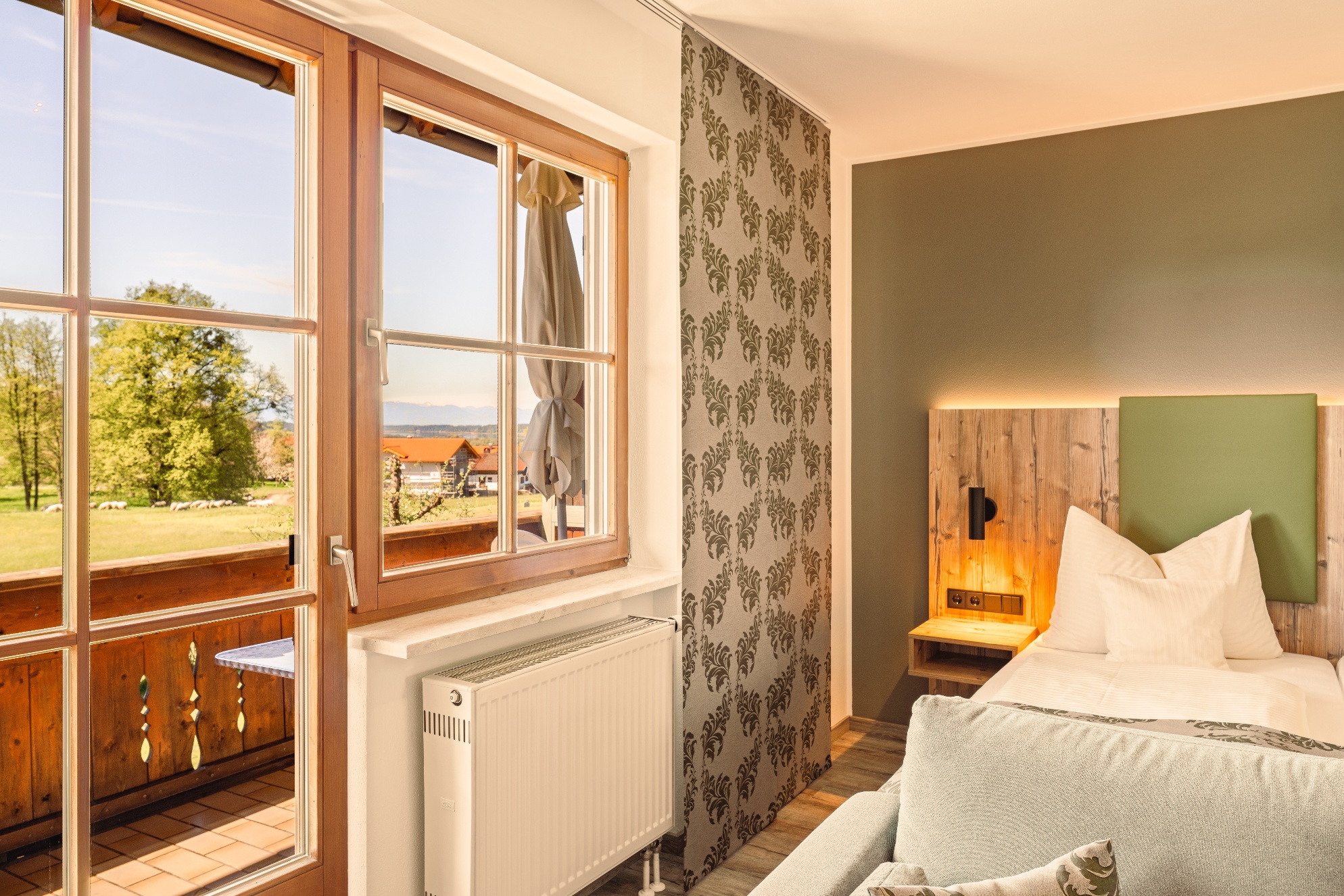 Alle Appartements haben einen Balkon und einen wundervollen Weitblick auf den Simssee die Berge und die nahelegende Chiemgautherme mit Simsseeklinik. Die Zimmer haben DU/WC, Küchenzeile, Telefon, Fernseher, kostenloses WLAN, Tisch, Stühle und eine Couch. Ebenso ist ein Ganzkörperspiegel, eine Garderobe und ein Kleiderschrank mit Kleiderhaken und Ablegeflächen vorhanden. Die Küche ist komplett mit Töpfe, Geschirr, Besteck, Herdplatten, Kühlschrank mit Eisfach, Wasserkocher und einer Kaffeemaschine ausgestattet. Das Bad hat einen Spiegel, beheizten Handtuchhalter mit Handtücher und einen Fön. Der Balkon ist bestückt mit Sonnenschirm, Sitzgelegenheit mit Tisch und Stühle, Wäscheständer und Liegestühle zum Sonnen. Für die kalte Jahreszeit ist eine Zentralheizung vorhanden. Zur Verdunkelung sind Rolladen an den Fenstern und Balkontüren vorhanden.