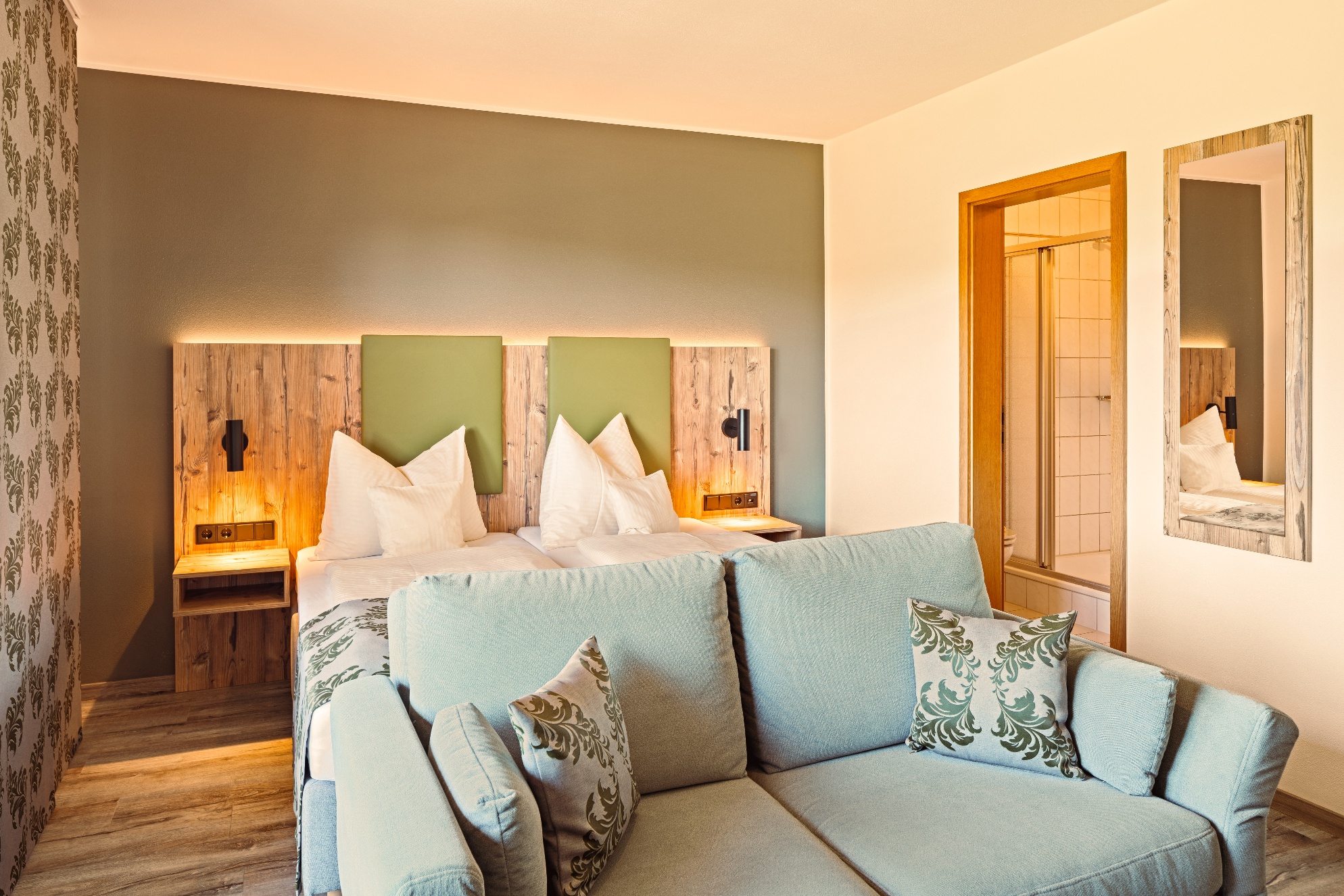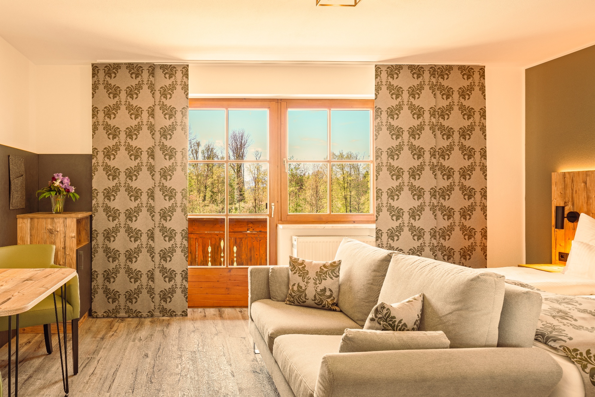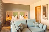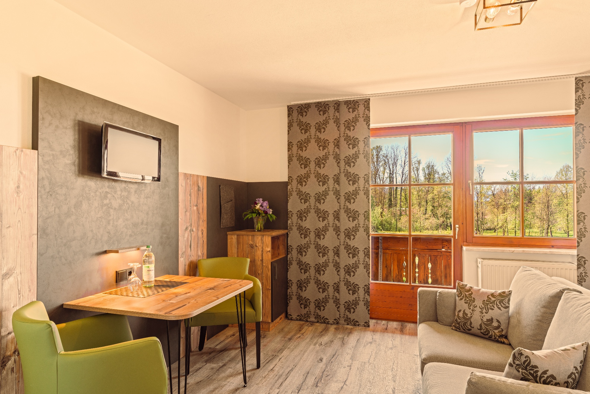 Alle Appartements haben einen Balkon und einen wundervollen Weitblick auf den Simssee die Berge und die nahelegende Chiemgautherme mit Simsseeklinik. Die Zimmer haben DU/WC, Küchenzeile, Telefon, Fernseher, kostenloses WLAN, Tisch, Stühle und eine Couch. Ebenso ist ein Ganzkörperspiegel, eine Garderobe und ein Kleiderschrank mit Kleiderhaken und Ablegeflächen vorhanden. Die Küche ist komplett mit Töpfe, Geschirr, Besteck, Herdplatten, Kühlschrank mit Eisfach, Wasserkocher und einer Kaffeemaschine ausgestattet. Das Bad hat einen Spiegel, beheizten Handtuchhalter mit Handtücher und einen Fön. Der Balkon ist bestückt mit Sonnenschirm, Sitzgelegenheit mit Tisch und Stühle, Wäscheständer und Liegestühle zum Sonnen. Für die kalte Jahreszeit ist eine Zentralheizung vorhanden. Zur Verdunkelung sind Rolladen an den Fenstern und Balkontüren vorhanden.