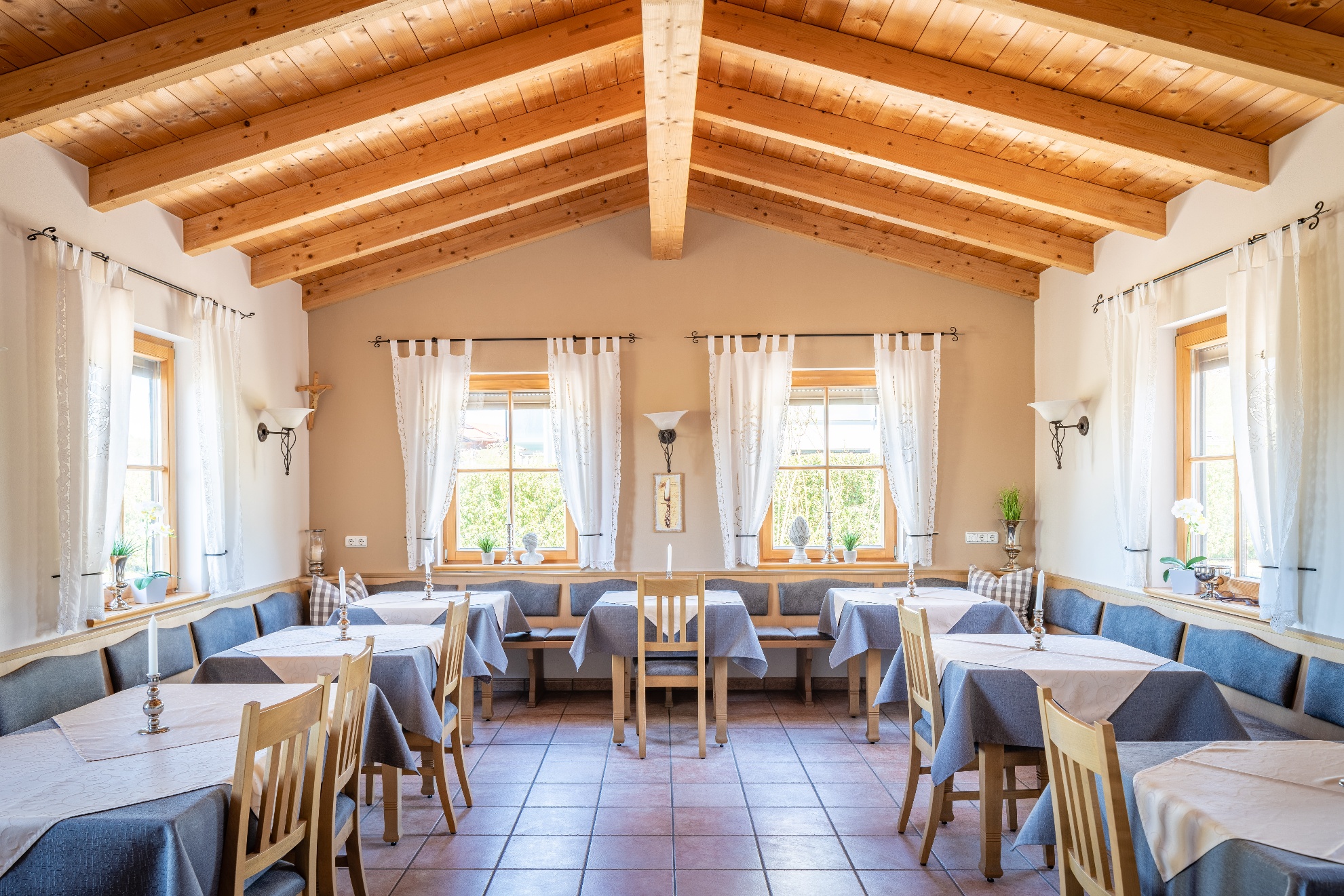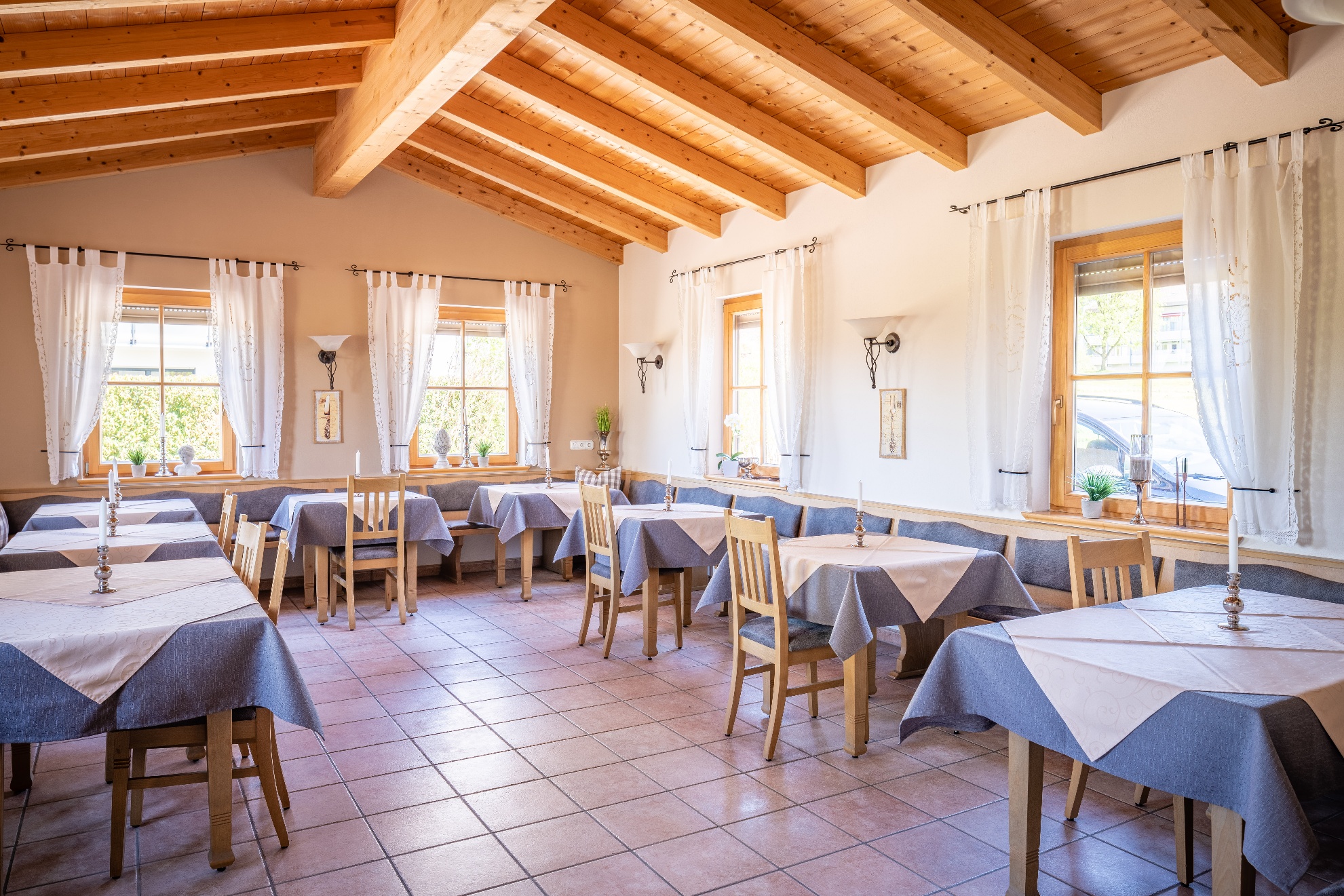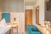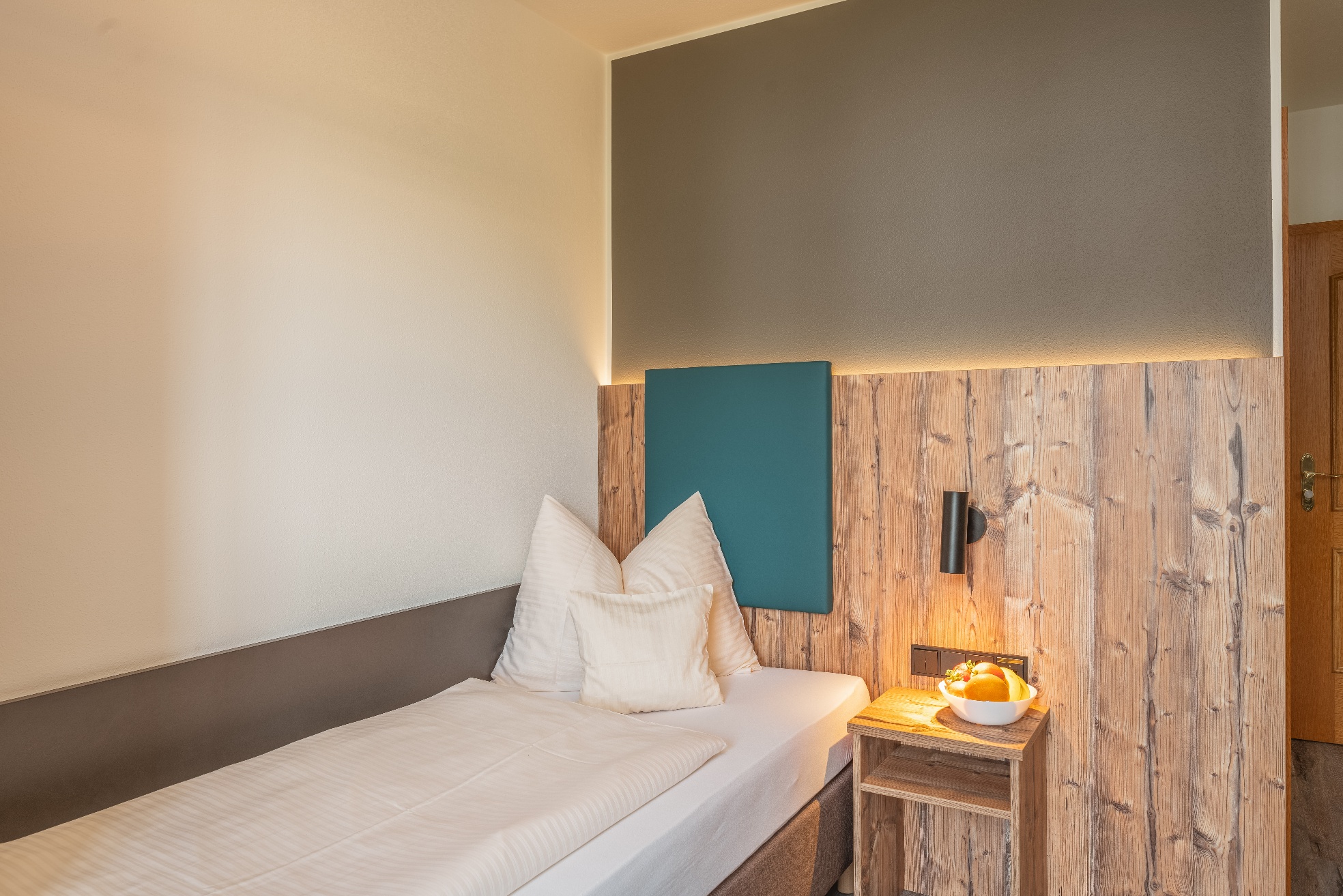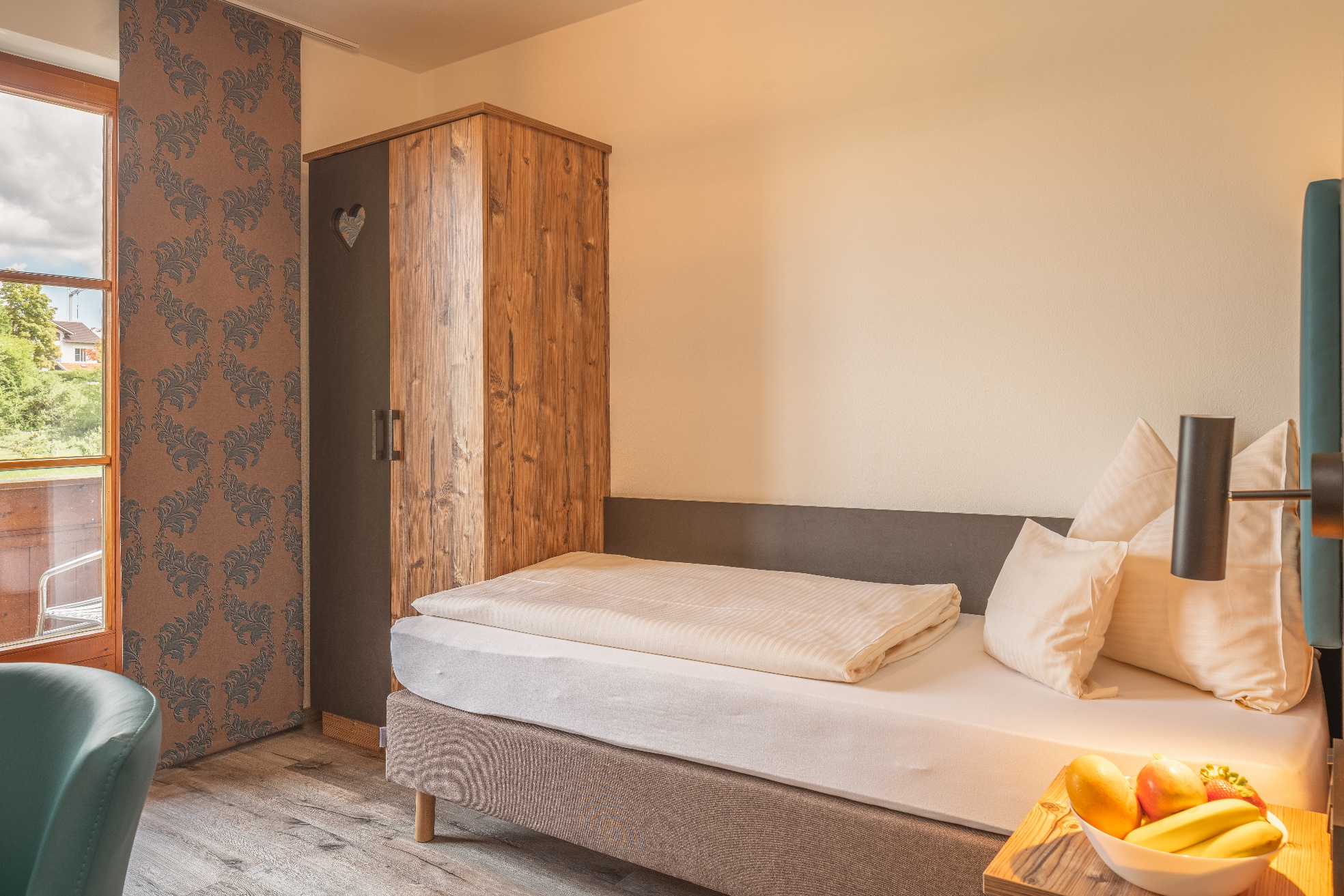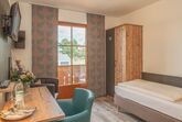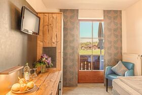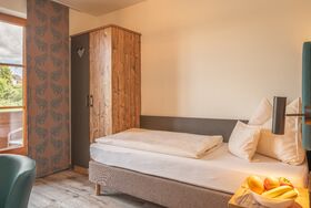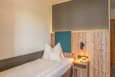 Die Einzelzimmer mit DU/WC, Telefon, Fernseher, kostenloses WLAN haben Terrasse oder Balkon mit einem wundervollen Weitblick auf die Berge und den Simsse. Ebenso ist ein Ganzkörperspiegel, eine Garderobe, und ein Kleiderschrank mit Kleiderhaken und Ablegeflächen vorhanden. Die Zimmer sind ausgestattet mit einem Kühlschrank für kalte Gestränke und einer Brotzeit, Teller, Besteck, Wasserkocher, Tisch und Stuhl. Das Bad hat einen Spiegel, beheizten Handtuchhalter mit Handtücher, und einen Fön. Für die kalte Jahreszeit ist eine Zentralheizung vorhanden. Die Terrasse oder auch Balkon sind mit Sonnenschirmen, Tische, Stühle und Sonnenliegen ausgestattet. Zur Verdunkelung sind Rolladen an den Fenstern und Balkontüren.