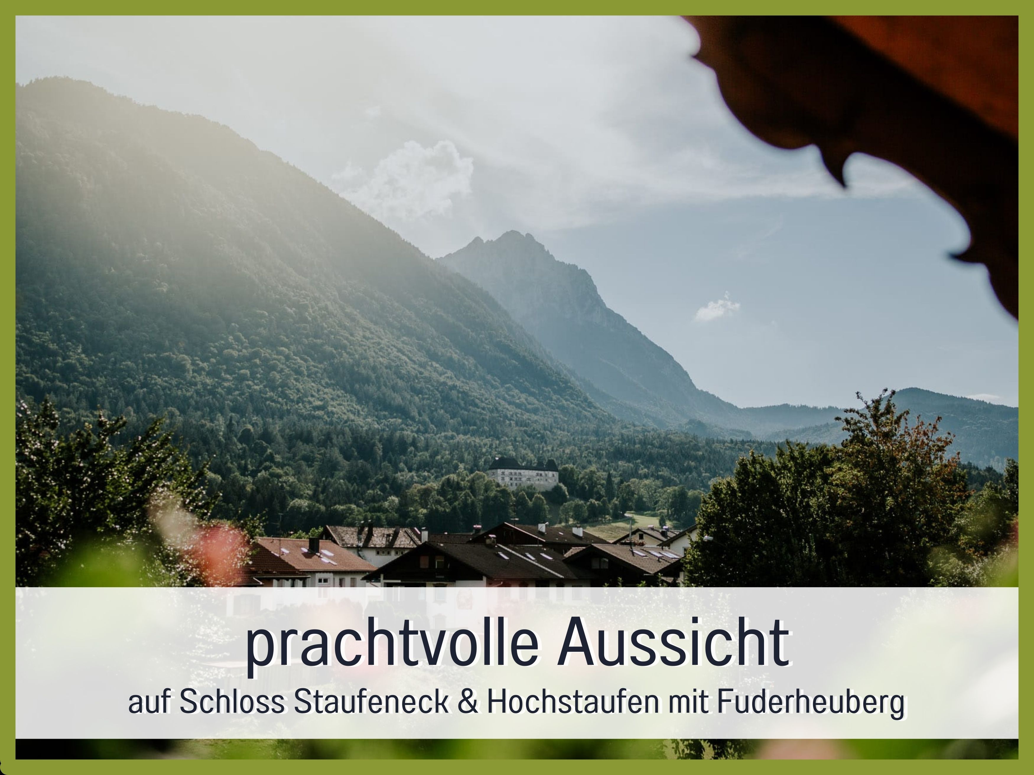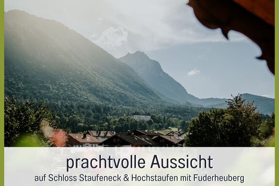 Schicke, moderne 5-Sterne Ferienwohnung Schlossblick (61 m²) für 2 Personen mit malerischem Ausblick auf das Schloss Staufeneck und den Hochstaufen, mit Schlafzimmer, Küche, Wohnzimmer, Dusche/WC und Balkon. Der große und überdachte Balkon ist zum Westen ausgerichtet - ideal, um den Tag mit einem gemütlichen Frühstück zu beginnen oder ihn bei einem Glas Wein ausklingen zu lassen. Um Ihren Aufenthalt perfekt zu machen, gehören kostenloses WLAN/WiFi sowie ein Bluetooth-/Internet-Radio ebenfalls zur Ausstattung. Für Ihren ungestörten Schlaf wurden die Fenster größtenteils mit Insekten-Schutzgittern ausgestattet.