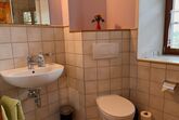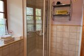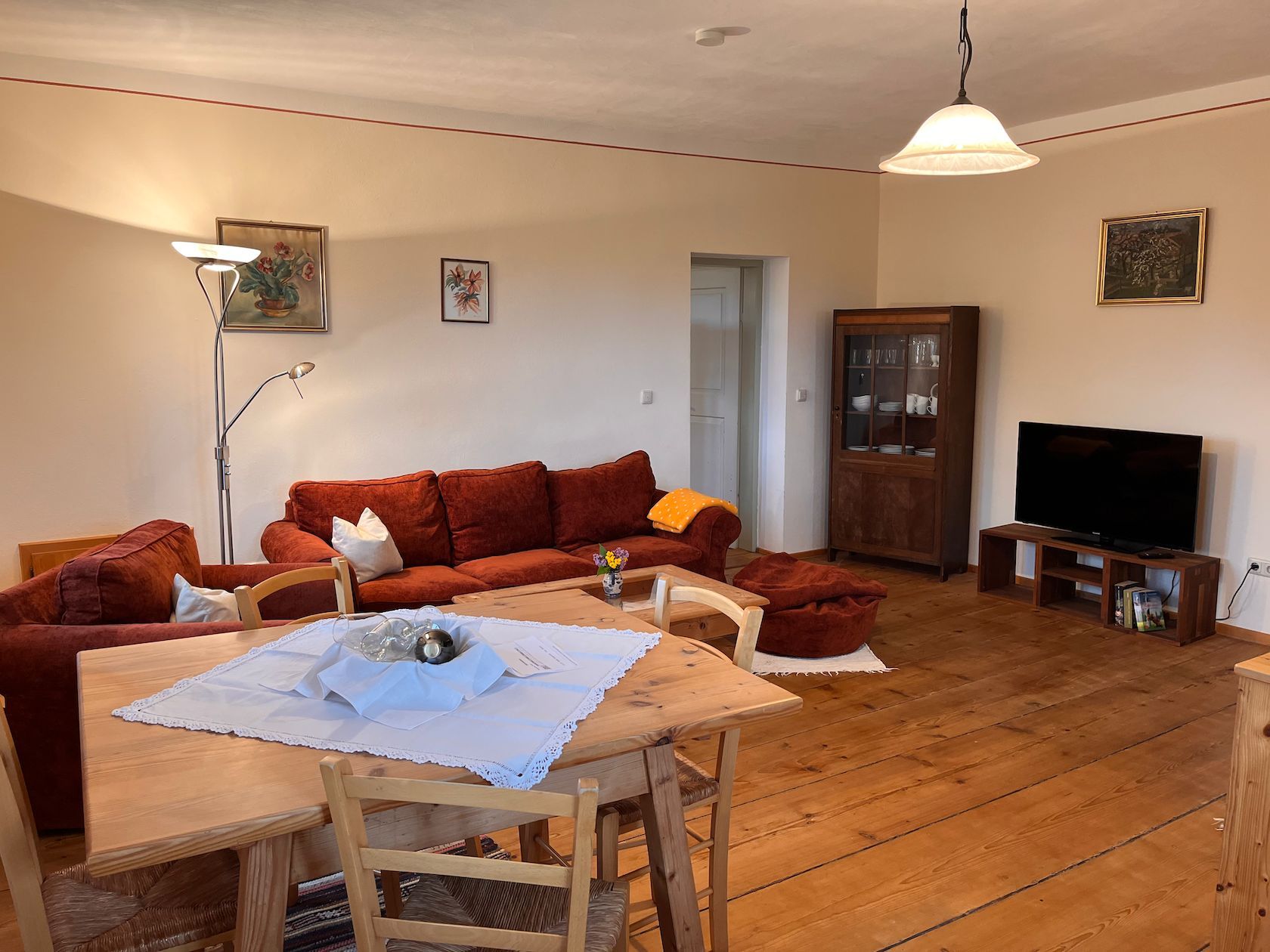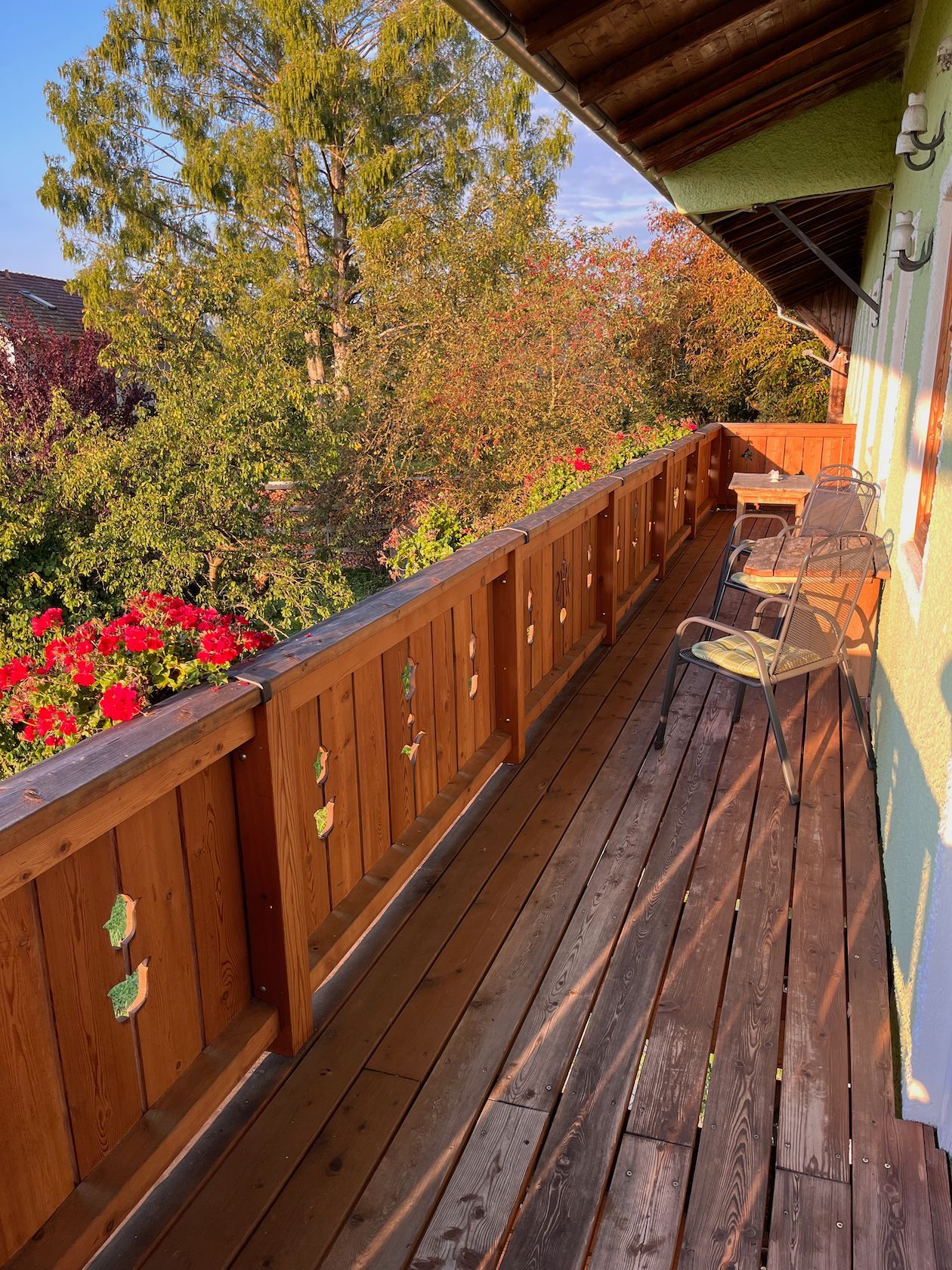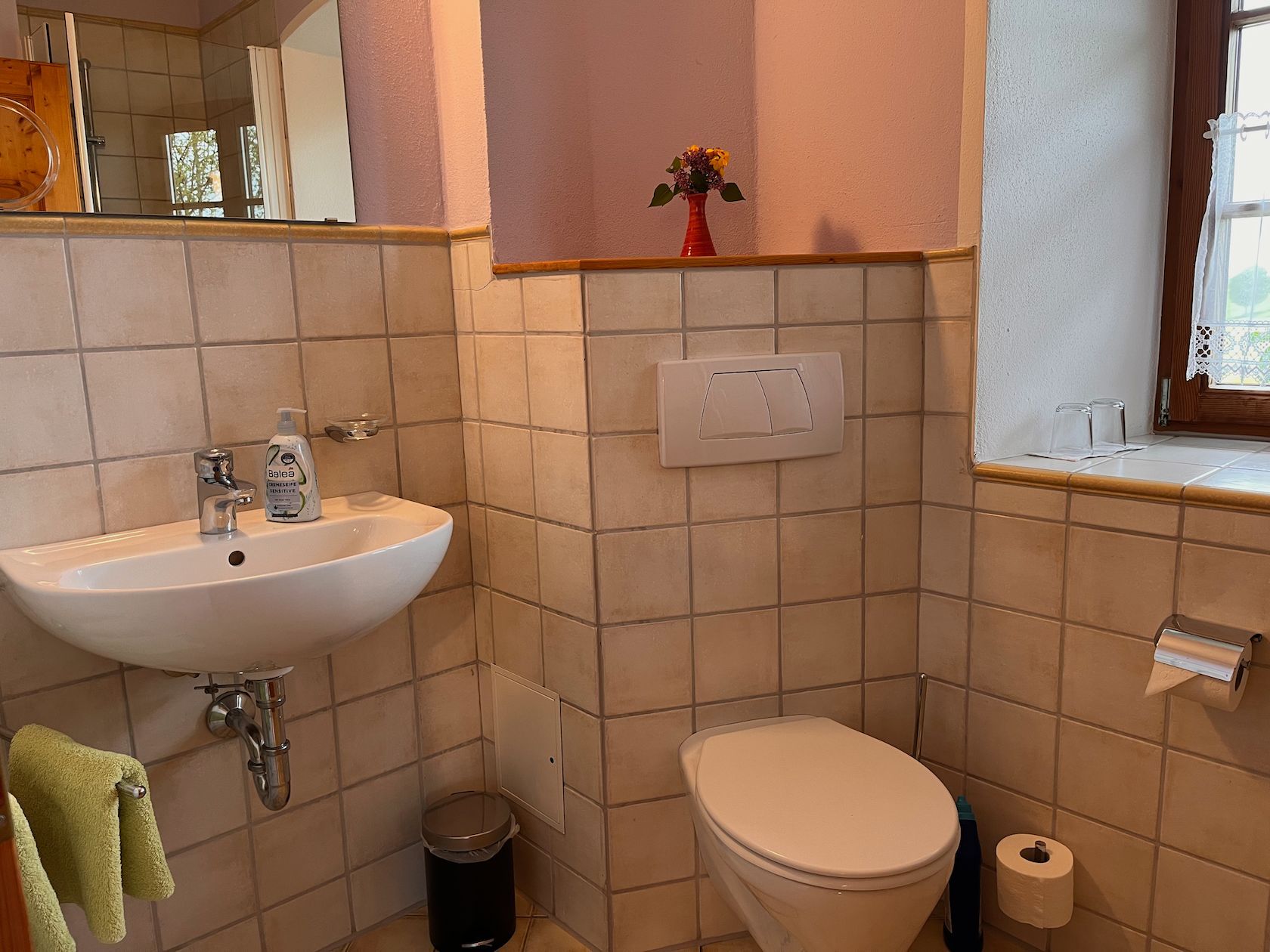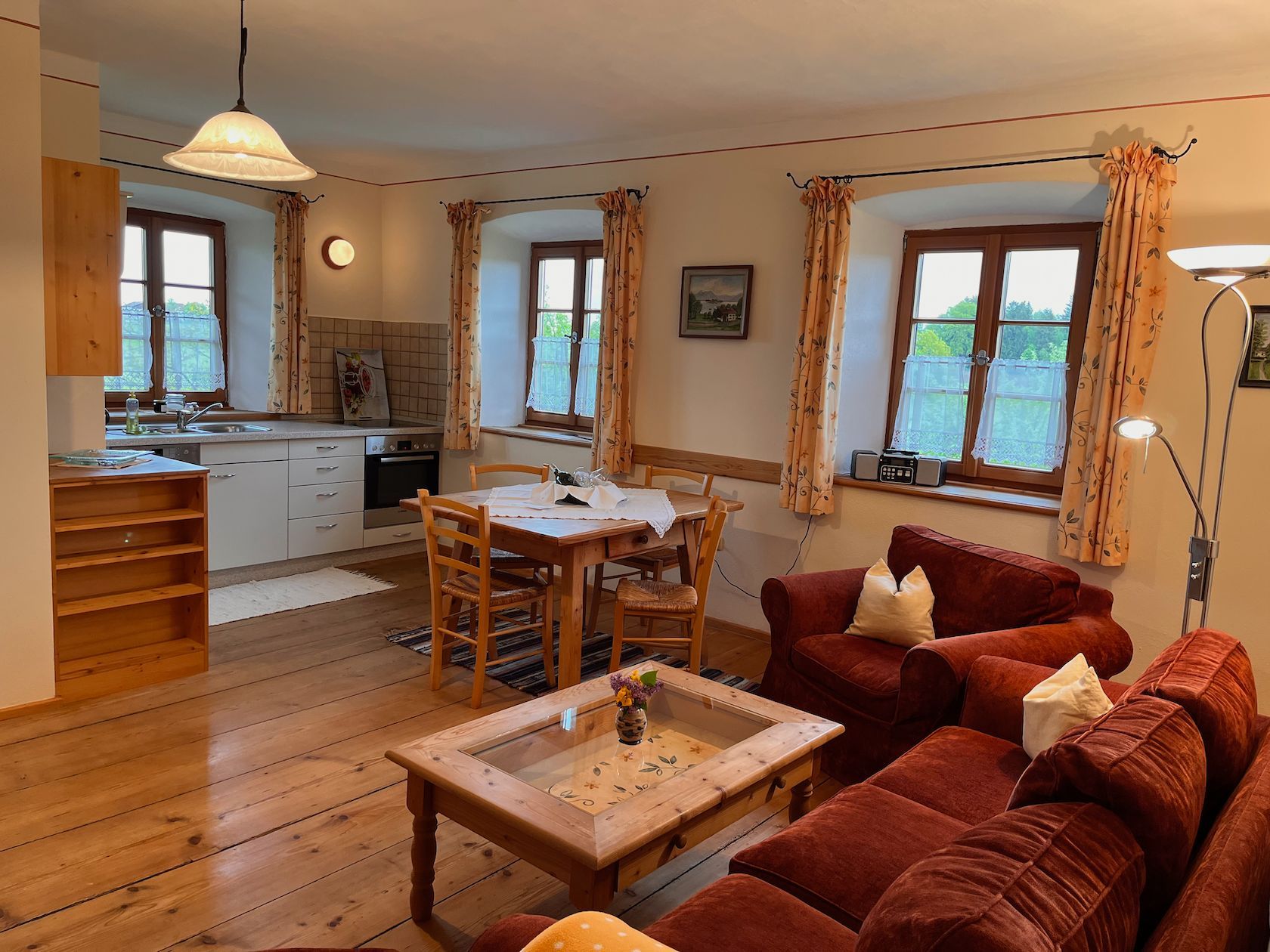 Die Ferienwohnung mit 52 qm befindet sich im 1. Obergeschoss und ist aufgeteilt in eine kleine Wohnküche mit Esstisch und einer gemütlichen Couch zum Ausspannen. Das separate Schlafzimmer ist im bayerischen Stil eingerichtet, mit Doppelbett und einem Etagenbett, sowie einem kleinen Badezimmer mit Dusche und WC. Auf dieser Etage haben Sie über den Hausgang Zugang zum Gemeinschaftsbalkon, mit einem herrlichen Blick nach Süden auf die Berge und den Garten.