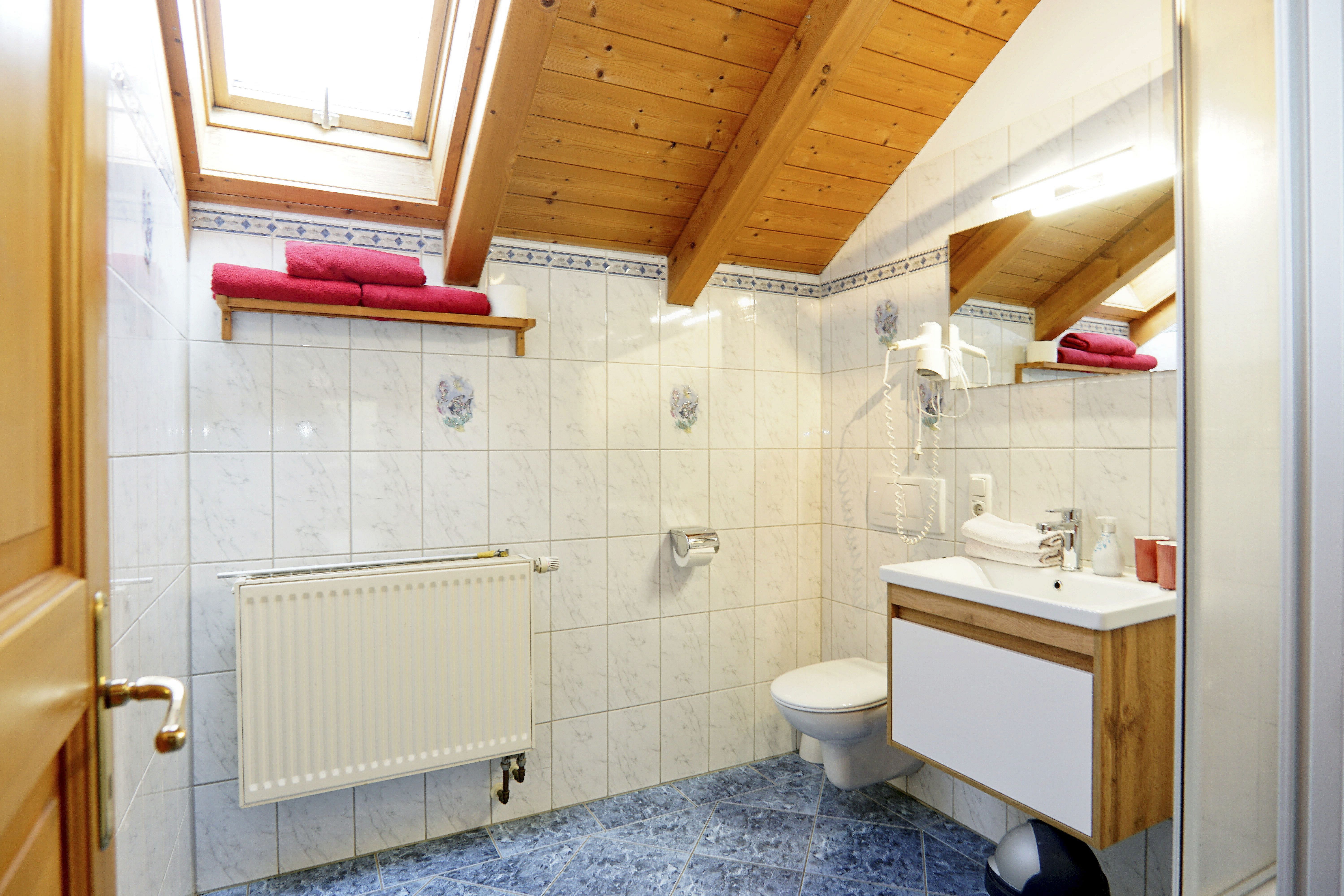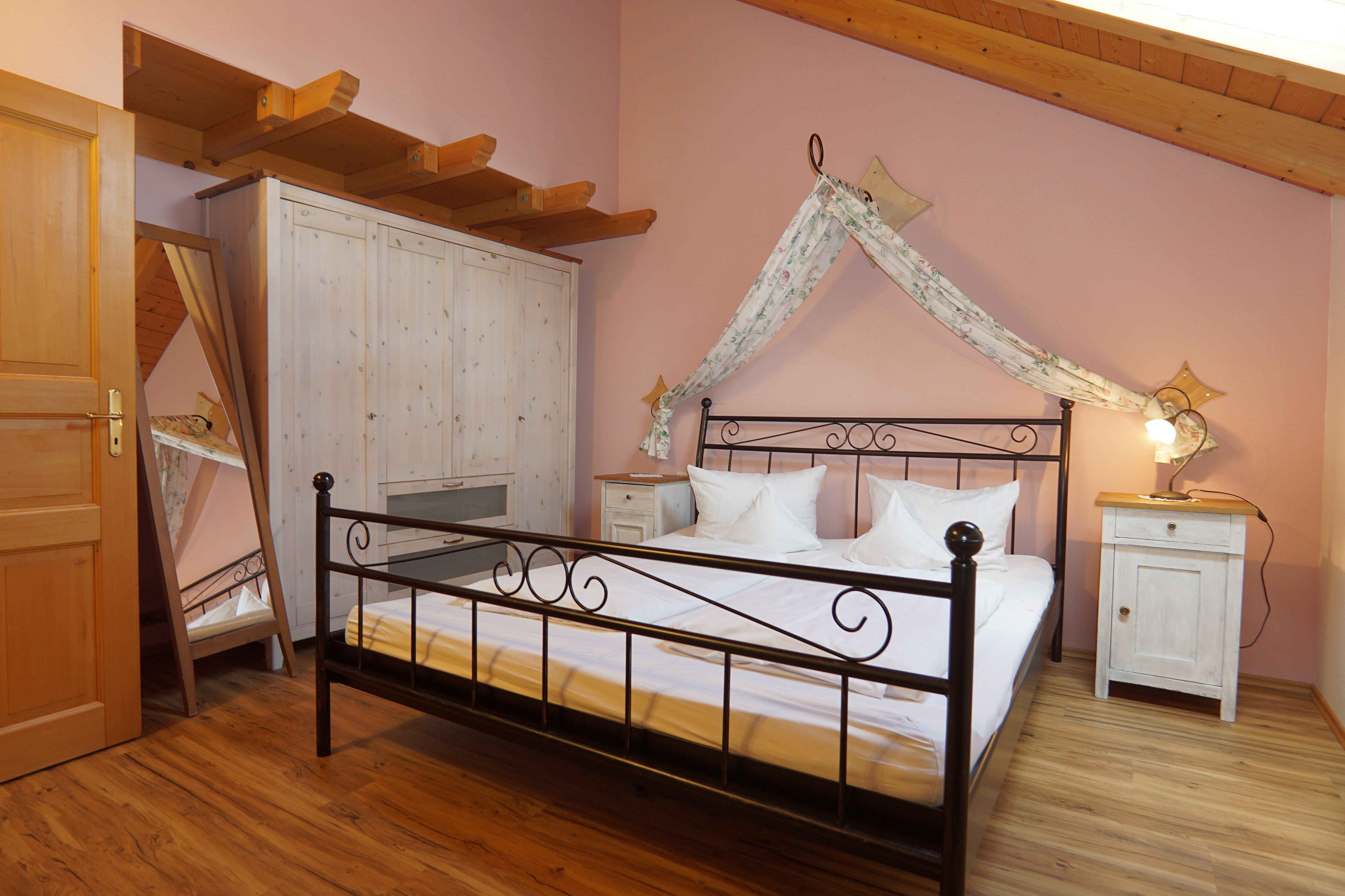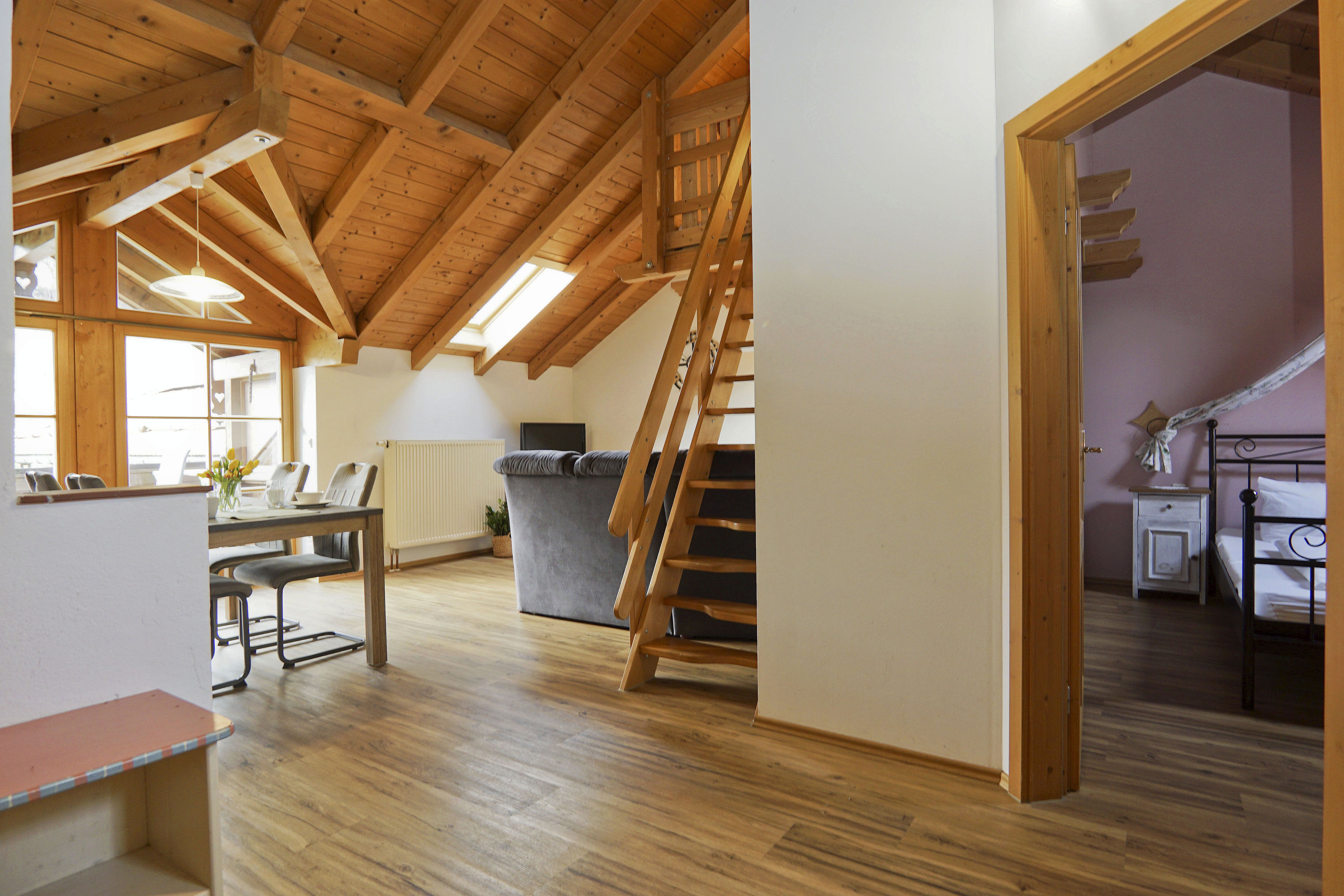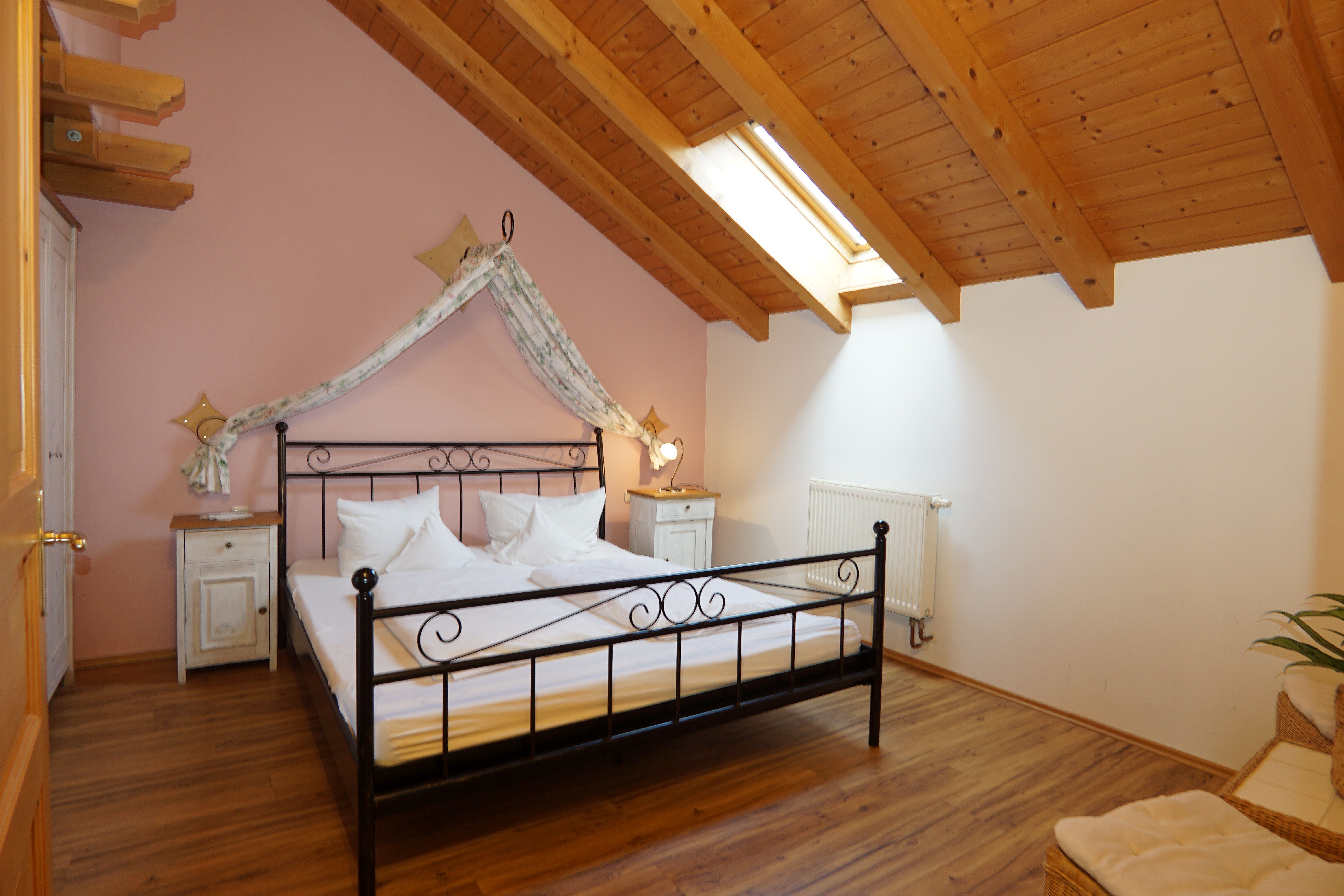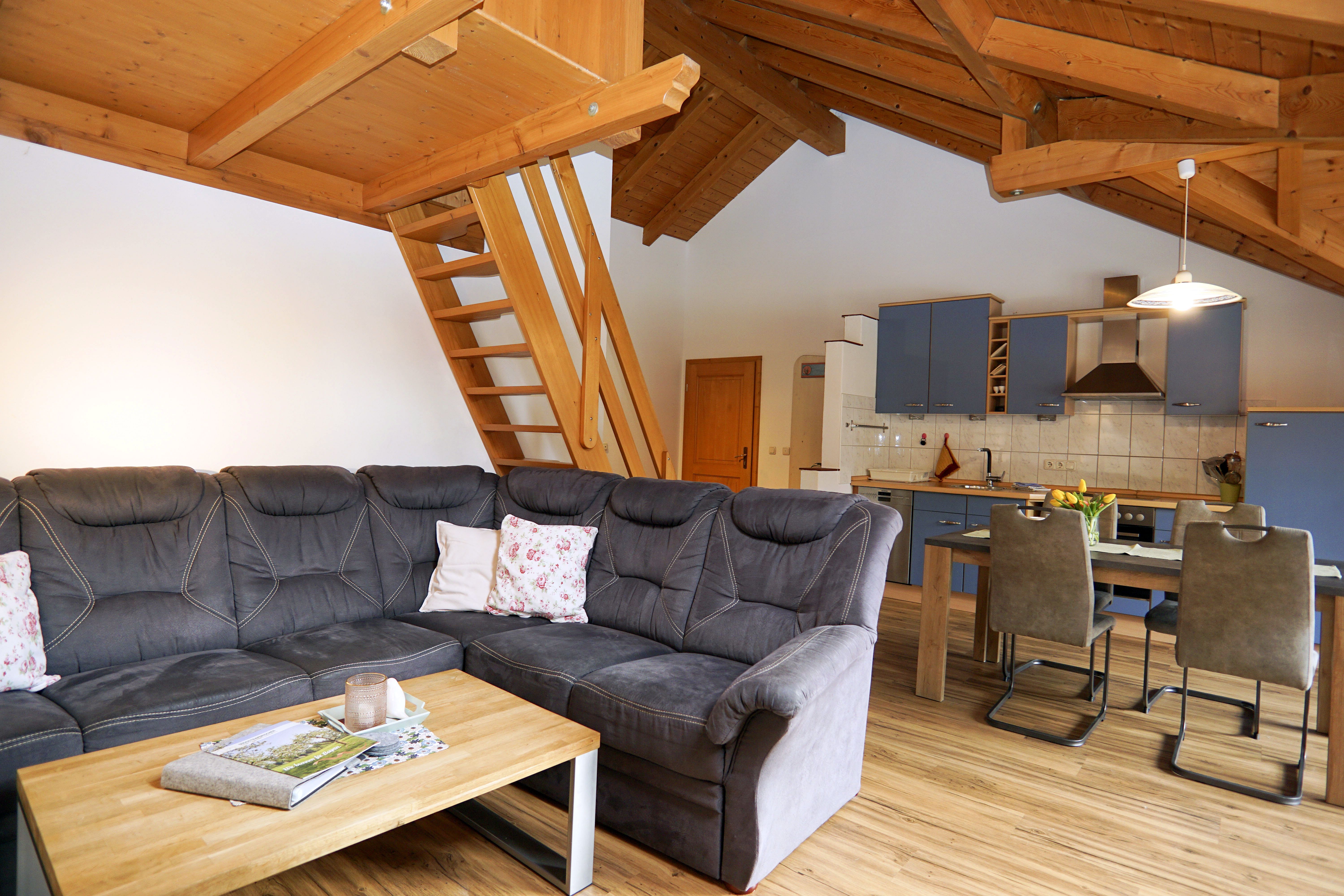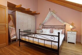 Die Ferienwohnung Holunder im Dachgeschoss (55m²) bietet Platz für 2 Personen. Die Wohnung verfügt über ein separates Schlafzimmer mit einem Doppelbett. Das Bad ausgestattet mit WC, Dusche, Föhn und Handtücher.
