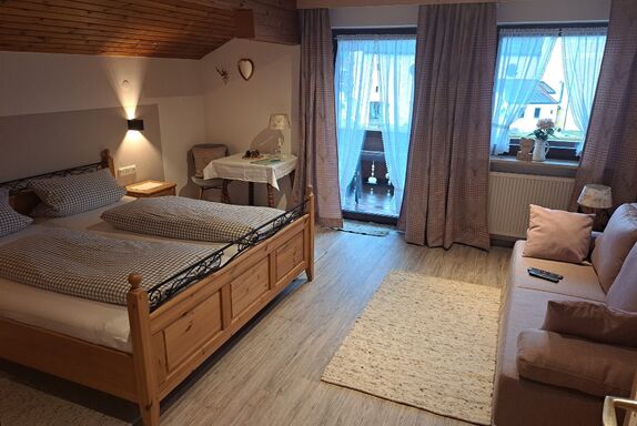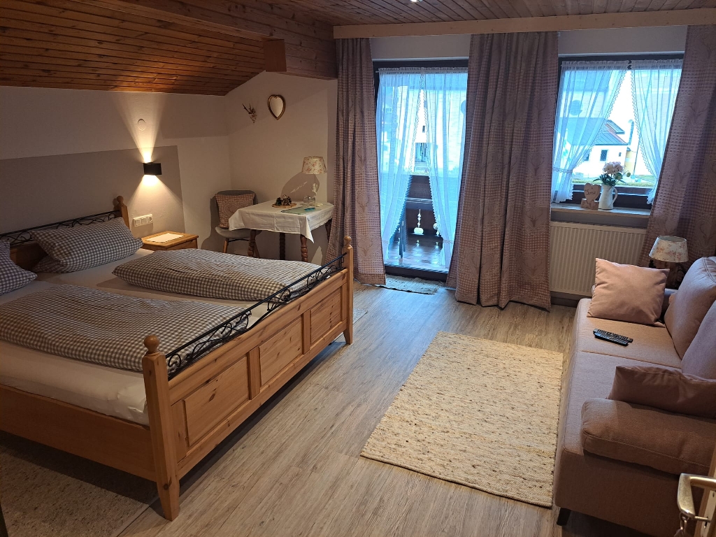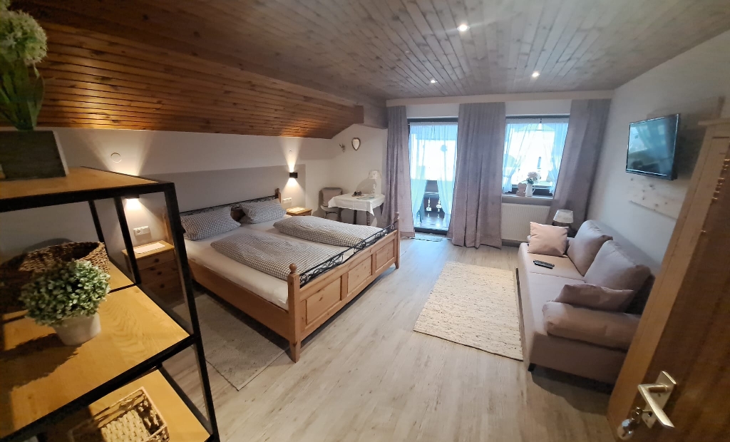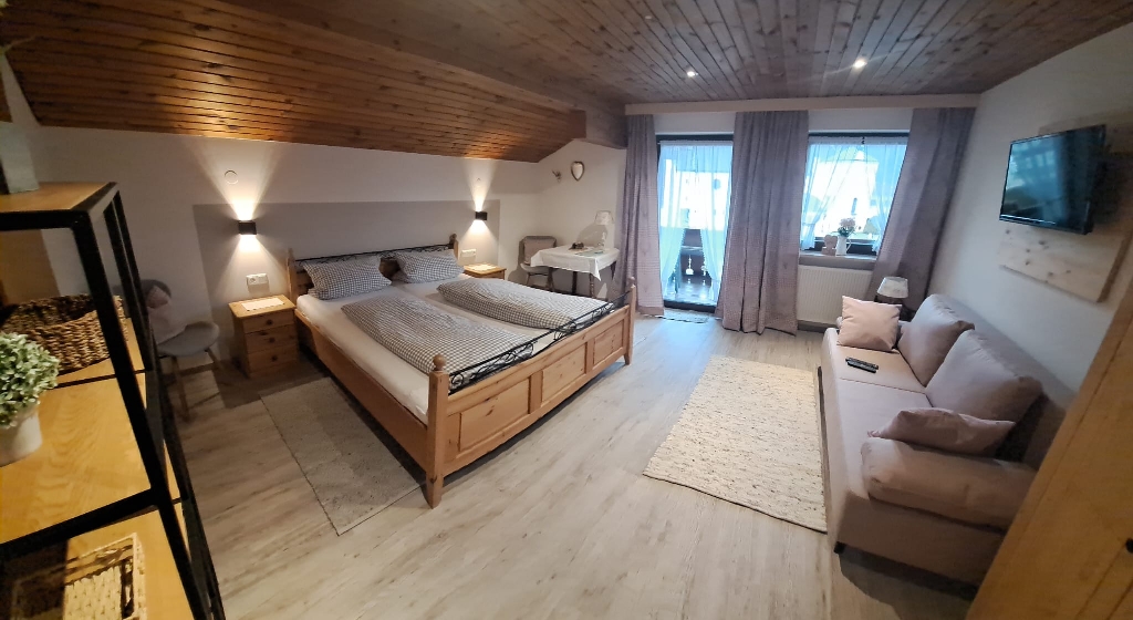 Unser schönes und gemütliches Familienzimmer ist im Landhausstil eingerichtet und bekam im Dezember 2023 ein upgrade. Ausgestattet ist das Zimmer mit einem Doppelbett, verstellbaren Lattenrost, Sitzgruppe, möblierten Balkon, Flachbild TV, WLAN, Radio, Dusche/WC und einem Sofa ,ausziehbar. Dieses wird als zusätzliches Bett angeboten. Ebenso ist Platz für ein Babyzustellbett. Vom Balkon aus haben Sie einen herrlichen Blick auf die Berge. Mit dem Zimmernamen möchte ich Sie auf die Dalsen-Alm hinweisen. Nur knapp 6 km von hier starten Sie in Schleching-Mühlau zu einer Wanderung über ein wunderschönes Almengebiet mit Einkehrmöglichkeit. Unsere Liegewiese und Terrassen stehen allen Gästen zur Verfügung. Reichhaltiges Frühstück in unserem gemütlichen Frühstücksraum.
