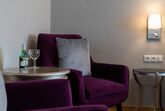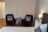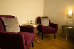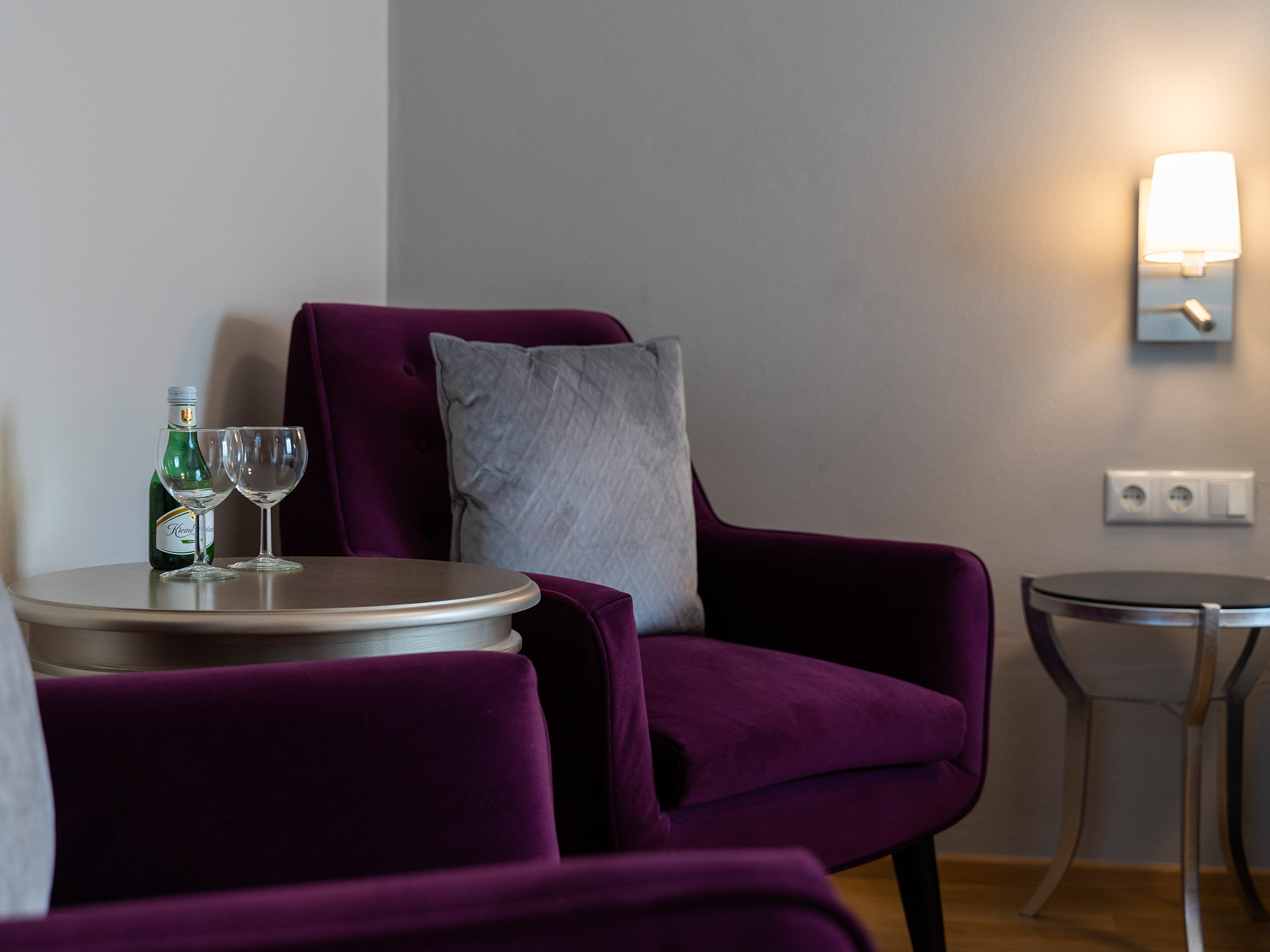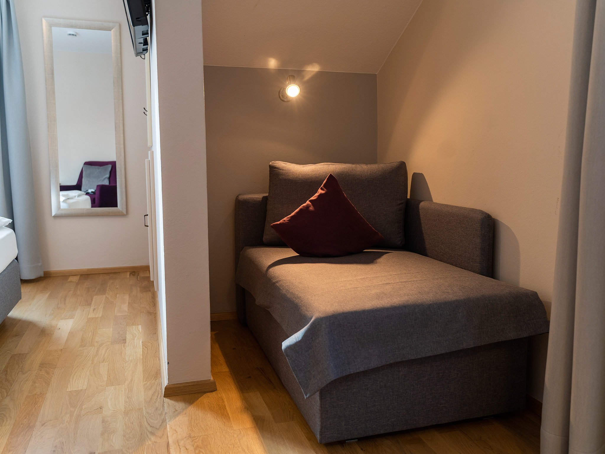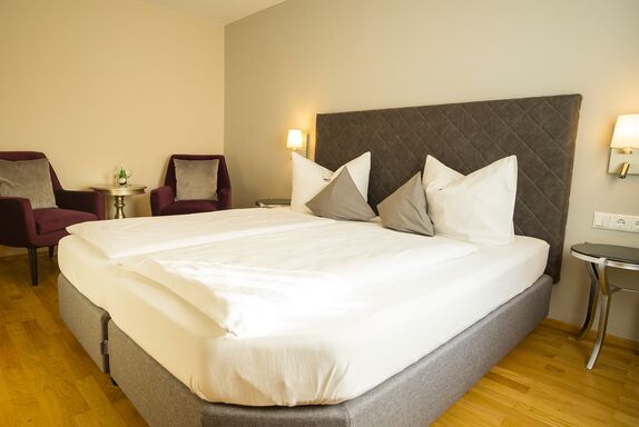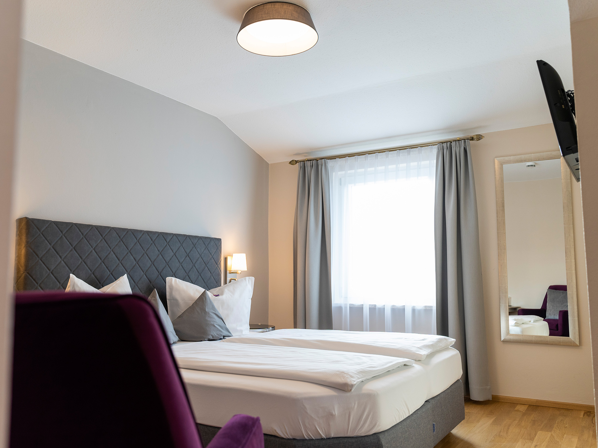 Großzügige Doppelzimmer mit Blick in Richtung See, in den Obstgarten und auf das herrliche Panorama der Chiemgauer Alpen.