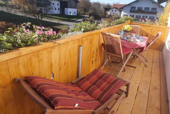 Die liebevoll ausgestattete 4-Sterne-Ferienwohnung Sonnenseite im 1. Obergeschoss verfügt über zwei Schlafzimmer. Die Nichtraucherwohnung ist ganz bequem über einen separaten Eingang zu erreichen. In der urigen Stube zieht der absolut kindersichere Kaminofen alle Blicke auf sich und sorgt in der kalten Jahreszeit für wohlige Wärme. Die Echtholzdecke, die handgeschmiedeten Beschläge, die Wanduhr aus Apfelbaumholz und das 100 Jahre alte Leinen vermitteln echtes Wohlfühlambiente und stehen in spannendem Kontrast zu den modernen Küchengeräten. Der große sonnige Balkon mit Balkonmöbeln und herrlicher Aussicht ins Grüne lädt dazu ein, das Familienfrühstück ins Freie zu verlagern.