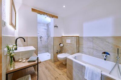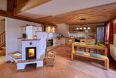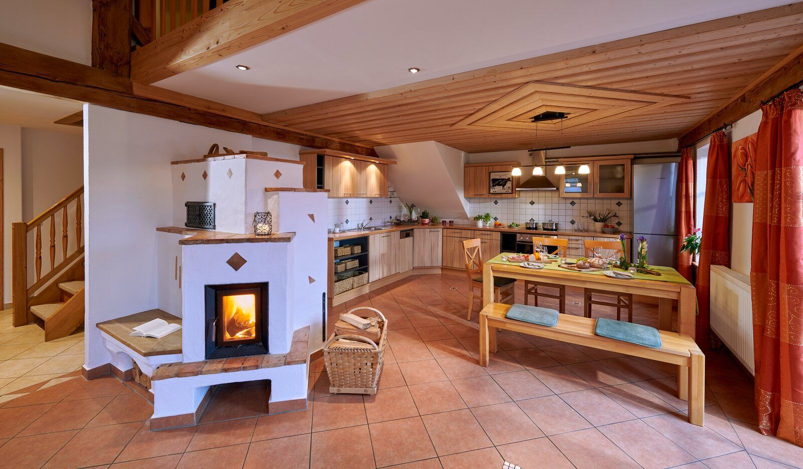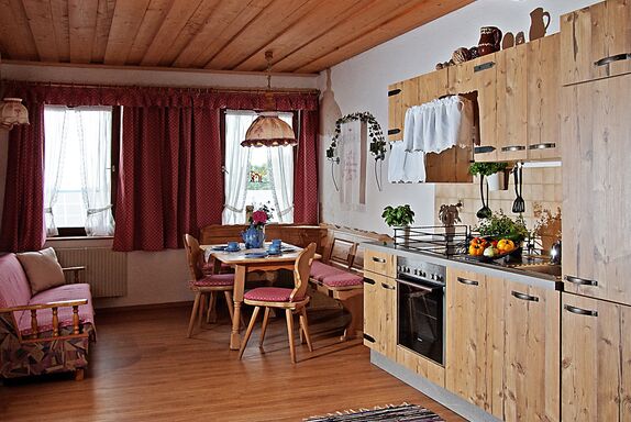 Die geräumige 4-Sterne-Ferienwohnung Schöne Aussicht befindet sich im 1. Obergeschoss des Bauernhauses. Die Nichtraucherwohnung punktet mit zwei Schlafzimmern und ist über einen separaten Eingang erreichbar. Handgeschmiedete Beschläge, die Echtholzdecke, das 100 Jahre alte Leinen und die rustikale Küchenzeile verleihen der Essküche einen besonders heimeligen Charme. Dazu tragen auch das bequeme Bauernsofa und die stilvolle Essecke bei. Vom Balkon aus bietet sich eine traumhafte Aussicht mitten ins Grüne.