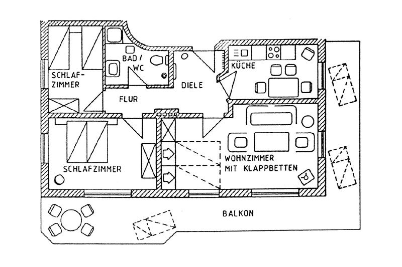 Die große Ferienwohnung 2 verfügt neben zwei separaten Schlafzimmern auch über eine großzügige Küche, die voll ausgestattet ist. Auf dem großen Balkon lässt es sich herrlich entspannen und genießen.