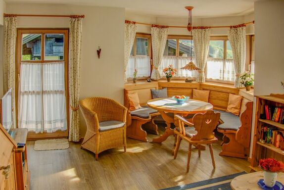 Sehr gemütliche, im alpenländischen Stil eingerichtete 2-Zimmerwohnung mit Balkon. Küche mit E-Herd (Backofen), Geschirrspüler, Kühlschrank mit Gefrierfach, Toaster, Eierkocher, Wasserkocher, Kaffeemaschine, Hund erlaubt