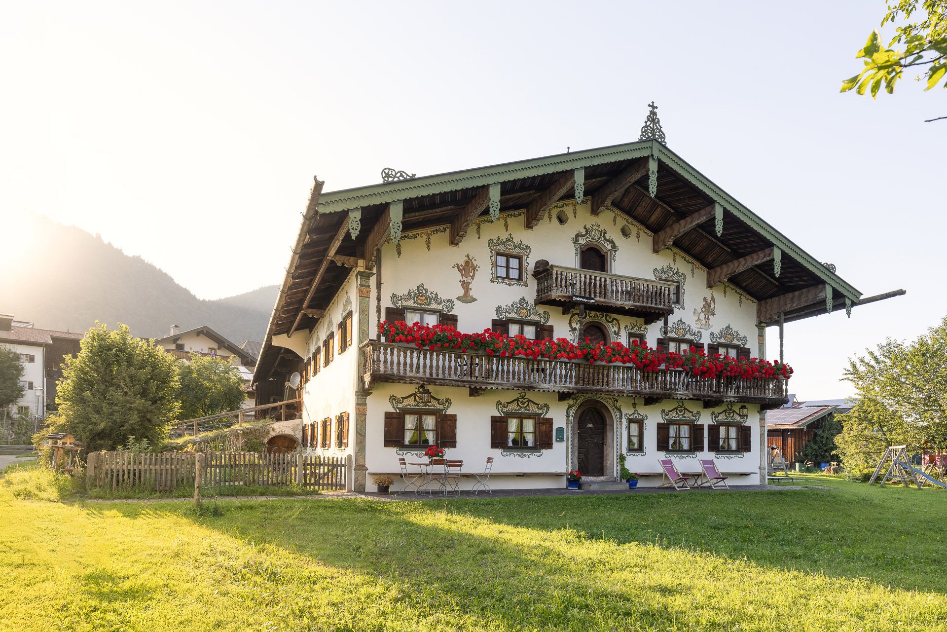 In ruhiger, sonniger Lage, mit Bergblick erwarten Sie die Nichtraucher-Ferienwohnungen am Schwabenbauernhof. Ein separater Gästeaufgang führt Sie zu den Wohnungen in der 1. Etage. Die Wohnungen sind ausgestattet mit: Safe, Sat-Flat-TV, CD-Radio-Wecker, Föhn, Kosmetik, und Mikrowelle. Den Balkon erreichen Sie über den Flur. Ferienwohnung Enzian ist mit einer Spülmaschine ausgestattet. Kostenloses W-LAN, Parkplatz und Carports direkt am Haus. Die Sauna im Nebenhaus kann einmal pro Woche für 2 Stunden kostenlos genutzt werden, weitere Besuche können dazu gebucht werden. Zu Fuß erreichen Sie in wenigen Minuten den Ortskern und Bahnhof.