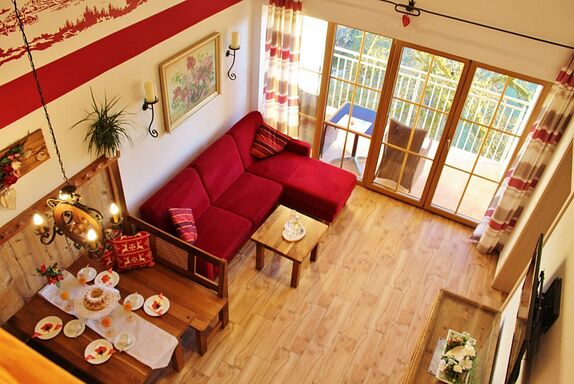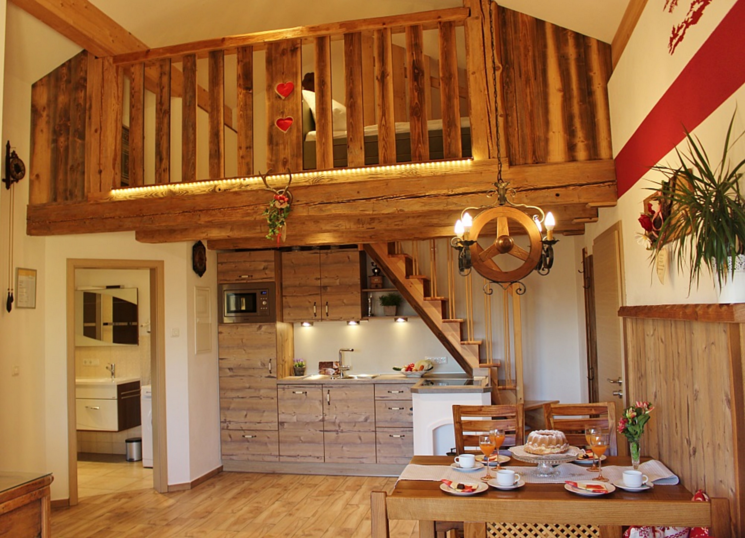 Unsere hochwertige 5 Sterne Ferienwohnung Hüttenzauber befindet sich im 2. Stock und bietet mit Ihren ca. 65 m² genügend Platz für 2-5 Personen. Die liebevoll eingerichtete Ferienwohnung verfügt über zwei getrennte Schlafzimmer, einer Empore im Wohnraum sowie einem großen Balkon mit Blick auf die Bayerischen Alpen. Die hochwertig ausgestattete Wohnung ist in einem alpenländischen Stil eingerichtet, die keine Wünsche offenlässt.