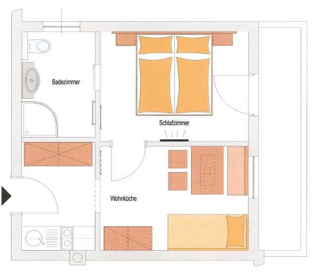 2-Raum-Appartement für 2 Pers. mit 31 m², 1 separates Schlafzimmer mit TV, 1 Wohnraum mit Couch und TV, optisch getrennte Küche,