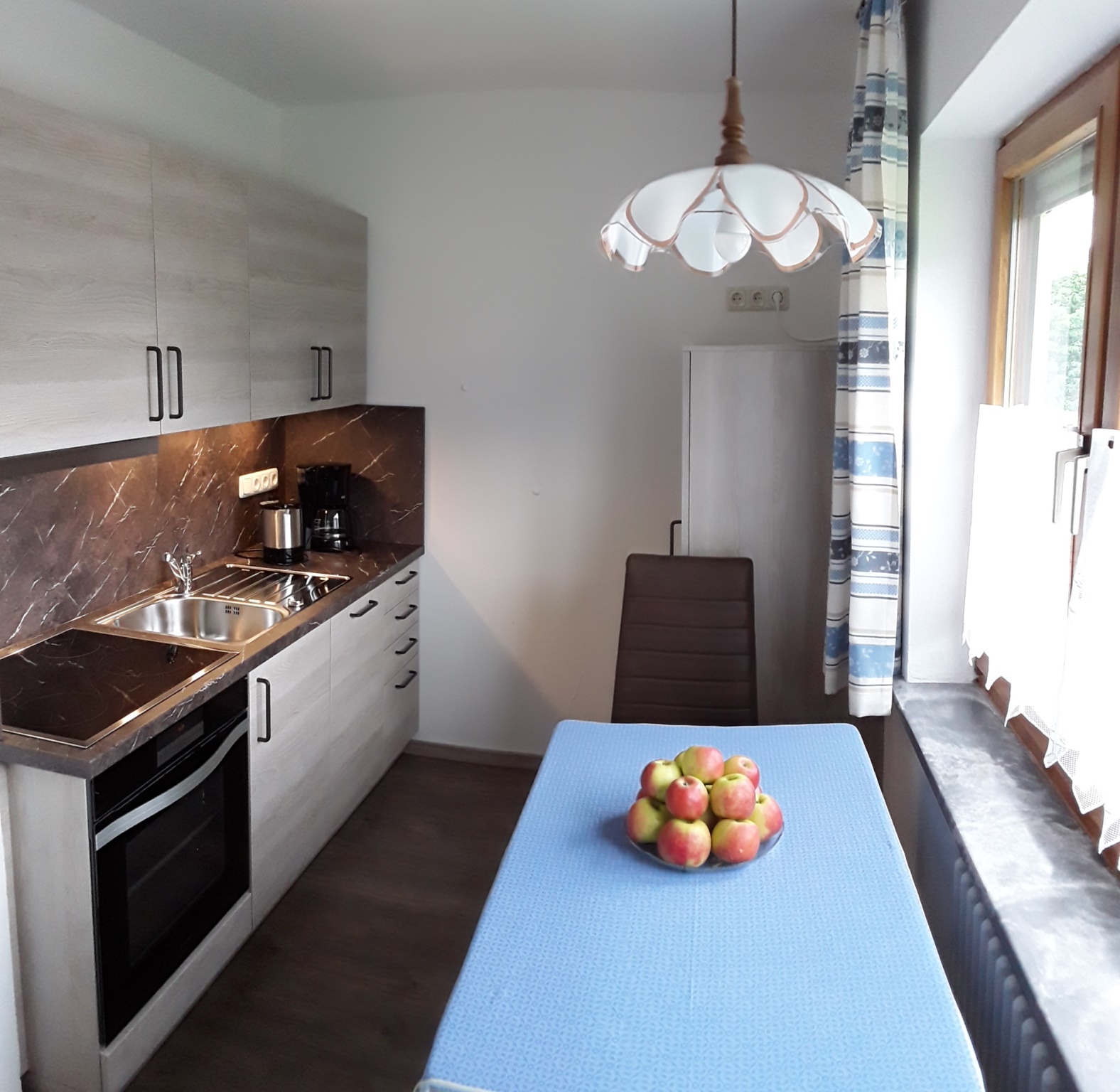 Gepflegte Ferienwohnung (50qm) mit Balkon und getrenntem Wohn/Schlafraum im ersten Obergeschoss. Schlafzimmer mit Doppelbett und rückengerechten Matratzen, Wohnzimmer mit SAT-TV, Radio und DVD-Player. Kostenloses WLAN. Separate Küche neu seit April 2019, ausgestattet mit Spülmaschine, Induktionskochfeld und Backofen, Kühlschrank mit Gefrierfach, Badezimmer mit Dusche, Fön, Handtücher und Toilettenartikel. Kinderbett und Hochstuhl auf Wunsch. Anreise von 15:00 - 18:00 Uhr und Abreise 06:00 - 10:00 Uhr. Sollte die Anreise nach 18:00 Uhr kontaktieren Sie uns bitte.