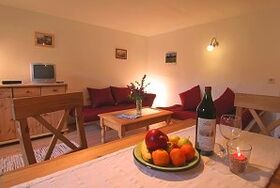 Kühlschrank. Wohn-/ Schlafzimmer mit Eckbank, großem Tisch, eine Kombiliege (Erwachsene),