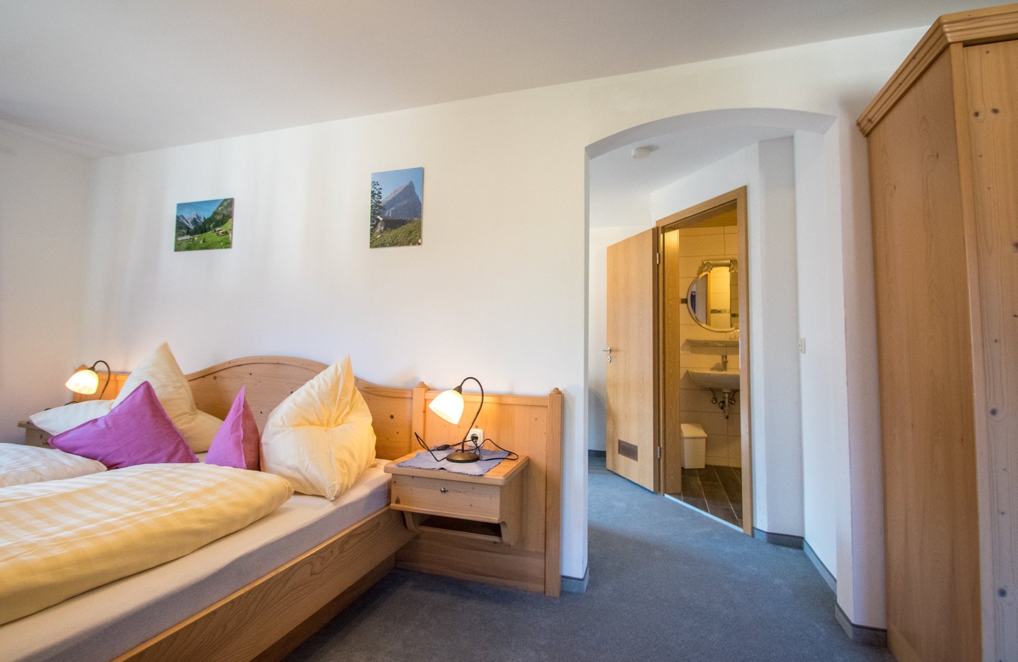 Alle unsere Zimmer sind mit Dusche und WC sowie einem Fernsehgerät ausgestattet. Die Einrichtung aus Massivholz Möbeln ist gemütlich und rustikal, typisch für unsere Region. Der umlaufende Balkon bietet von jedem Zimmer einen Blick auf die Ramsauer Berge: Watzmann, Hochkalter und das Massiv der Reiteralpe umgeben das Möslerlehen.