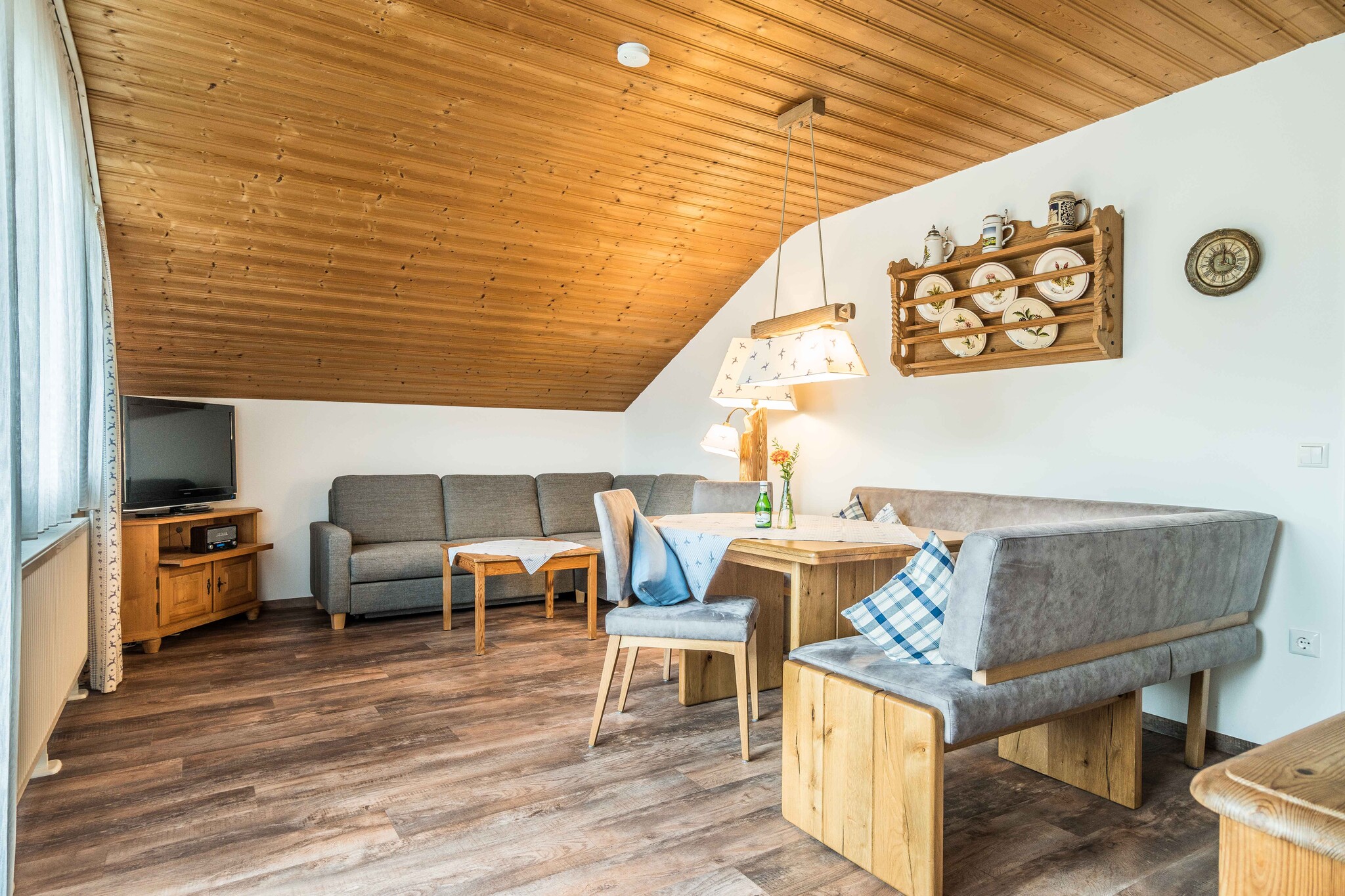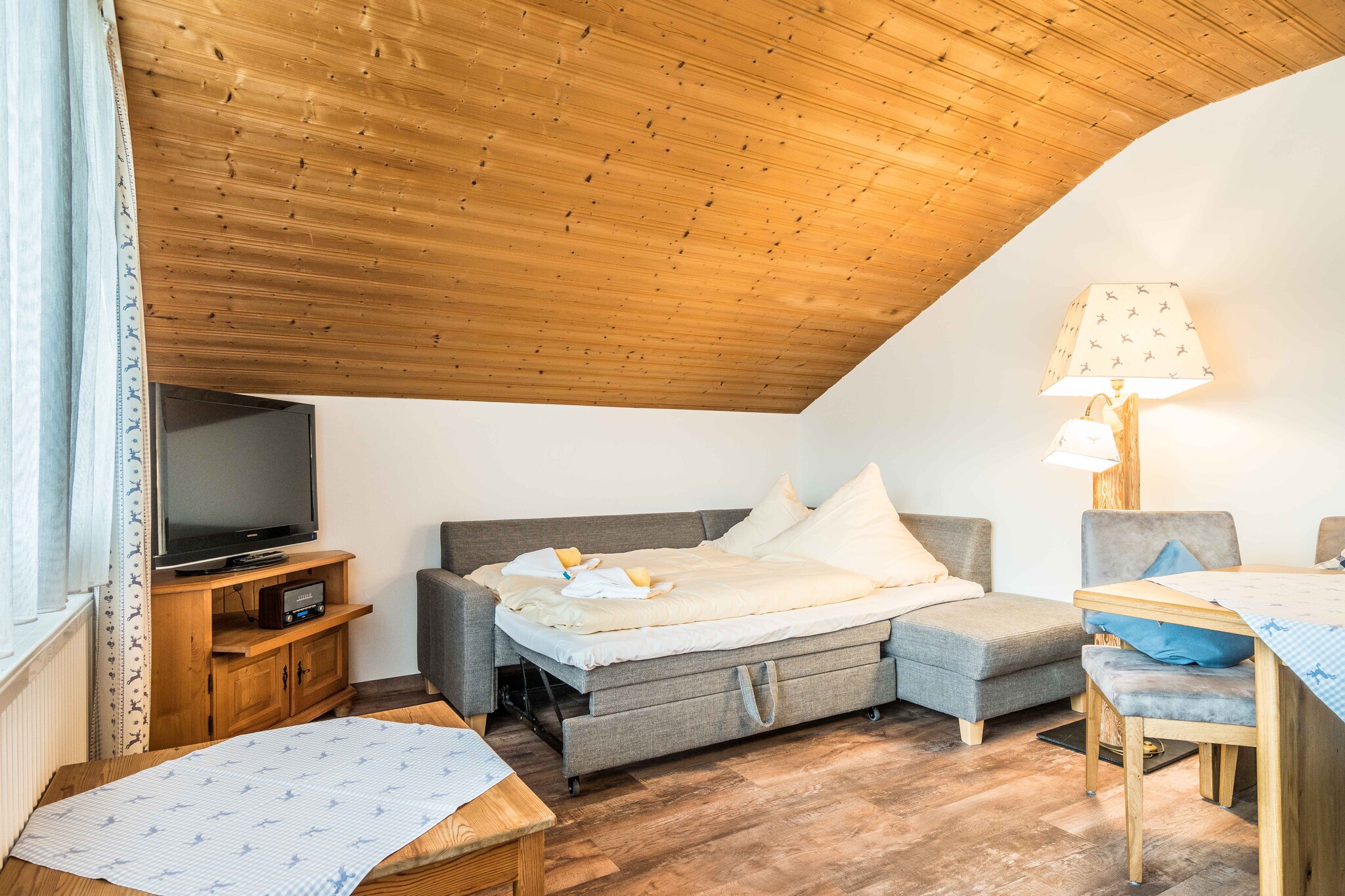 Die 2-Zimmer-Ferienwohnung - D8 - Klassik liegt im Dachgeschoss des D Hauses und bietet Platz für 1-5 Personen. (Bei einer Belegung mit 5 Personen werden die Kriterien der 3-Sterne-Klassifizierung nicht erfüllt). Sie verfügen im Schlafzimmer über ein bequemes Doppelbett (ca. 1,8 x 2 m) sowie ein Einzelbett (ca. 0,9 x 2 m). Die Couch im Wohnzimmer können Sie zu einer Schlafcouch für zwei Personen (ca. 1,8 x 1,9 m) umbauen. Über den Keller haben Sie einen überdachten Zugang zum Schwimmbad und Wellnessbereich. Vom Balkon haben Sie einen wundervollen Blick auf das Hocheck. Die Ferienwohnung verfügt über ein eigenes Bad mit Badewanne, Waschbecken und Toilette. In der Küche sorgt eine Geschirrspülmaschine für zusätzlichen Komfort. Die Wohnung ist Allergiker-freundlich, denn auf Teppichböden wurde verzichtet. Haustiere sind in dieser Wohnung auf Anfrage gestattet. Alle Ferienwohnungen haben gratis WLAN, einen Flachbild-TV, einen eigenen Tiefgaragen-Stellplatz und eine voll eingerichtete Küche mit Geschirrspüler.