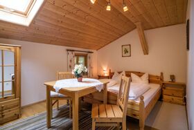 Die 100 qm große, sehr gemütliche und geräumige Ferienwohnung bietet Ihnen einen traumhaften Blick auf Wiesen, Wald und Berge. Die Wohnung ist mit einem Kaminofen ausgestattet und verfügt über drei separate Schlafzimmer, sowie einen gemütlichen Wohnbereich. Sie ist mit maximum 6 Personen belegbar. In unseren urgemütlich eingerichteten Ferienwohnungen fühlen sich Familien mit Kindern, aber auch Senioren besonders wohl. Ideales Gebiet für Mountainbiker, Berg- und Wanderfreunde. WLAN kostenlos.