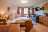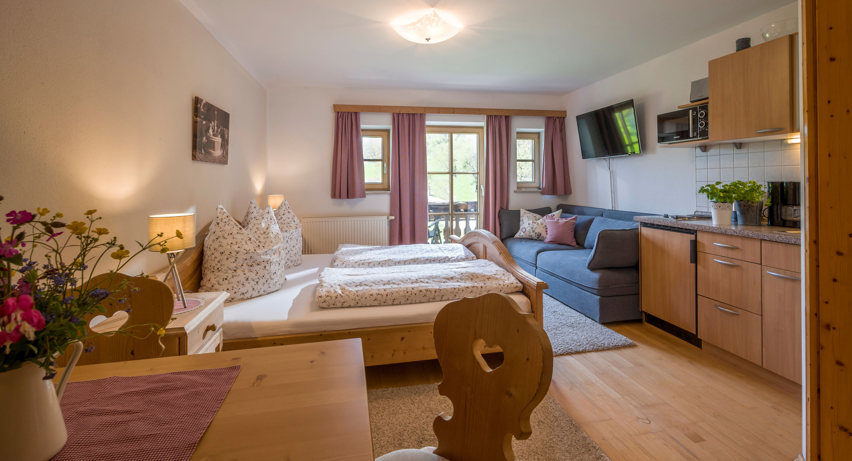 Unser 25 qm großes Wohlfühlappartement liegt direkt neben den beiden Ferienwohnungen Kaiserblick und Wildbarren im 2. Obergeschoss im Bauernhaus. Es bietet sich ideal für Großeltern an, die in der Nähe ihrer Familien in den Ferienwohnungen sein möchten, aber dann doch gerne über ein eigenes Bad, Kochgelegenheit und Wohnraum verfügen können. Des Weiteren wird unser Wohlfühlappartement (kombinierter Wohn-Schlafraum) gerne von Alleinreisenden mit Kindern gebucht, um diesen das erste Mal richtige „Bauernhofluft“ schnuppern zu lassen. Es verfügt über ein gemütliches, kleines, doch feines Einzimmer-Appartement für 2 Personen mit kombiniertem Wohn- und Schlafraum, Kochnische mit Plattenherd, Kühlschrank und Gefriereinheit, Wasserkocher, Toaster, Kaffeemaschine, sowie Couch und Essplatz. Das neu renovierte Badezimmer mit Dusche, Waschbecken, WC, Wäschekorb, Kosmetikspiegel, Fön, Badhocker. Des Weiteren bietet Ihnen das Appartement einen Safe, Radiowecker, Flat-TV, Kompaktanlage mit CD, W-LAN kostenlos, Stellplatz für PKW und Südbalkon mit Gartenstühlen und Tisch.