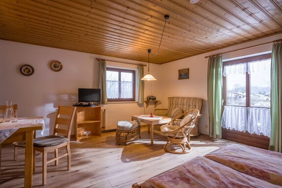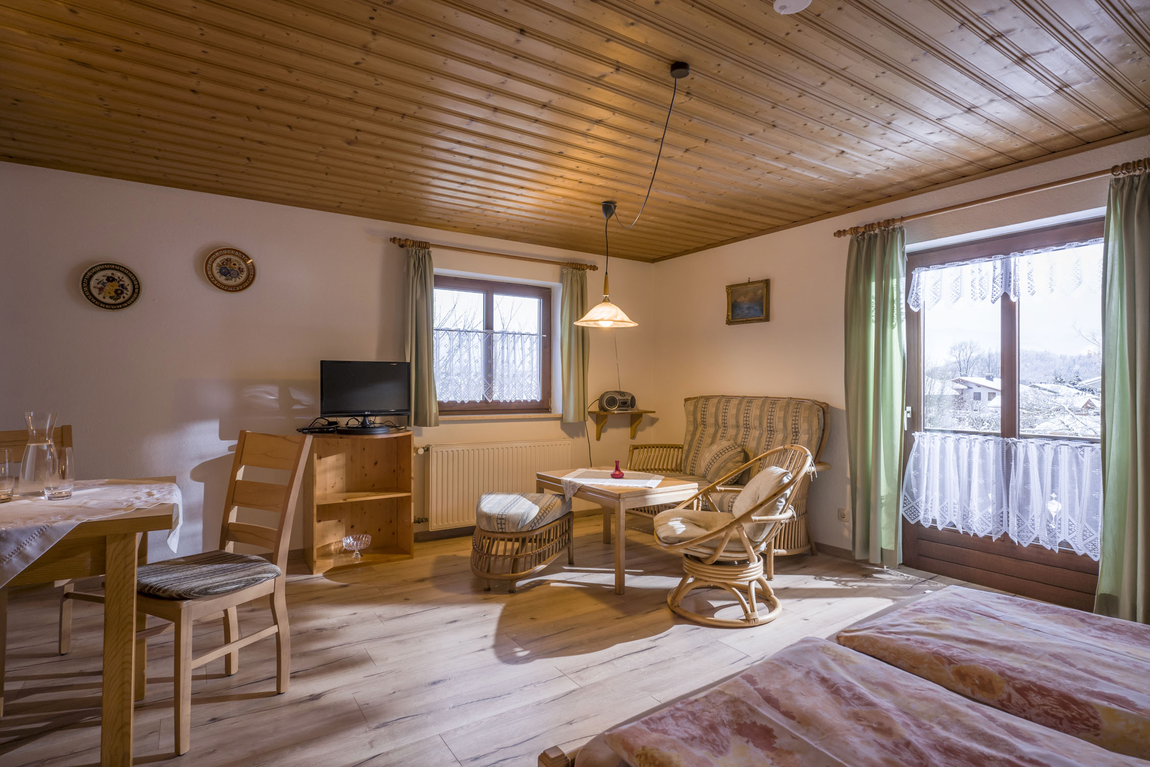 Die gemütliche 40 qm große Ferienwohnung befindet sich im 1. Obergeschoss. Sie verfügt über ein Wohn/Schlafzimmer mit Küche und Bad/WC. Der Balkon nach Osten und Süden bietet Ihnen einen traumhaften Blick und lädt zum Entspannen ein. Sämtliche Wohnungen verfügen über kostenfreies WLAN. Sehr ruhige, sonnige Lage am Ortsrand in unmittelbarer Nähe zum Auerbach. Ca. 3.000 qm großer Garten, herrlicher Blick zum Kaisergebirge und die umliegenden Berge.