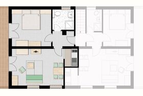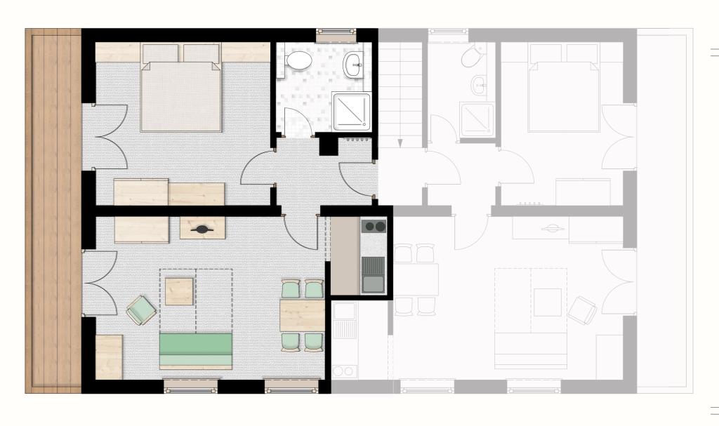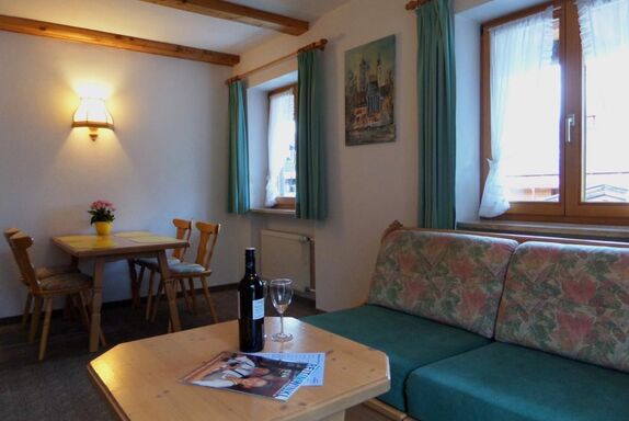 Diese Zwei-Raum Ferienwohnung ist ca. 45 m² groß und hat einen Wohn-/Schlafraum mit kleiner Küche, ein separates Schlafzimmer, ein Bad mit Dusche und einen schönen überdachten Balkon mit Bergblick. Die Wohnung ist komplett ausgestattet und beinhaltet noch einen Fernseher, einen CD-Player und ein Wecker.