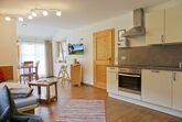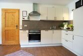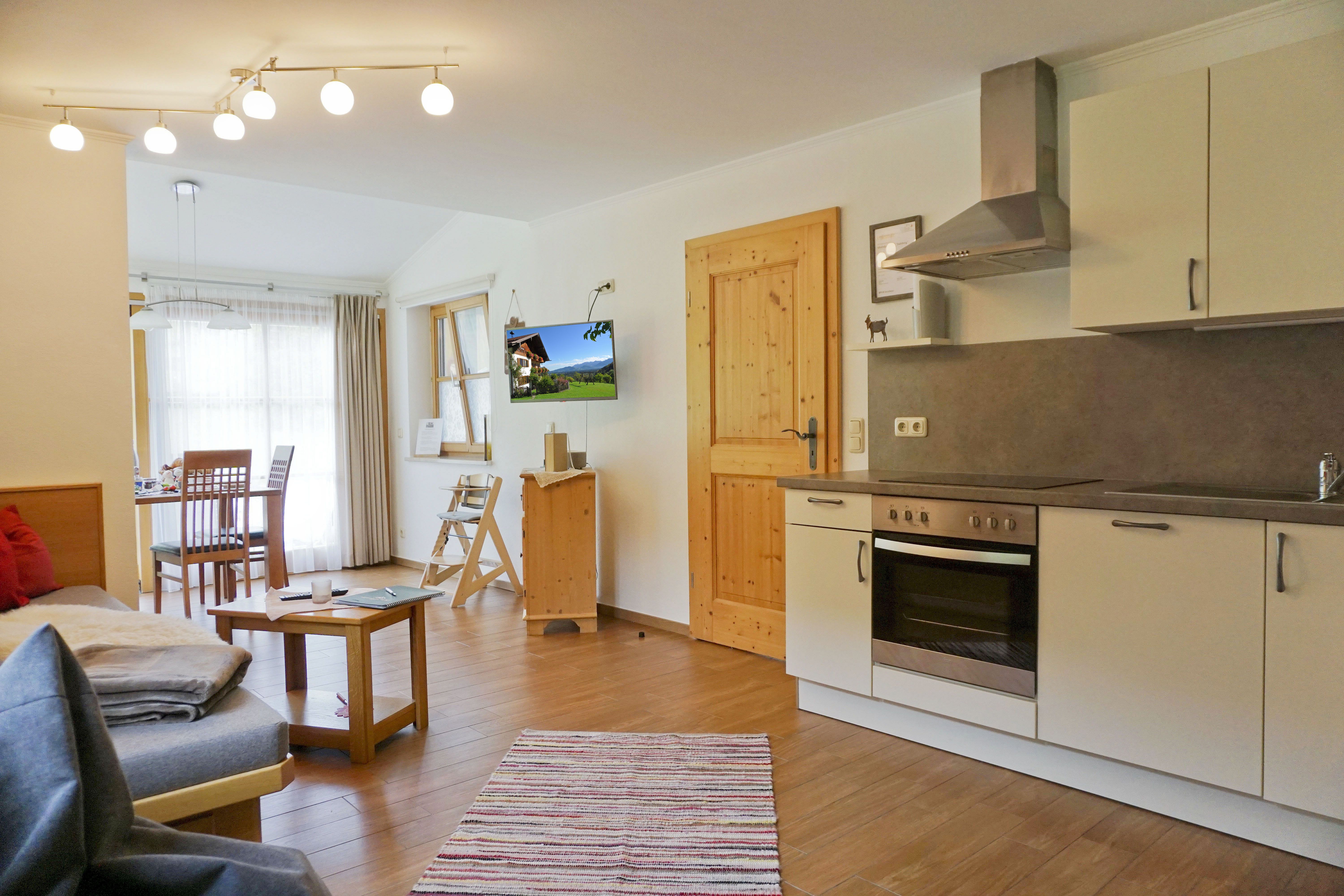 Wohnraum mit gut ausgestatteter Küchenzeile, Spülmaschine, Mikrowelle, TV, Autostellplatz.