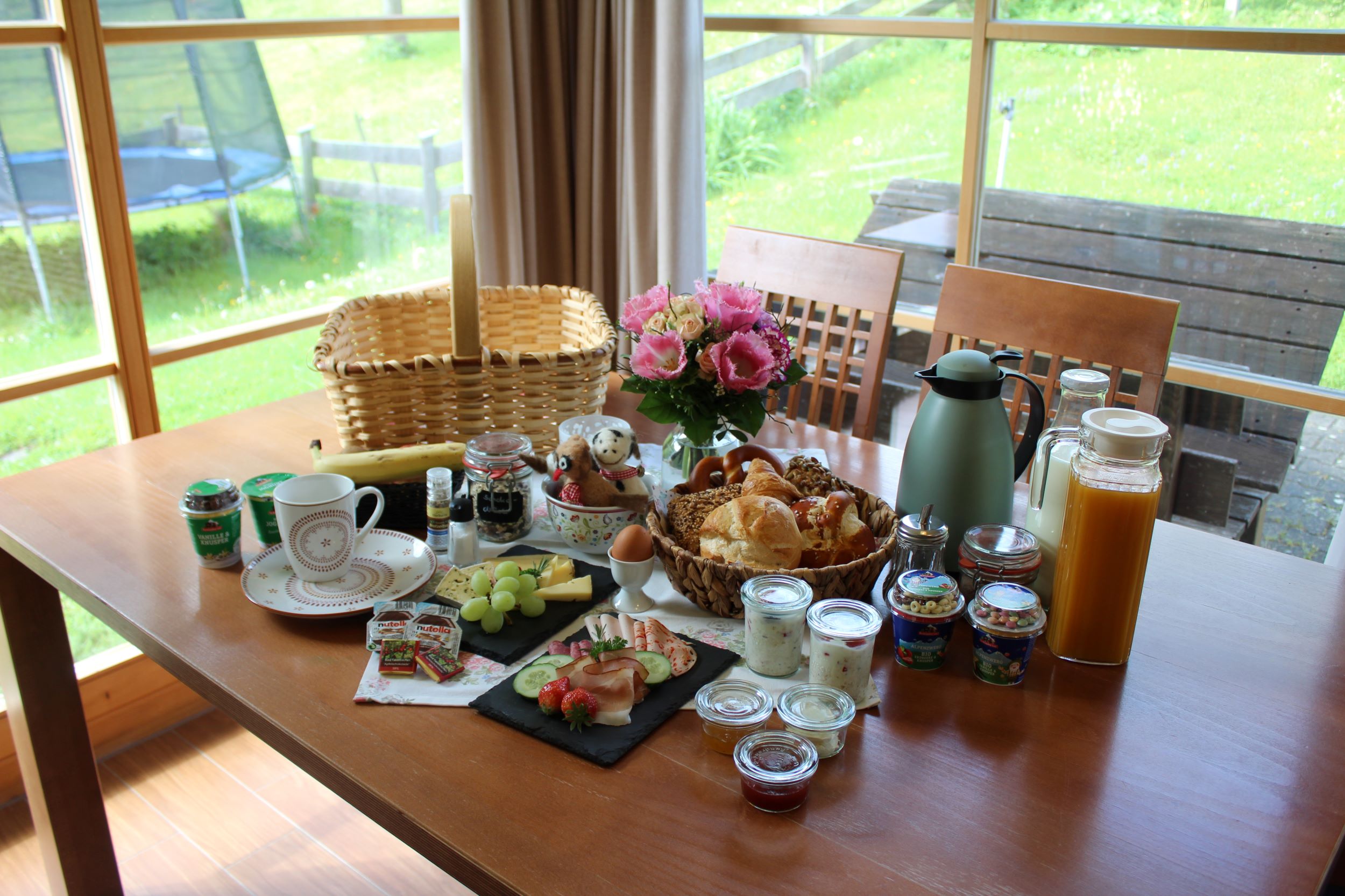 Frisch duftende Semmeln / Brezn oder Brot. Wurst, eine feine Käseauswahl aus der Region, Joghurt der Berchtesgadener Molkerei, hausgemachte Marmelade.