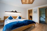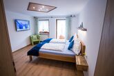 Schlafzimmer: Doppelbett, Bettwäsche, Sessel, Kleiderschrank, Tresor, SAT-TV.
