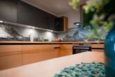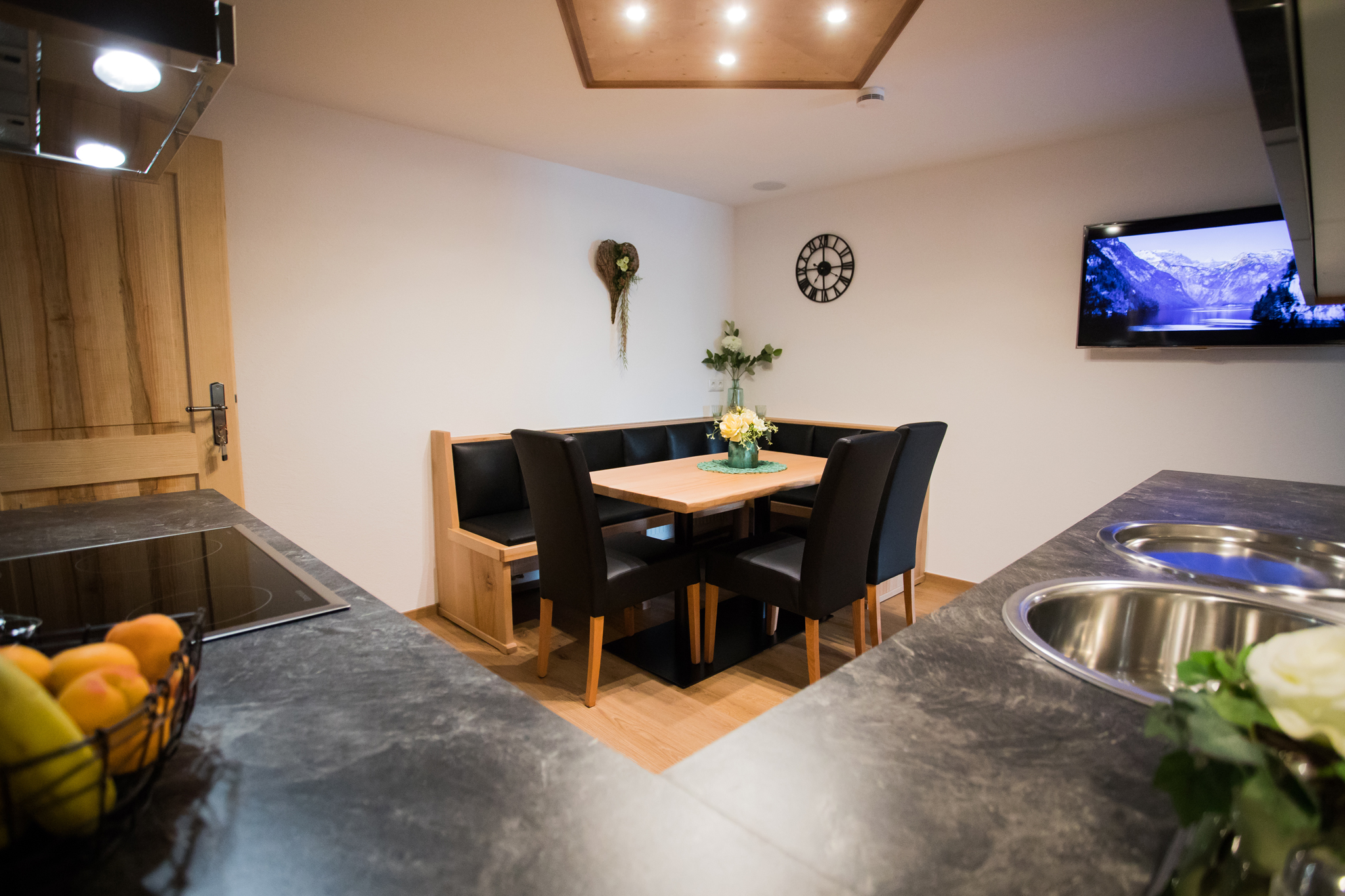 Küche: Küchenzeile mit Spüle, Spülmaschine, Ceranvierplattenherd, Backofen, Kühlschrank mit kleinem Gefrierfach, Wasserkocher, Kaffeemaschine, Mixer, Toaster, Geschirr, Gläser, Kochtöpfe, Besteck usw., Eckbank mit drei Sitzplätzen, zwei Stühle und Tisch, Deckenlautsprecher über Bluetooth Radio bedienbar.