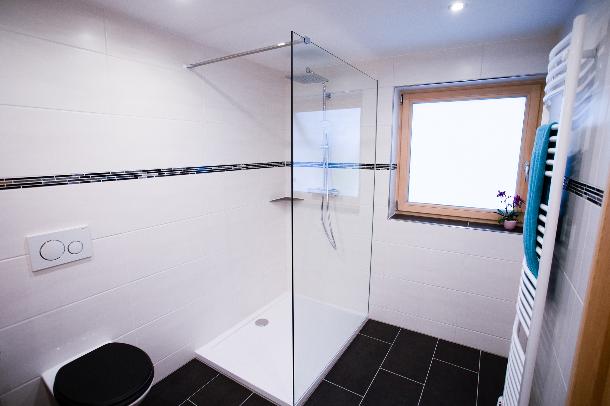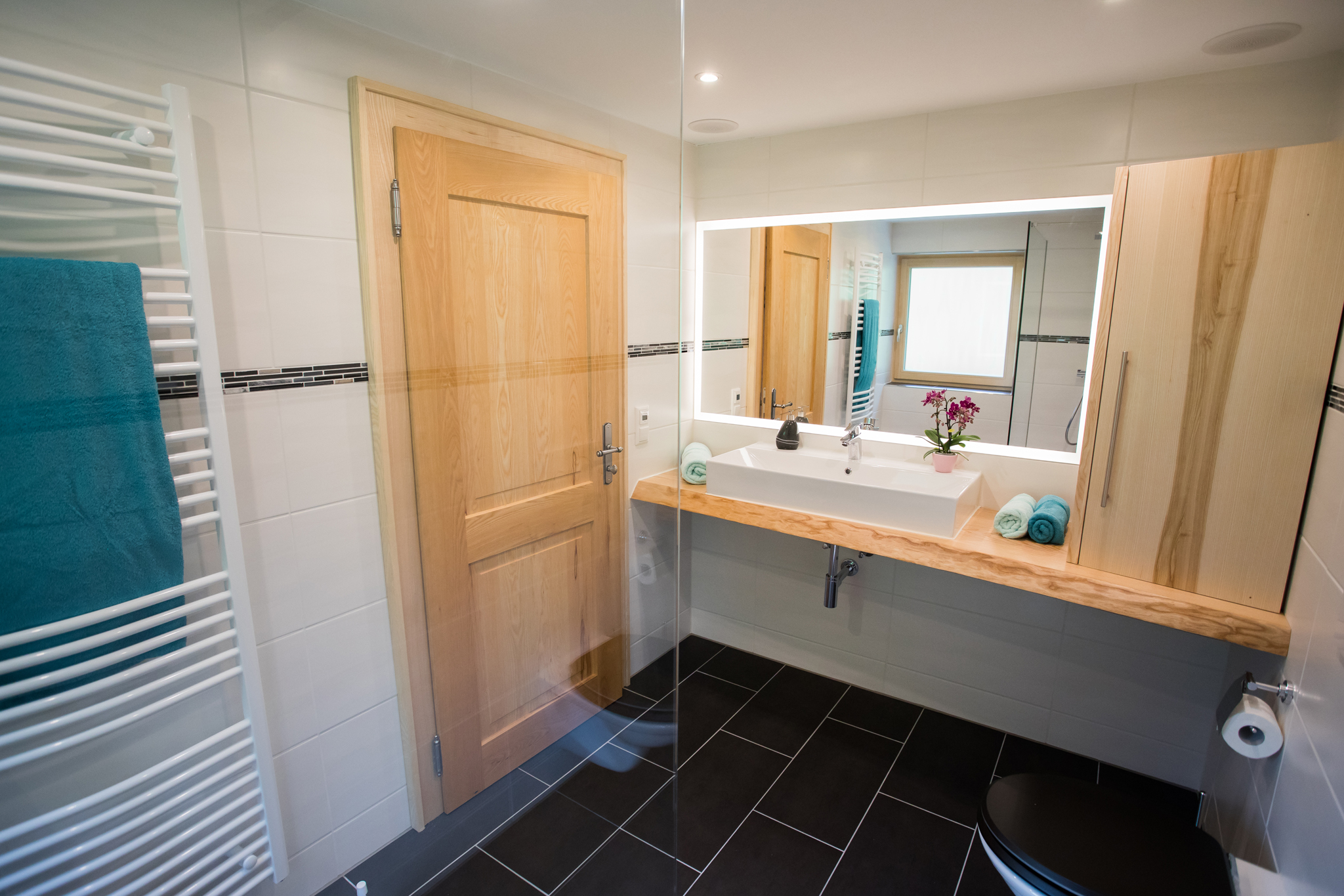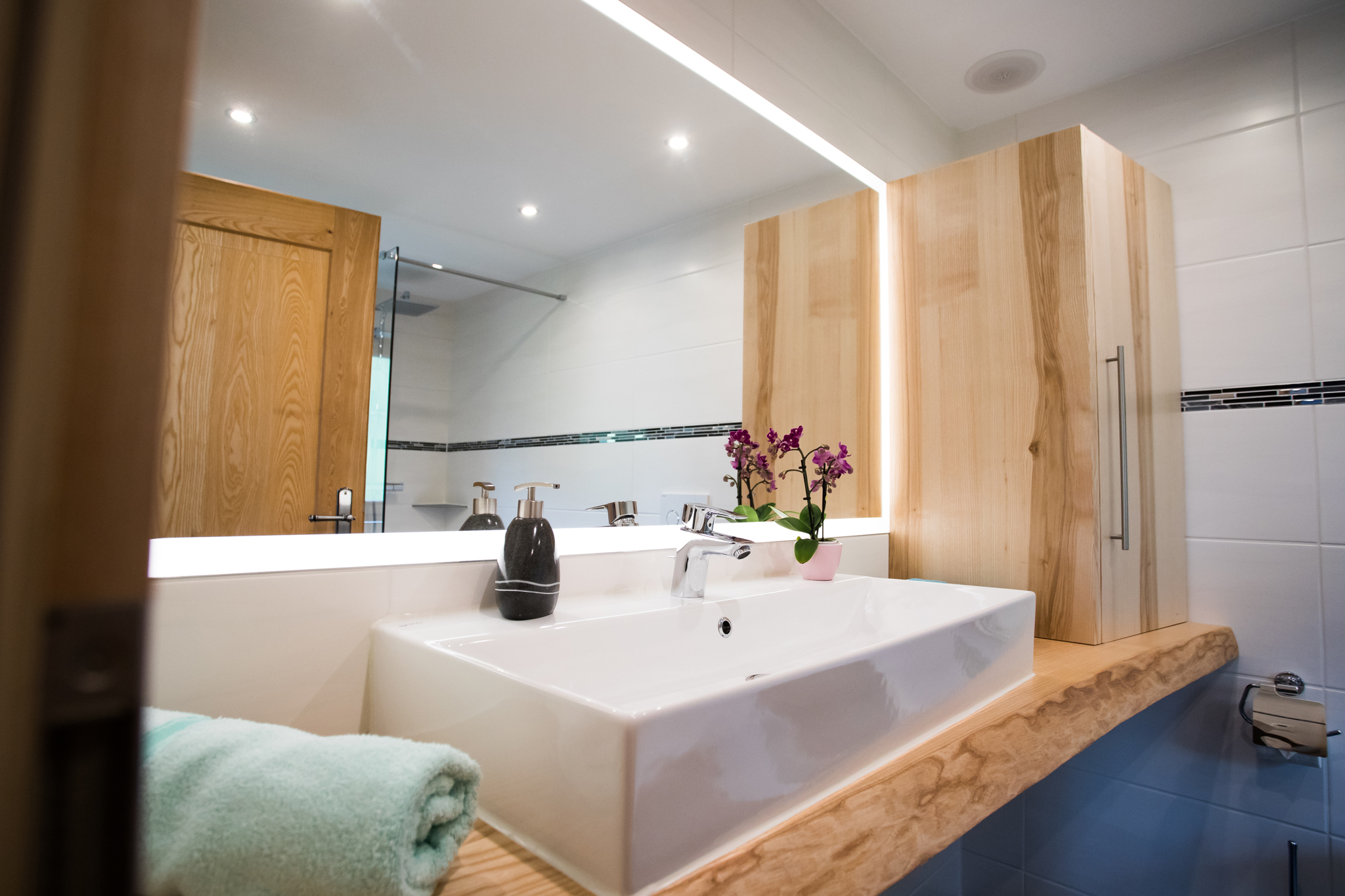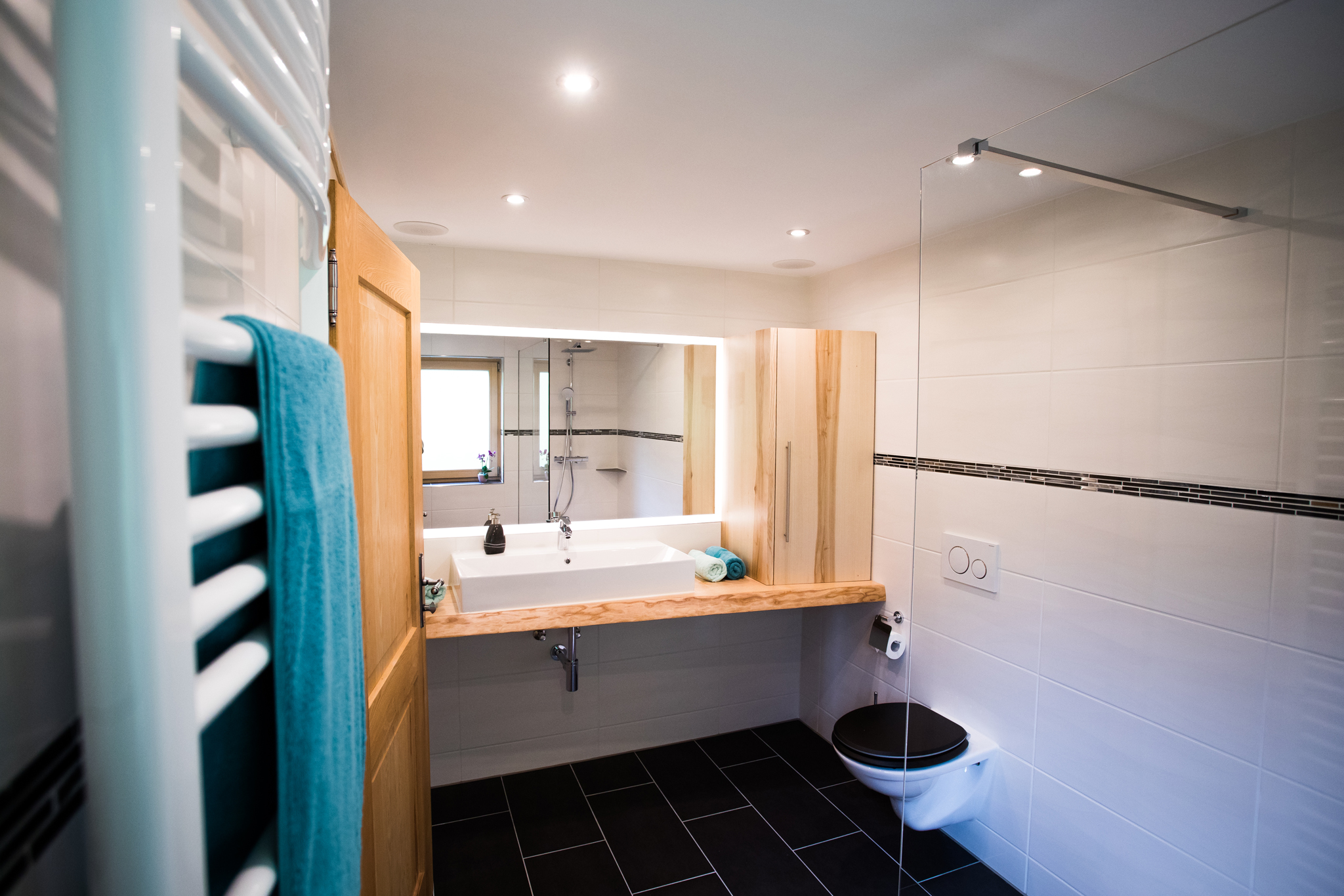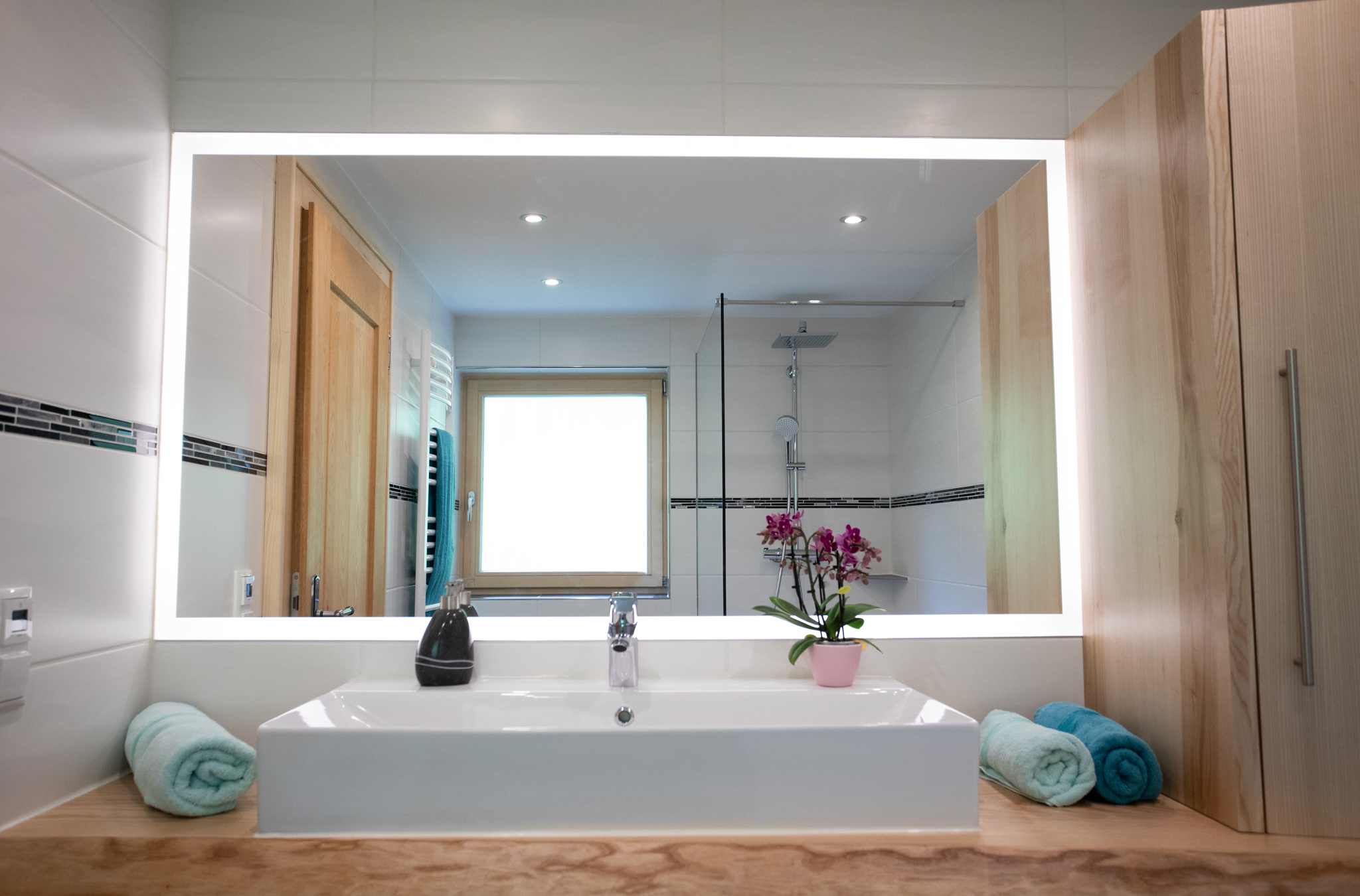 Badezimmer: Außenfenster, Regendusche, WC, Föhn, Kosmetikspiegel, Ablagefächer, Deckenlautsprecher über Bluetooth Radio bedienbar, pro Person ein Handtuchset (1x Klein und 1x Groß).