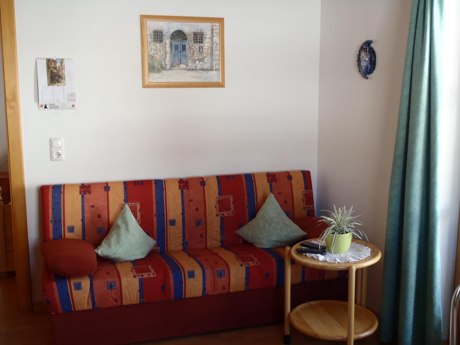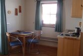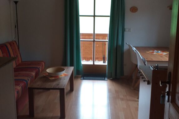 Die Wohnung Blaueis hat ein Schlafzimmer, einen Wohnraum mit Küchenecke, ein kleines Bad und einen Balkon.