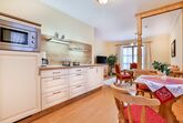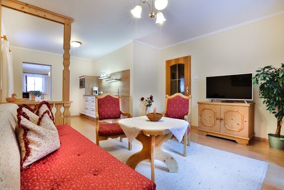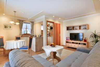 Komplett ausgestattete Ferienwohnung für 2 Personen mit Balkon und getrenntem Wohn- und Schlafzimmer, zum Osten und Westen gelegen. - 56 qm Wohnfläche - Stock - Wohnzimmer mit Flat-TV, Sofa und separater Essecke - separates Schlafzimmer mit Flat-TV - im Wohnraum integrierte Küche (mit Geschirrspüler, ****Kühlschrank, 4-Platten-Cerankochfeld, Mikrowelle, Kaffeemaschine, Kaffee-Pad-Maschine, Wasserkocher, Eierkocher, Toaster) - 2 Badezimmer mit Dusche/WC -2 Balkone (1 x Ost- und 1 x Westbalkon, insges. 8,5 m²)