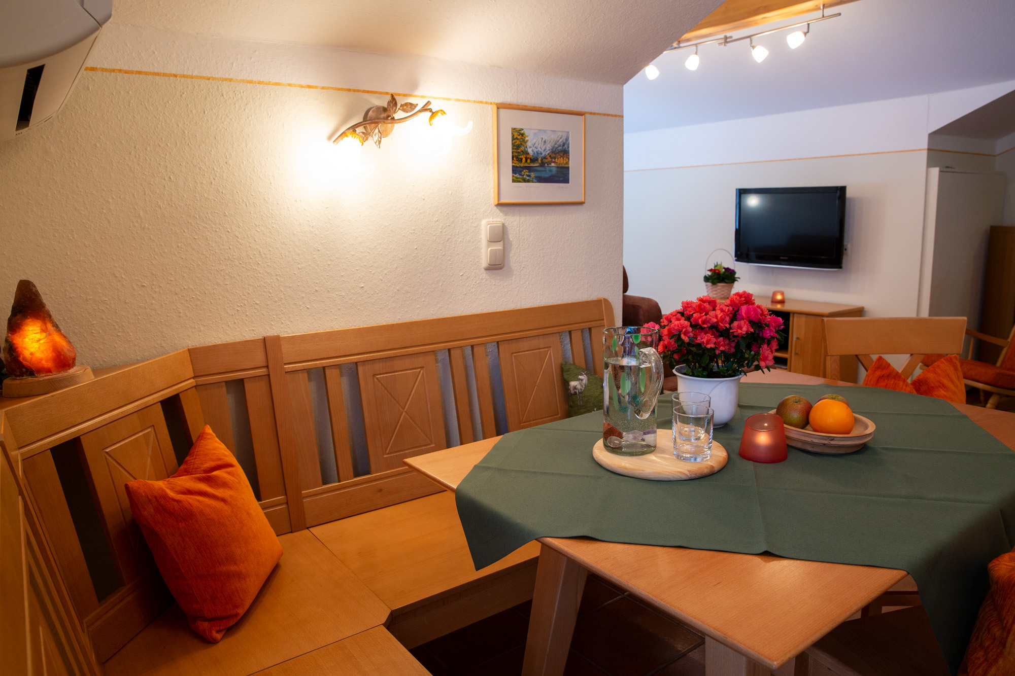 Sehr ruhige, hochwertig ausgestattete 52 m² große Fewo für 2 Personen. Zwei Balkone mit Gartenmöbel und Panorama-Bergblick für erholsamen Aufenthalt. Gemütlicher Wohnbereich mit ausziehbarer Sitzcouch/Schlafsofa, LCD-TV-Radio-Gerät, Wanderkarte bzw.-führer. Esstisch mit Eckbank. Küchenzeile komplett ausgestattet mit Geschirrspüler, Tiefkühlfach, Mikrowelle, Kaffeemaschine, Espressokocher, Toaster ect.. 1 separates Schlafzimmer mit Betten in Überlänge (2,20 m) mit Zirbenholz-Elementen, Bandscheibenmatratzen, Zudecken ebenfalls in Überlänge (2,20 m) und Bettwäsche, Dachfenster mit Regensensor - bei Bedarf: kontrollierte Wohnraumbelüftung. Dusche/WC mit Fön, Hand-, Dusch-, Badetüchern, Toilettenartikeln. Fußbodenheizung, Klimaanlage und Safe. Wir bitten um Verständnis, dass das Rauchen in der Ferienwohnung nicht gestattet ist, das Rauchen auf dem Balkon ist erlaubt.