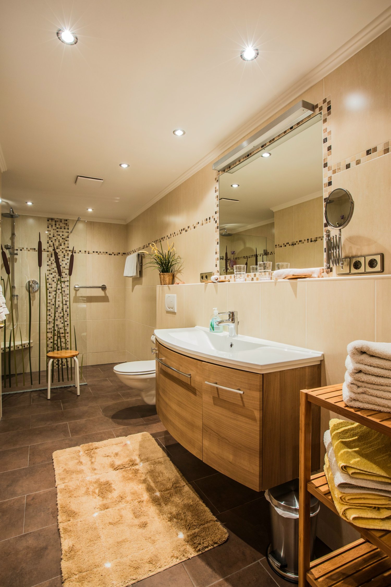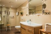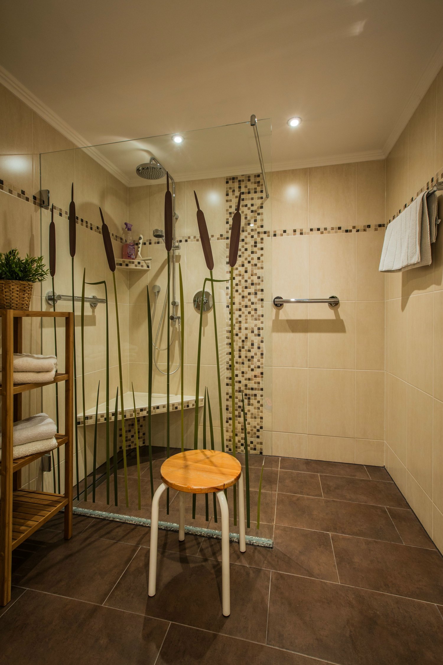 einem separatem Schlafzimmer mit Doppelbett (2 m) sowie Schlafcouch für 1 Person einem Bad mit WC, behindertengerechten Dusche sowie Waschbecken und Fußbodenheizung,