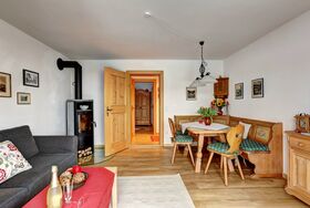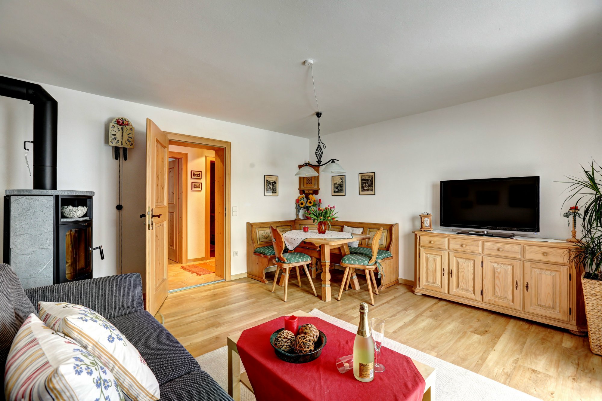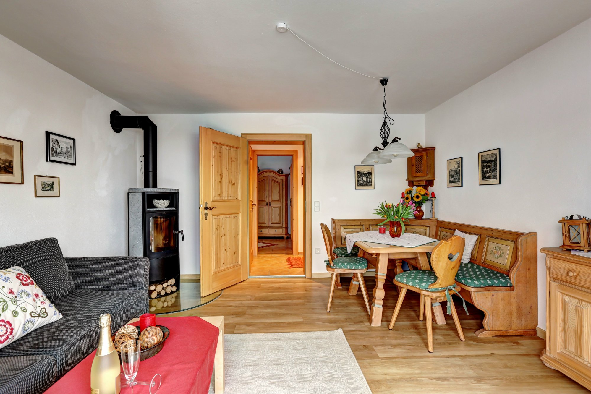 Die Ferienwohnung besteht aus einem Wohn-Schlafzimmer mit Eckbank, Schlafcouch, Flachbild-TV sowie Holzofen einer Wohnküche mit Esstisch inkl. 4 Stühlen und Einbauküche
