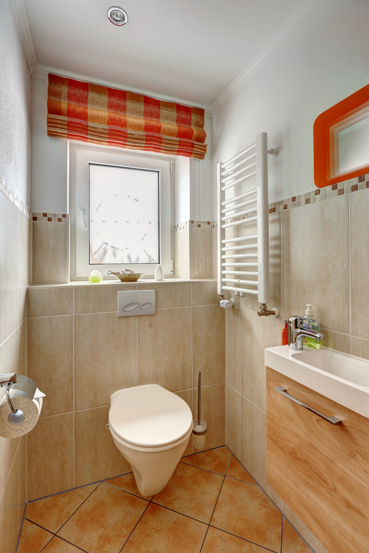 einem separatem WC, einer Terrasse mit Gartenmöbel und einem Vorraum mit Garderobe sowie Schreibtisch.