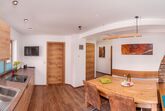 98qm. Das gesamte Erdgeschoß. 3 Schlafzimmer ( 2 x Doppelbetten, 1 x Zwei-Bett-Zimmer. 2 große Badezimmer, eines davon mit Bidet. Separate Toilette. Ein großes Wohnzimmer mit Elektro-Kachelofen. Ein großes Esszimmer mit TV. Eine komplett ausgestattete Küchenzeile mit Backofen, Geschirrspüler etc. Die Terrasse ist überdacht. Ein zusätzliches Babybett ist möglich.