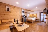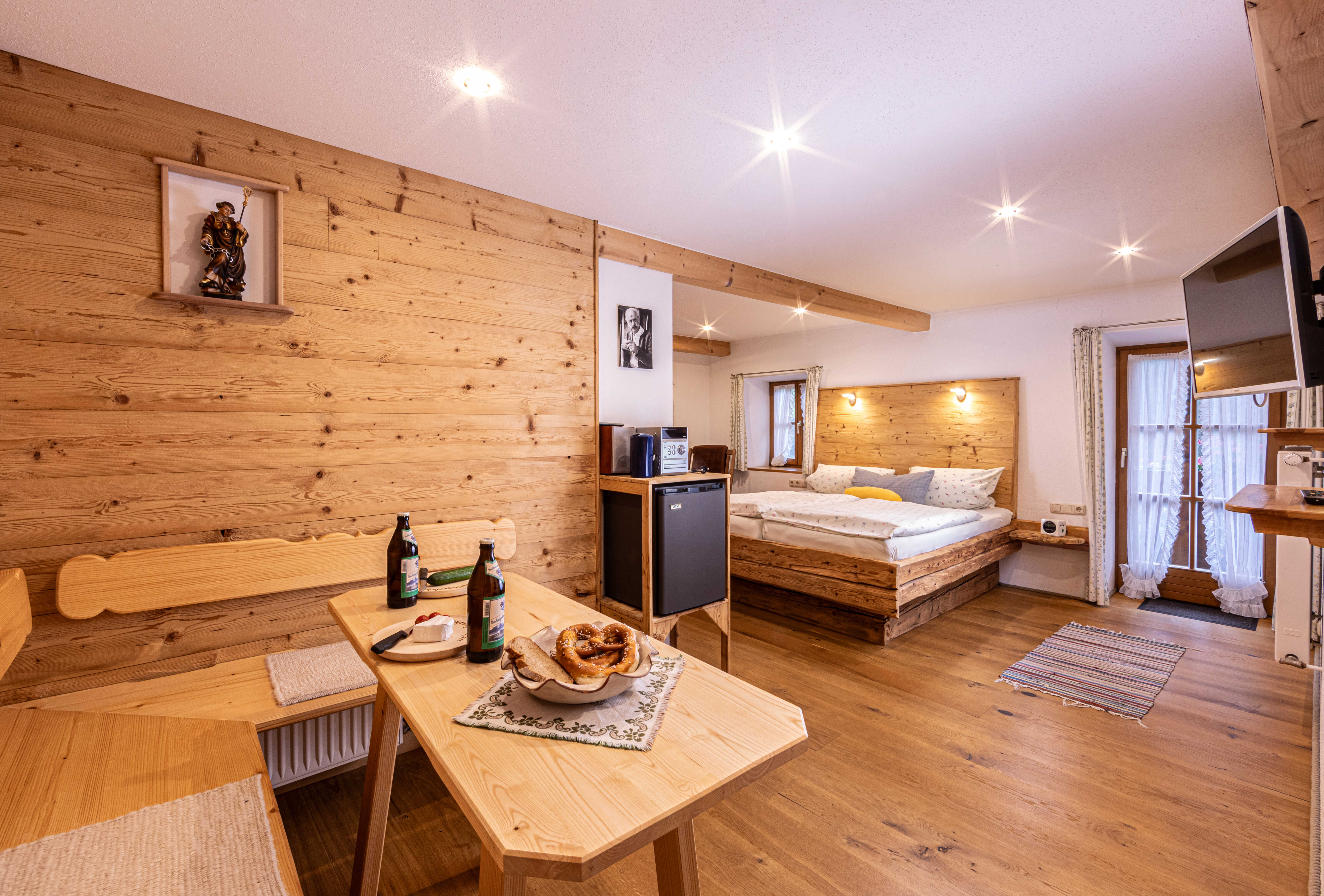 Großes Doppelzimmer, zum Süden gelegen; mit einem Doppelbett, Eckbank Kühlschrank, Wasserkocher und Holzboden ausgestattet.