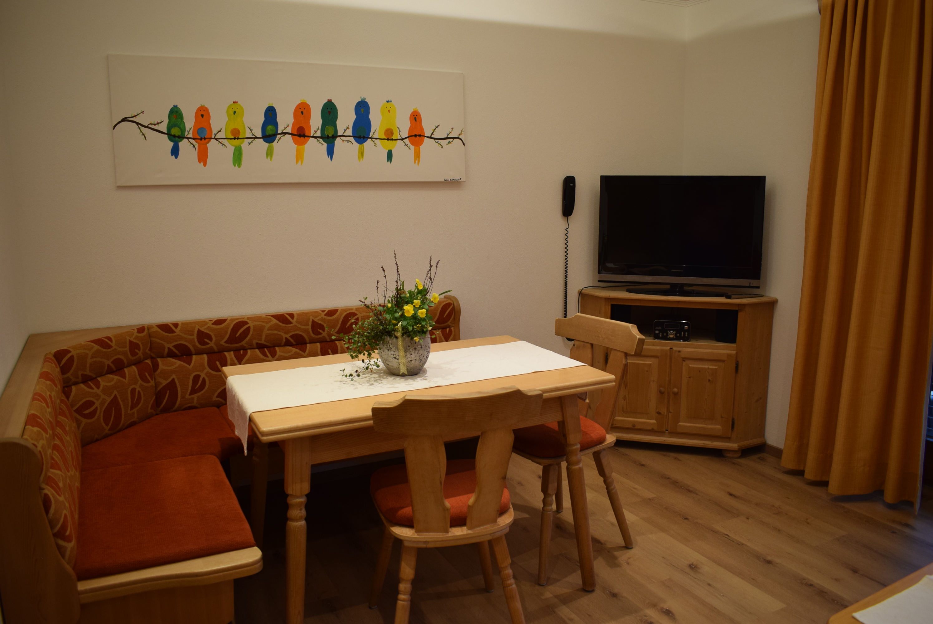 Unsere Ferienwohnung Kienberg ist im gemütlichen Landhausstil eingerichtet. Die Einbauküche verfügt über Geschirrspüler, 4 Kochplatten, Mikrowelle und Kühlschrank mit Gefrierfach. Die Schlafcouch im Wohnbereich dient der 3. und 4. Person als Bett. Der grosse Südbalkon mit herrlichem Bergblick wird Sie ebenso begeistern wie unsere ruhige Lage.